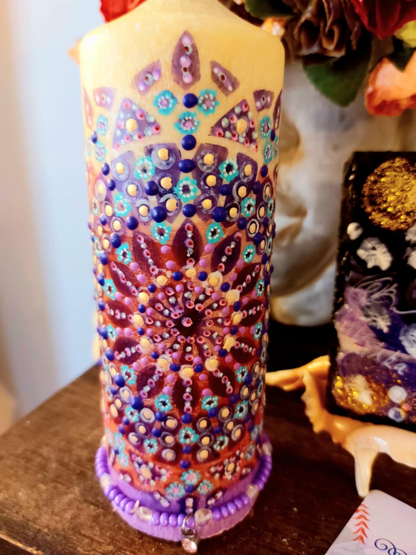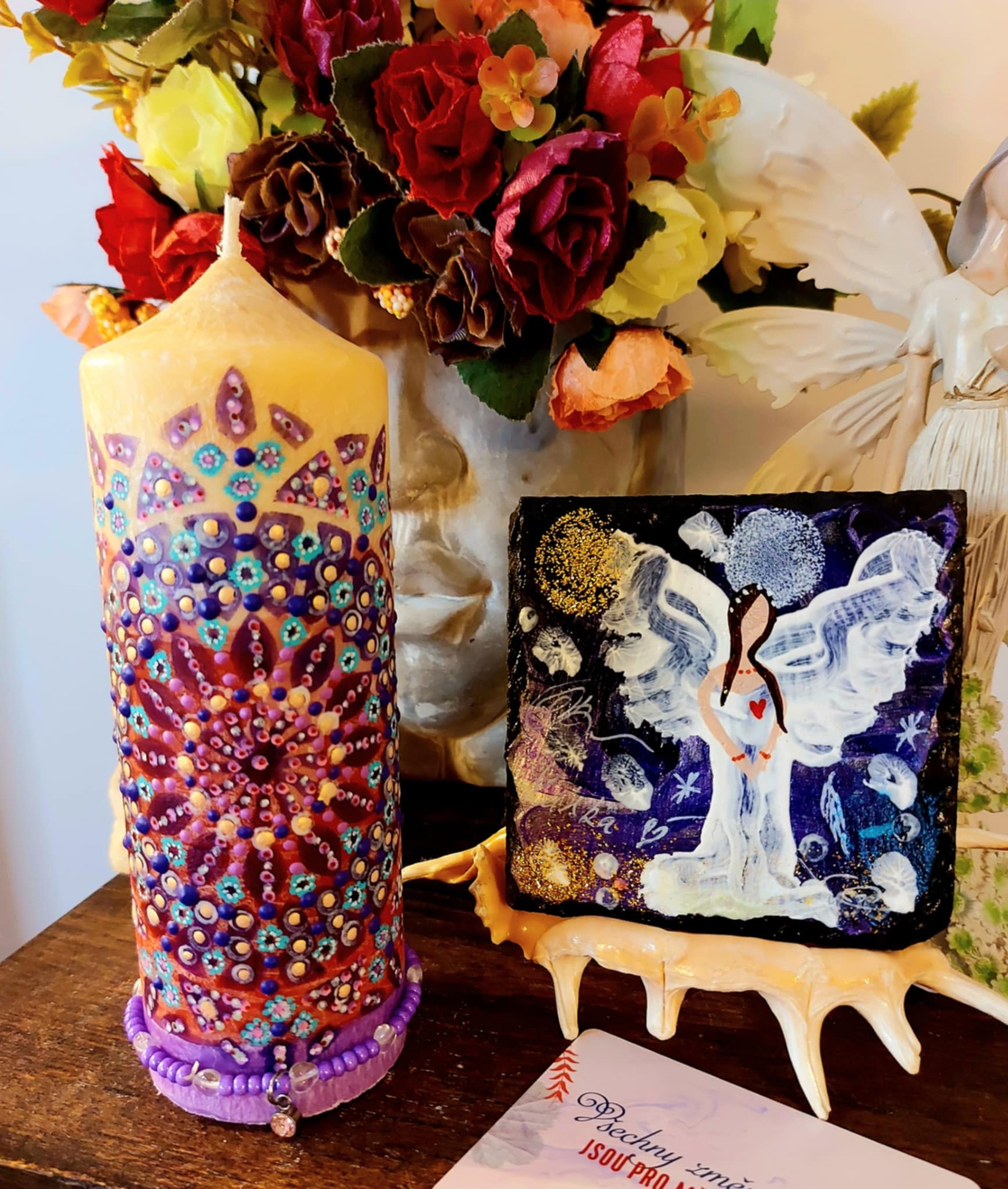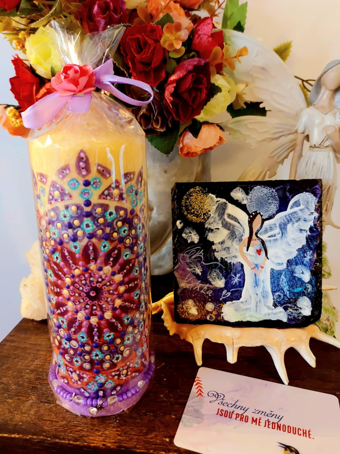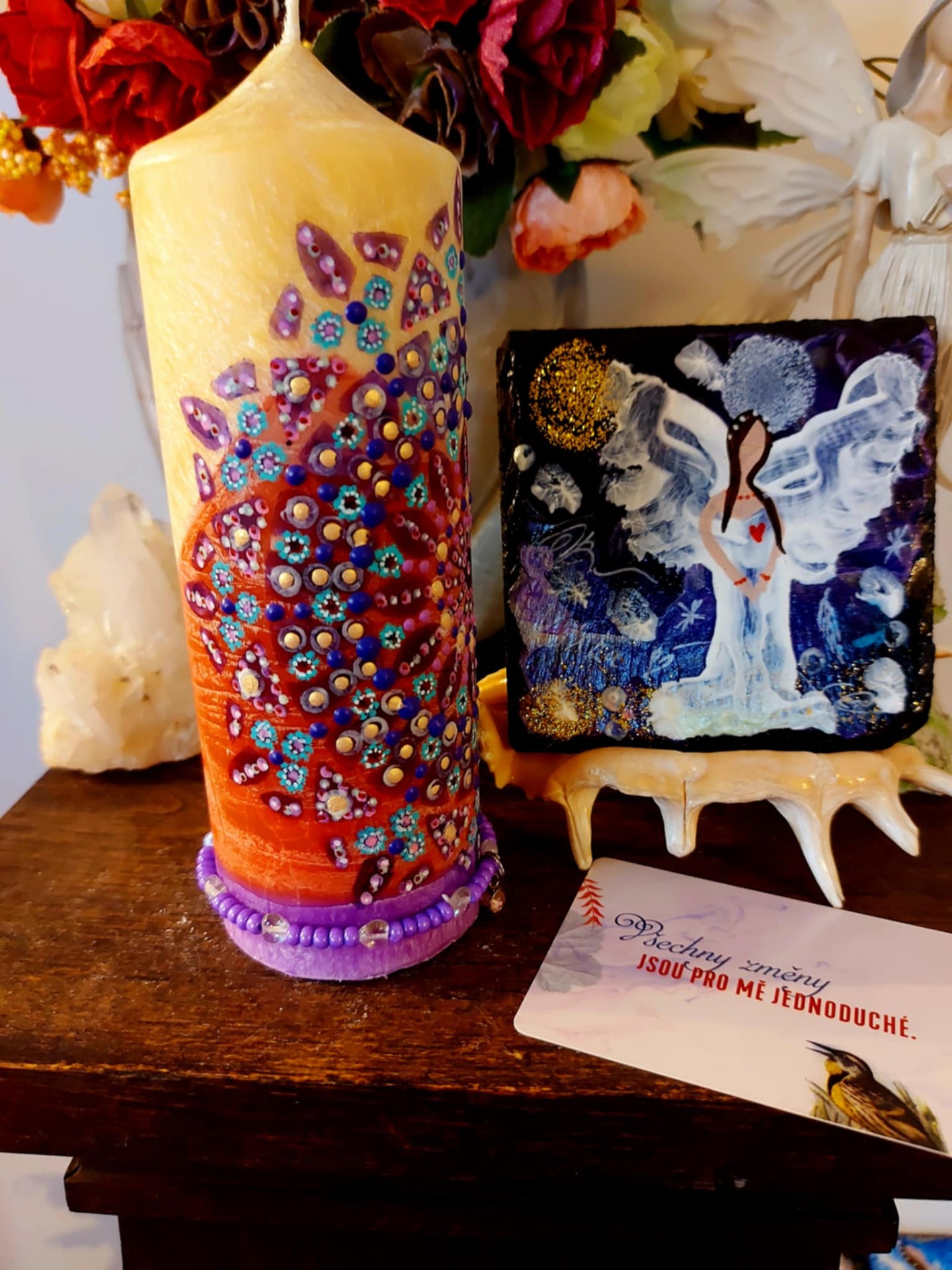 Minerál vložený do spodu svíčky projasňuje mysl, zvyšuje sebevědomí, přináší novou energií, zklidňuje. Podporuje trpělivost, moudrost a dokonalost. Pomáhá se sebezdokonalováním, samostatností, vytrvalostí. Zesiluje energii svíčky, Uvolňuje ji a reguluje, aby bylo dosaženo harmonie Palmový krystalický vosk 370 g, 16/6 cm, malba na svíčku akryl a tekuté perly.. Podložka břidlice a akryl, Minerál ve svíčce,, esence divokých květů, Bachovy esence. Náramek posvátného záměru doporučuji nosit po celou dobu procesu.