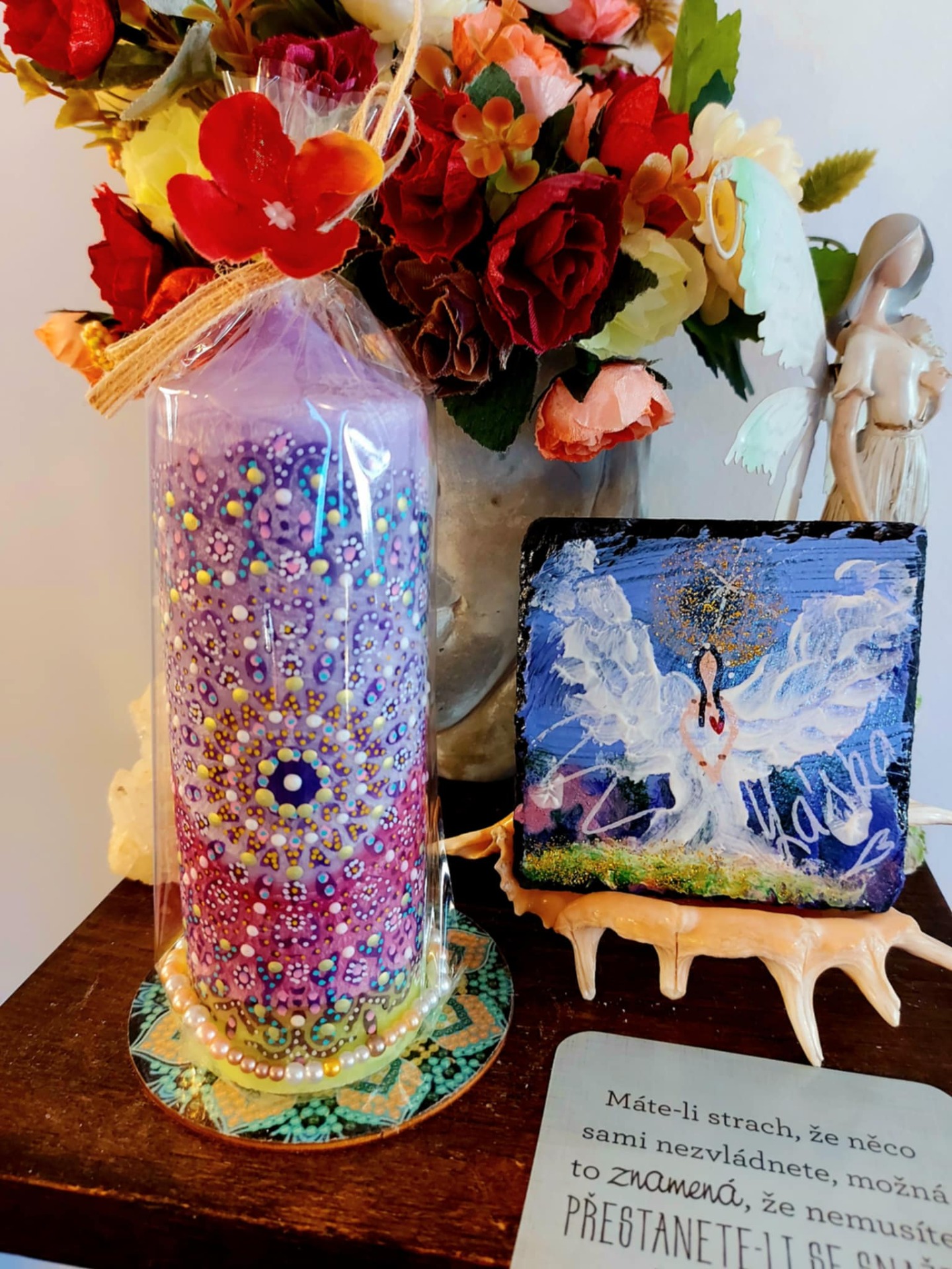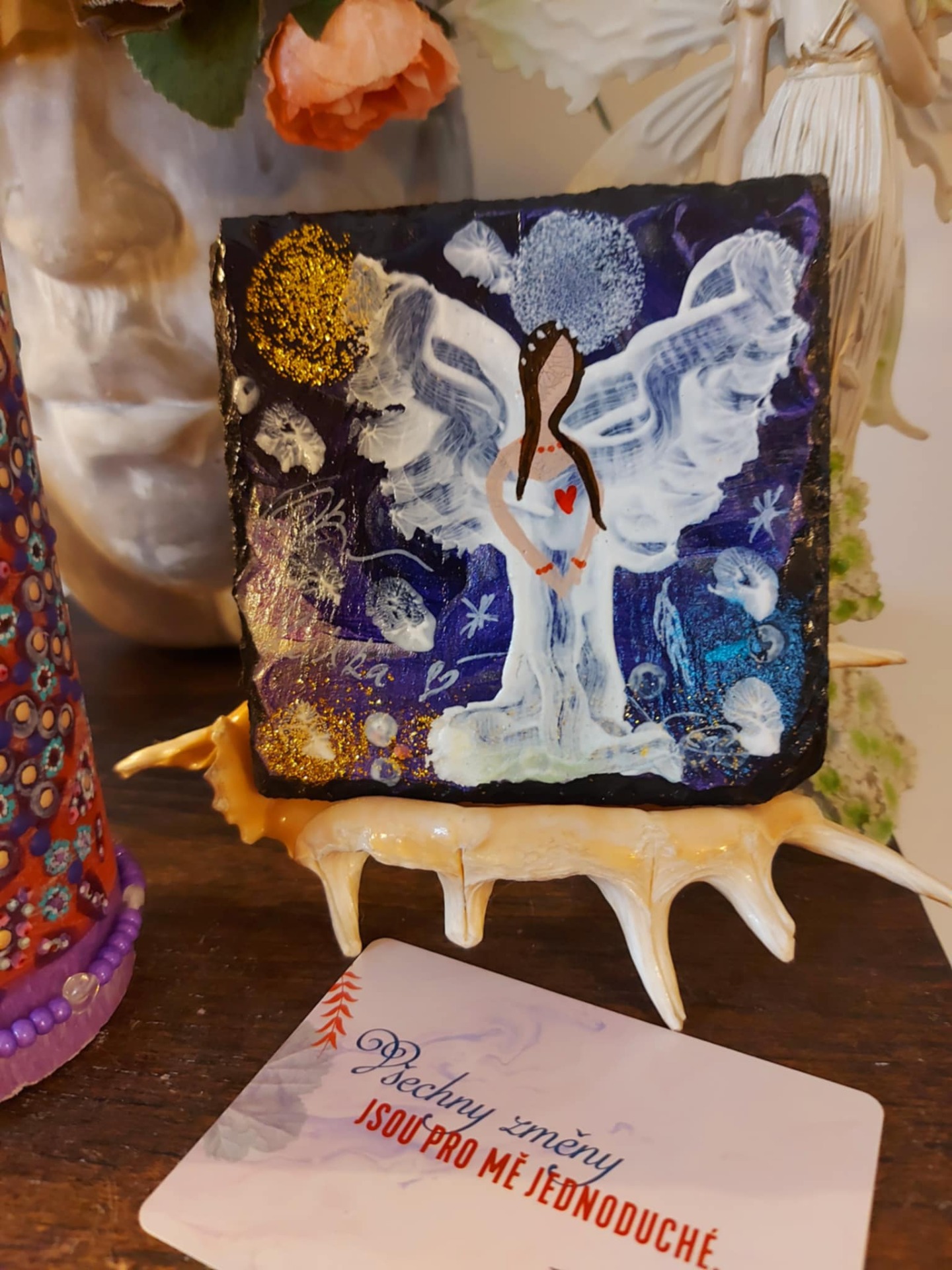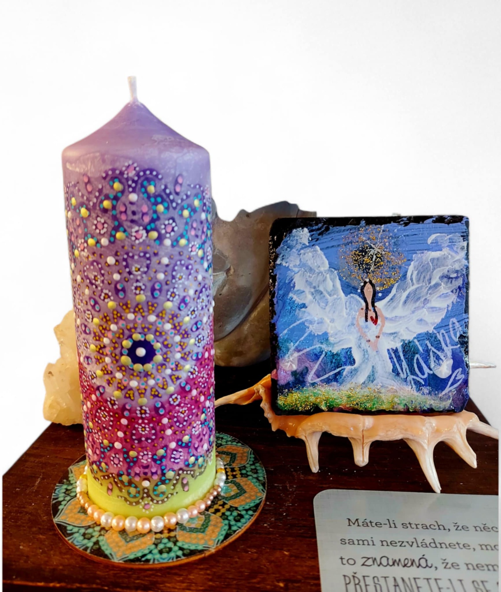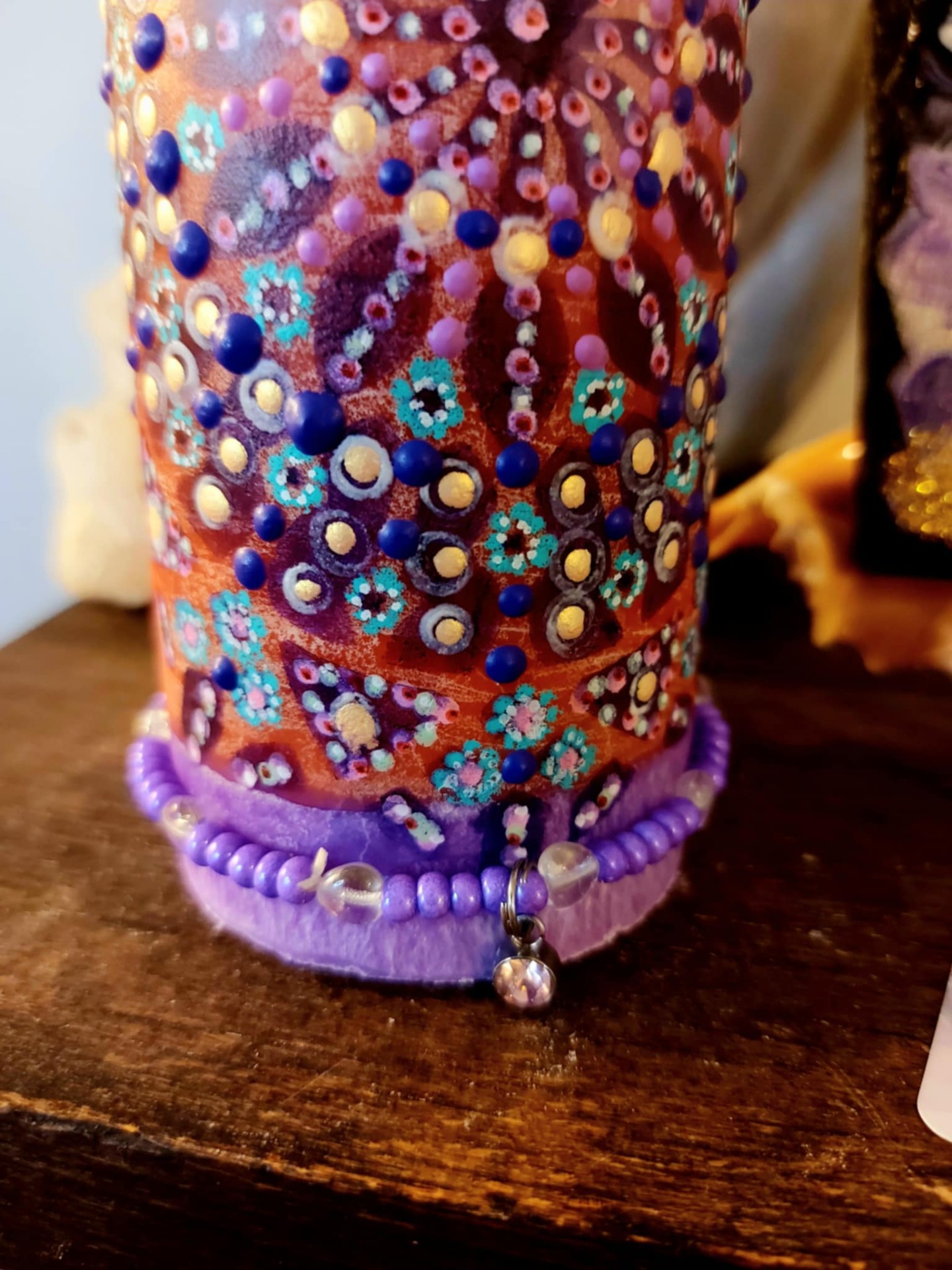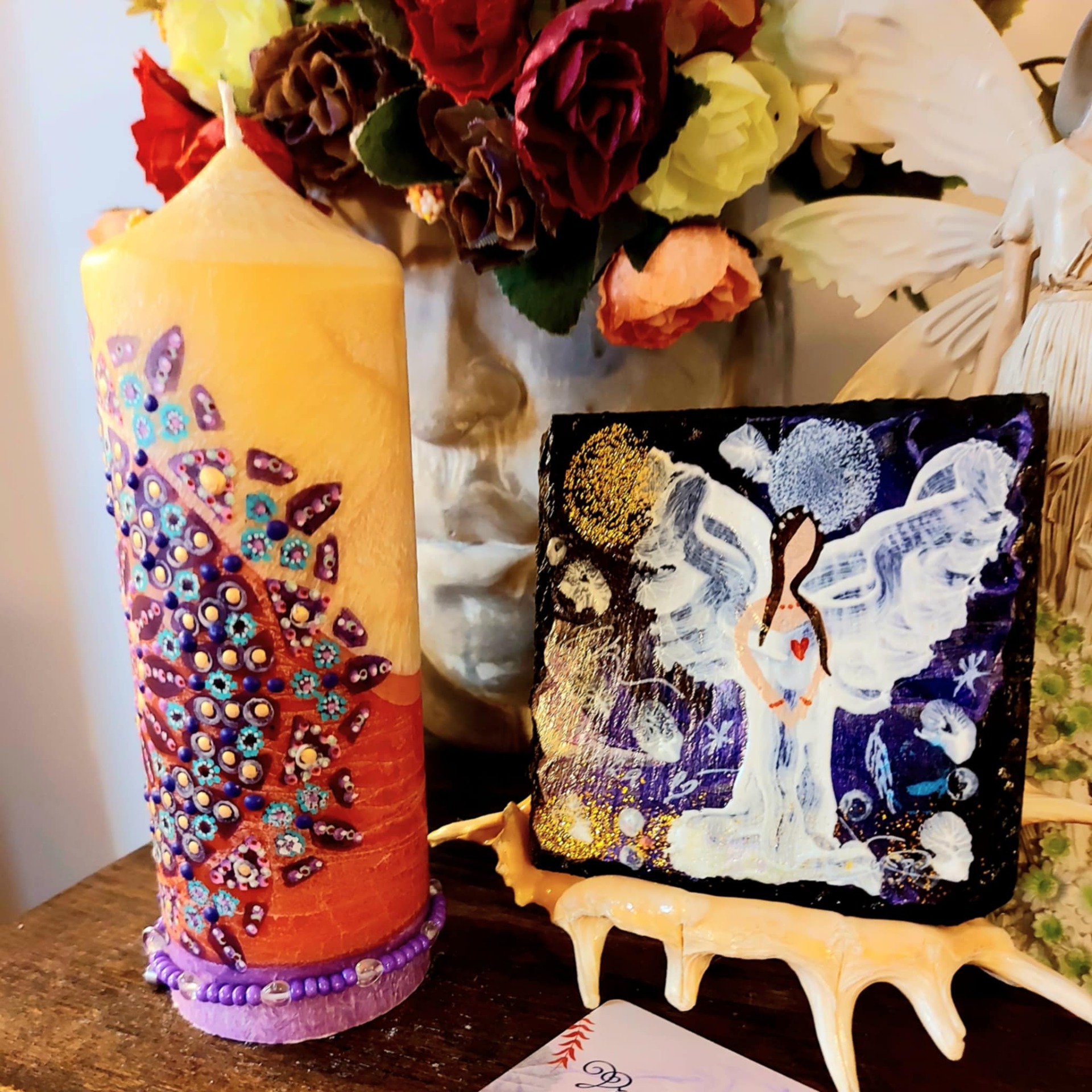Minerál vložený do spodu svíčky projasňuje mysl, zvyšuje sebevědomí, přináší novou energií, zklidňuje. Podporuje trpělivost, moudrost a dokonalost. Pomáhá se sebezdokonalováním, samostatností, vytrvalostí. Zesiluje energii svíčky, Uvolňuje ji a reguluje, aby bylo dosaženo harmonie Palmový krystalický vosk 370 g, 16/6 cm, malba na svíčku akryl a tekuté perly.. Podložka břidlice a akryl, Minerál ve svíčce,, esence divokých květů, Bachovy esence. Náramek posvátného záměru doporučuji nosit po celou dobu procesu.