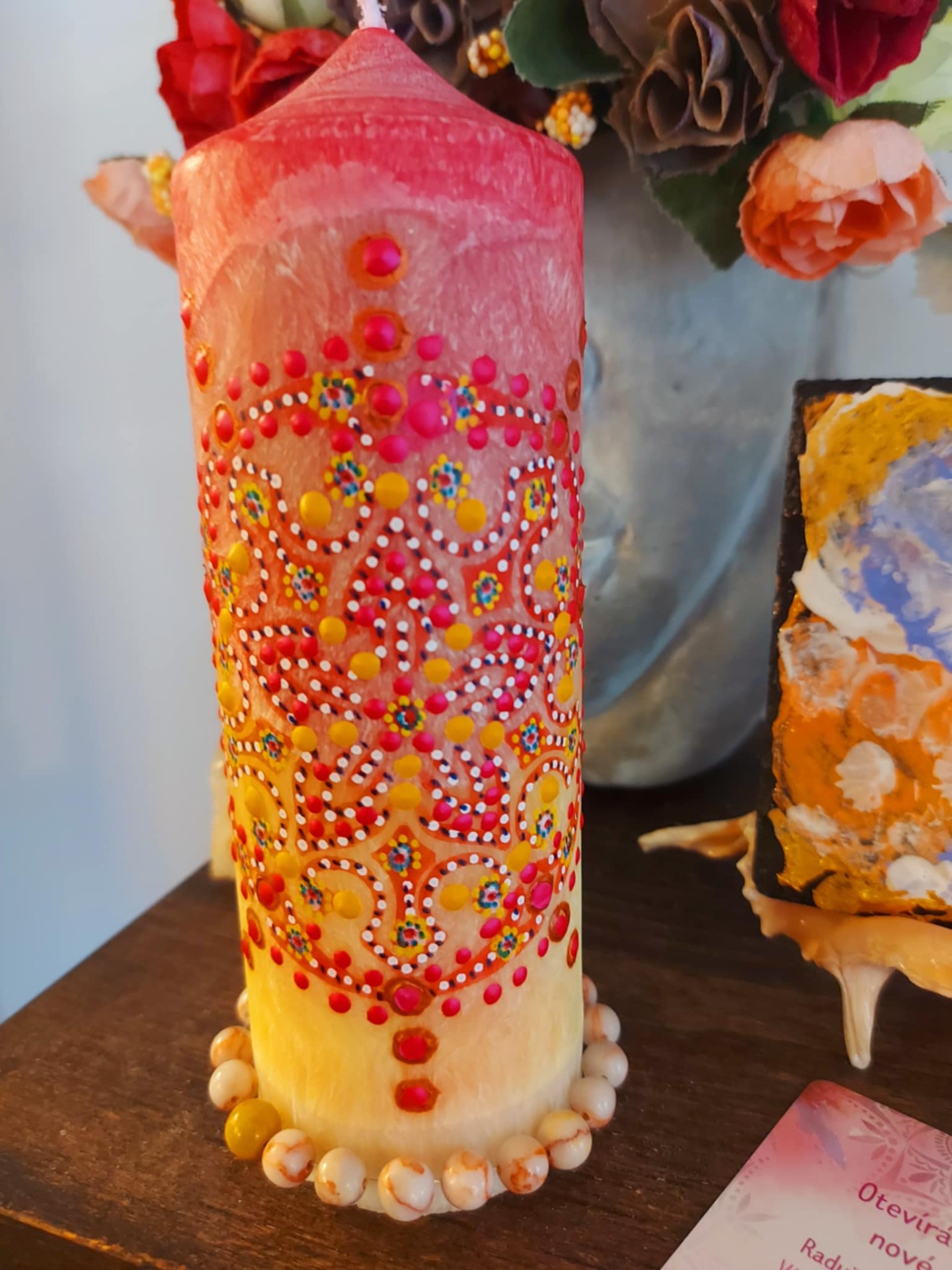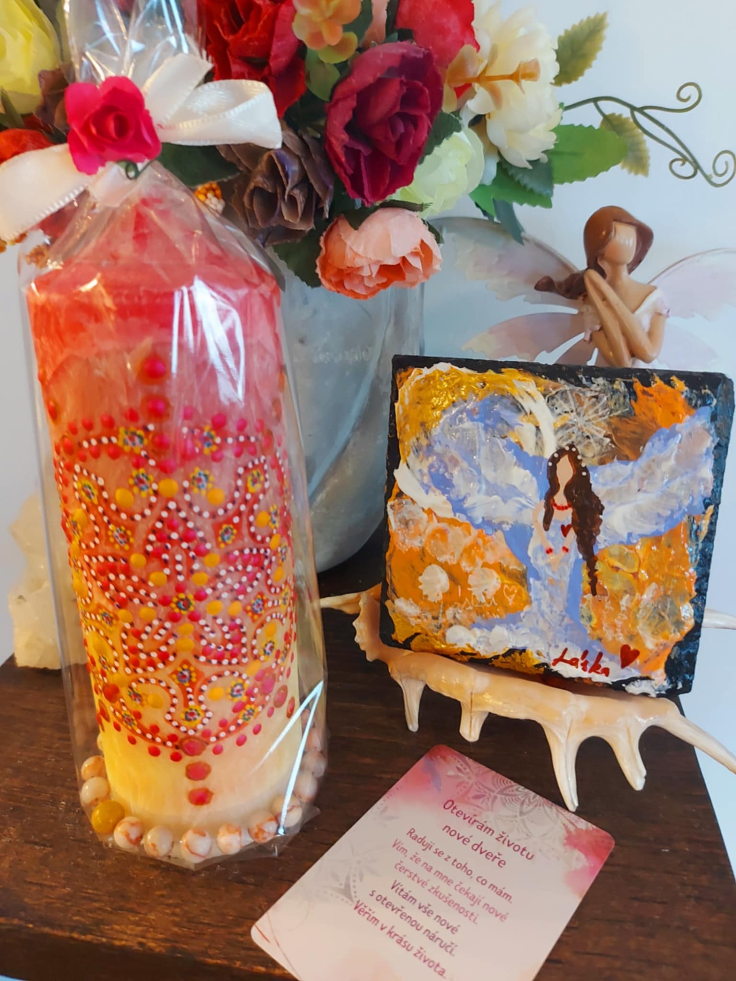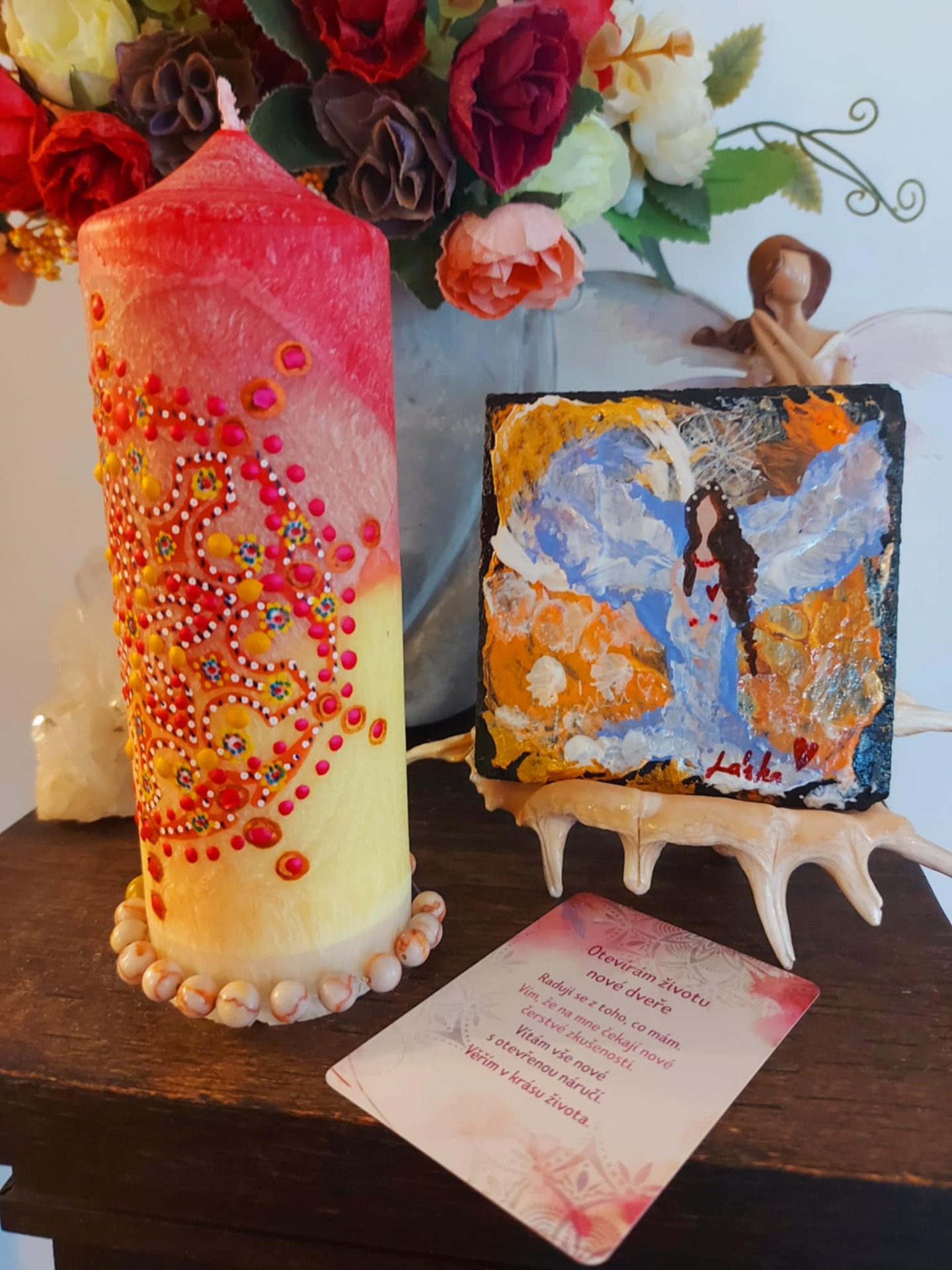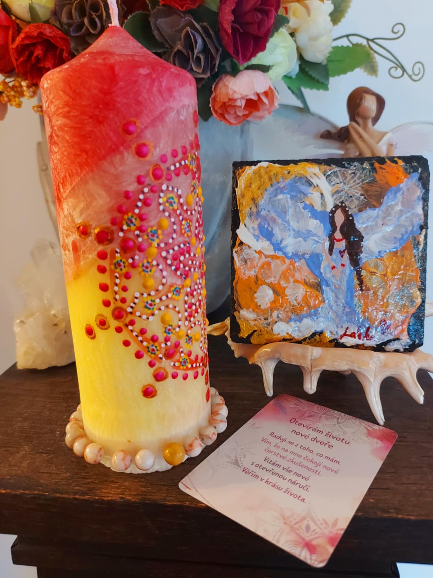Minerál vložený do spodu svíčky projasňuje mysl, zvyšuje sebevědomí, přináší novou energií, zklidňuje. Podporuje trpělivost, moudrost a dokonalost. Pomáhá se sebezdokonalováním, samostatností, vytrvalostí. Zesiluje energii svíčky, Uvolňuje ji a reguluje, aby bylo dosaženo harmonie Palmový krystalický vosk 370 g, 16/6 cm, malba na svíčku akryl a tekuté perly.. Podložka břidlice a akryl, Minerál ve svíčce,, esence divokých květů, Bachovy esence.