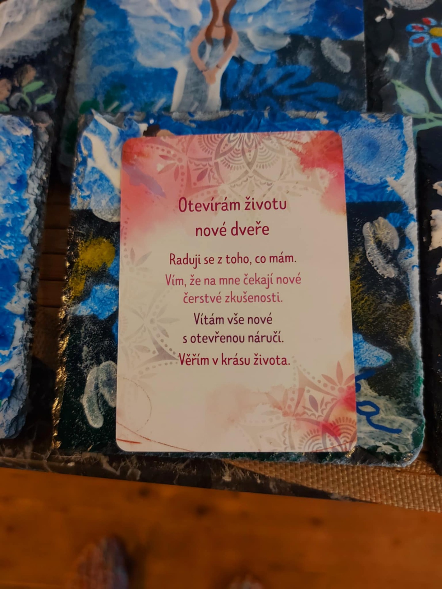 Afirmace- Jsem v naprostém souladu s Božím záměrem. Mé vědomí se rozšiřuje a přijímá. Odpouštím a je mi odpuštěno. Každý okamžik mne naplňuje klidem, světlem a láskou. Děkuji.