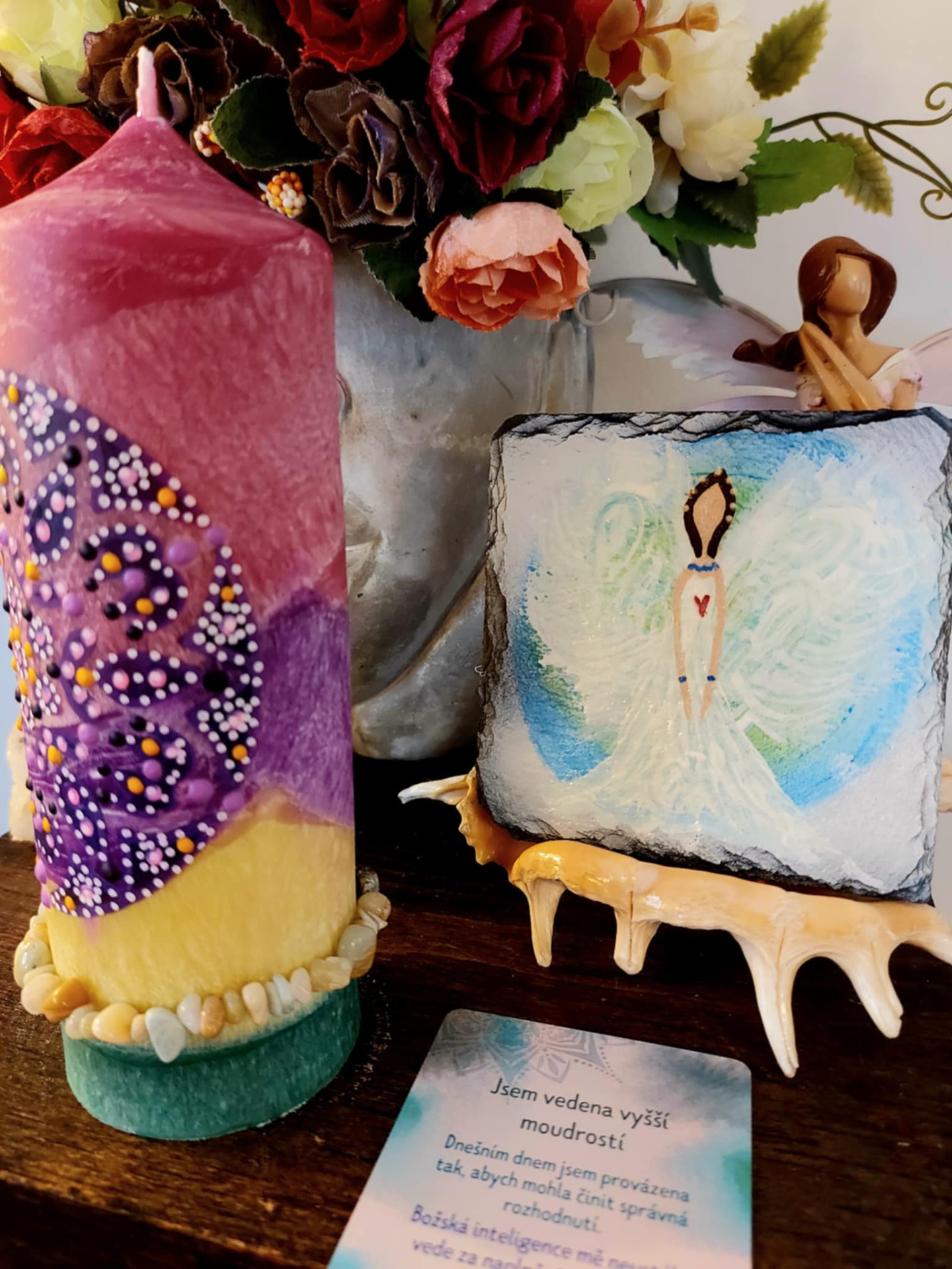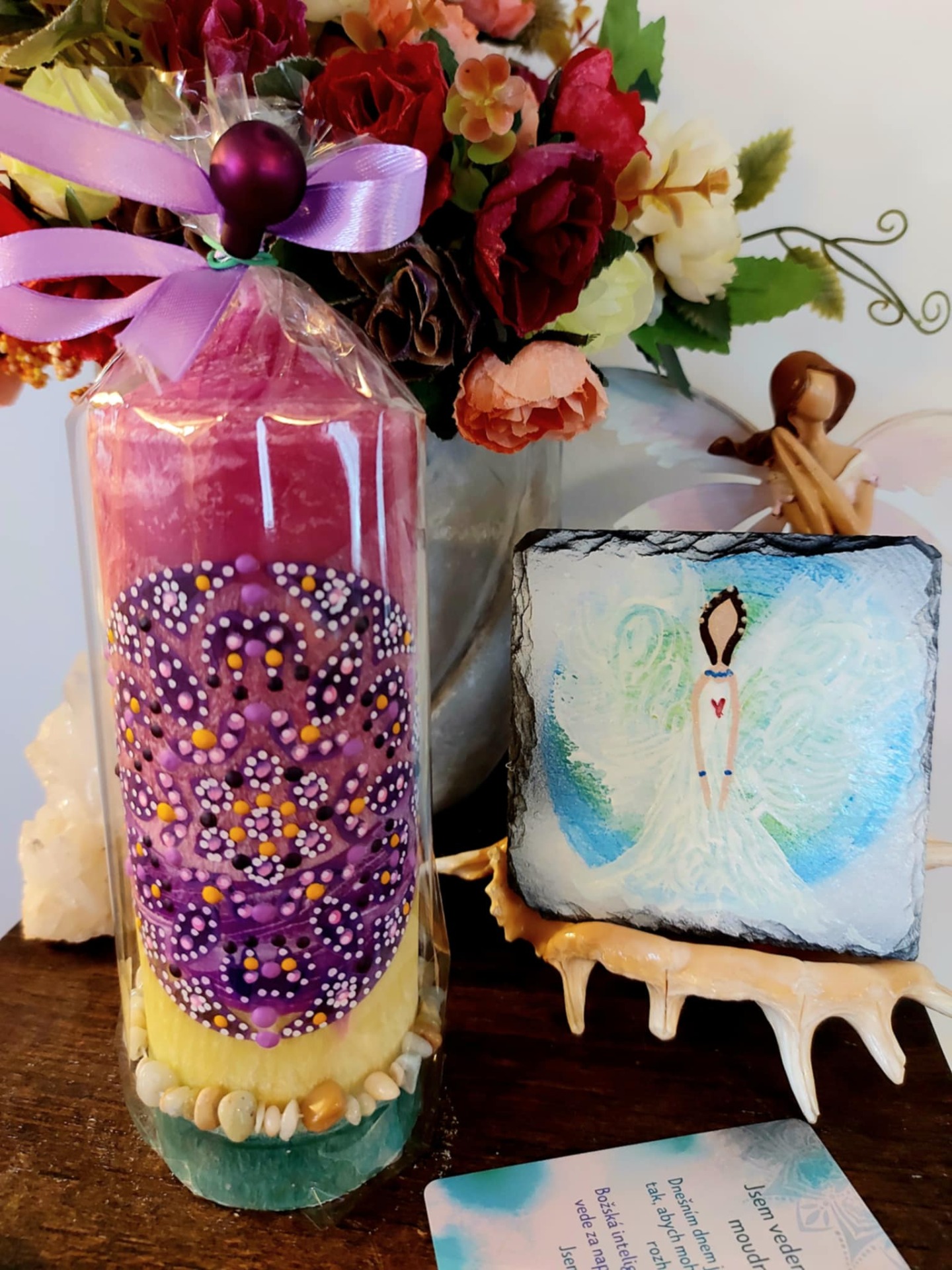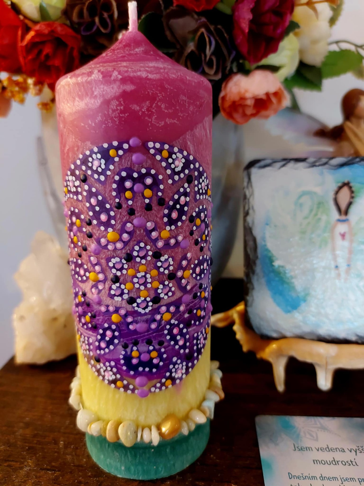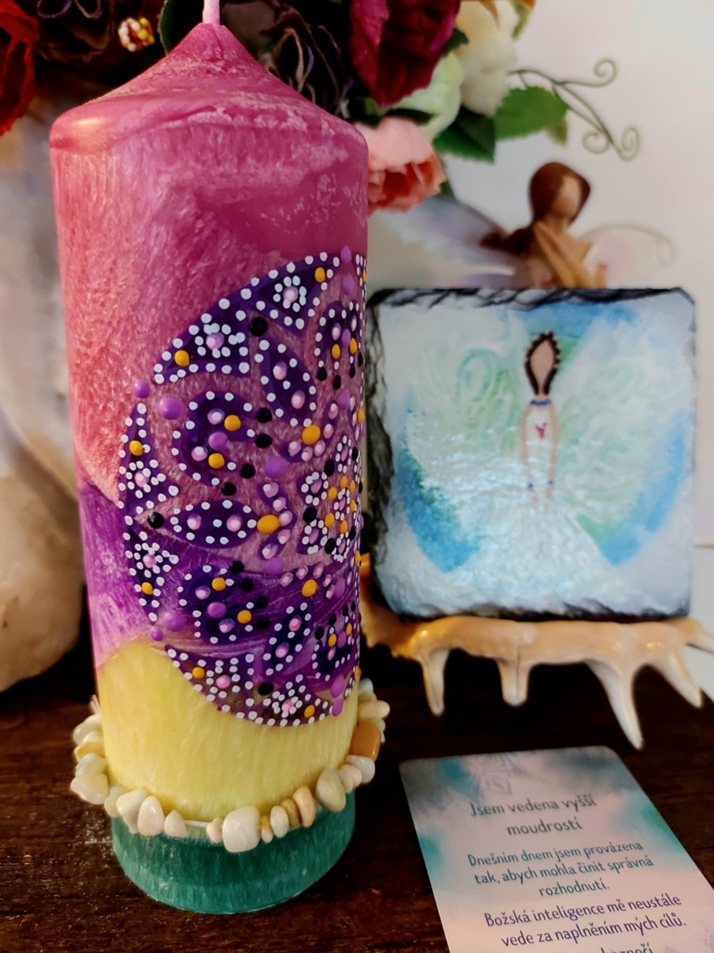 Minerál vložený do spodu svíčky projasňuje mysl, zvyšuje sebevědomí, přináší novou energií, zklidňuje. Podporuje trpělivost, moudrost a dokonalost. Pomáhá se sebezdokonalováním, samostatností, vytrvalostí. Zesiluje energii svíčky, Uvolňuje ji a reguluje, aby bylo dosaženo harmonie Palmový krystalický vosk 370 g, 16/6 cm, malba na svíčku akryl a tekuté perly. Podložka břidlice a akryl, Minerál ve svíčce,, esence divokých květů, Bachovy esence. Náramek posvátného záměru, pokud je součástí, doporučuji nosit po celou dobu procesu.