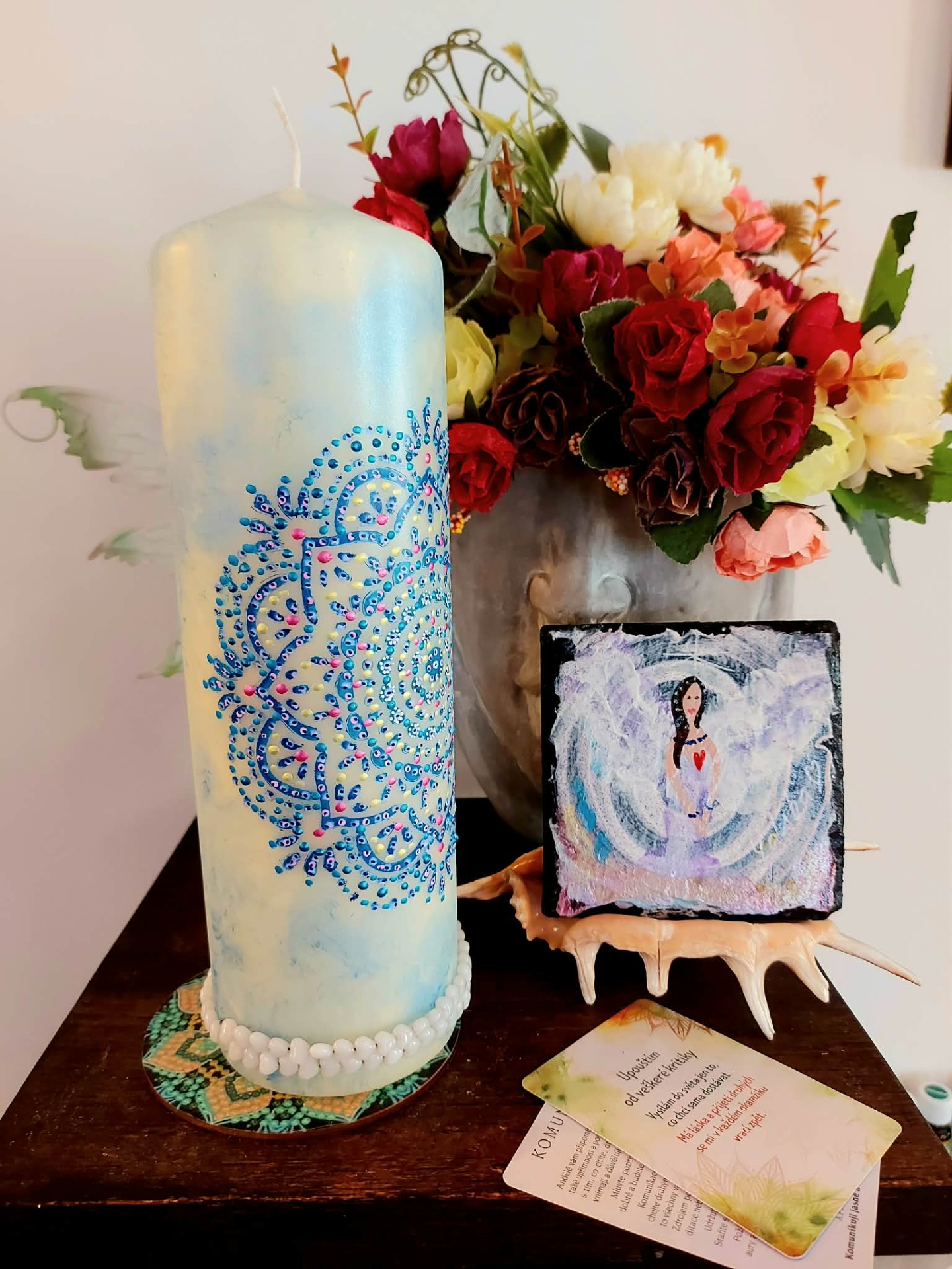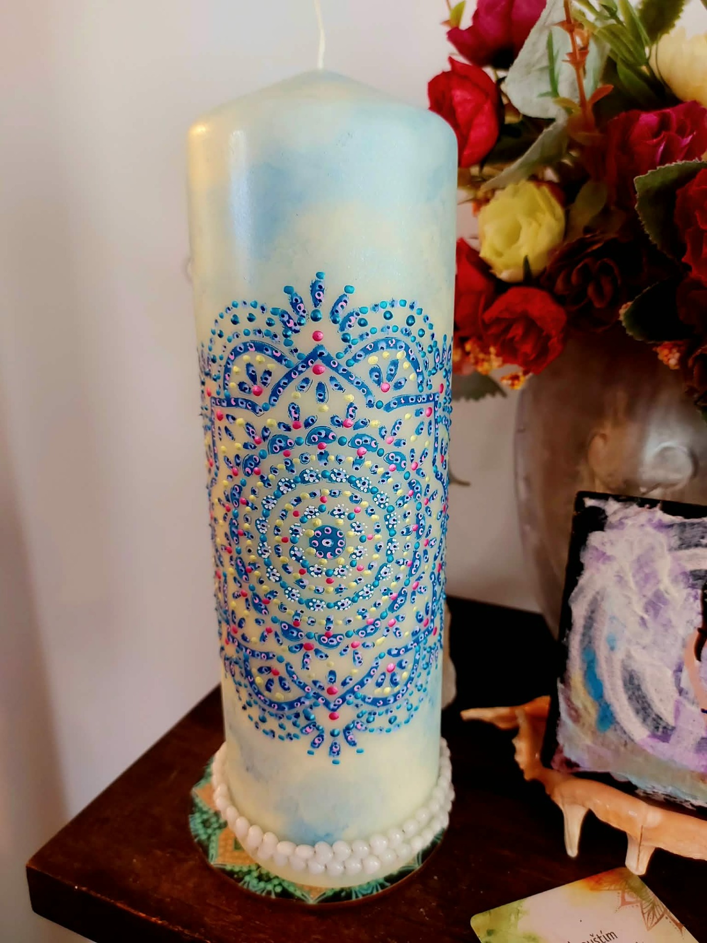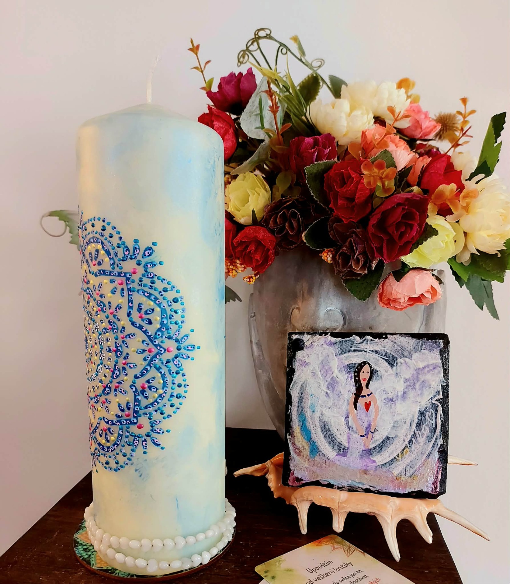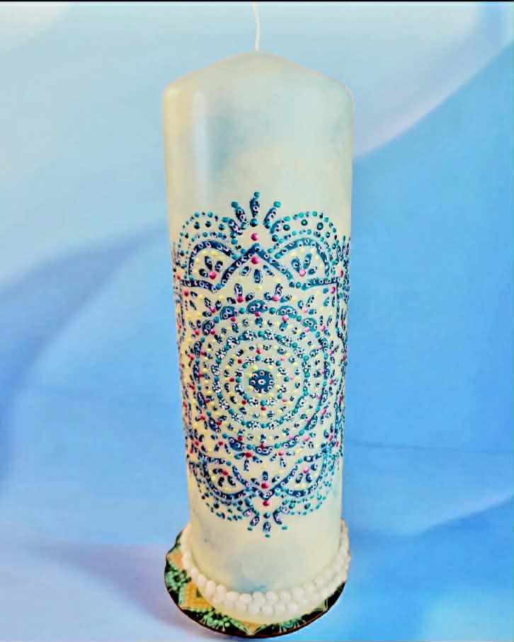 Naladění na prostor a ticho Zapal svíčku. Dovol světlu, aby se rozprostřelo kolem tebe. Vnímej dech takový, jaký právě je. Vnímej, v jakém vnitřním prostoru se právě nacházíš. Tělo se usazuje. Pozornost se zjemňuje. Jsi tady a teď. Prostor kolem tebe se otevírá. Prostor v tobě se pomocí dechu rozšiřuje. Myšlenky nechej plynout. Pocity nech být přítomné. Všechno má své místo. Parafín, 940 g, 22/8 cm, malba na svíčku akryl a tekuté perly, náramek , podložka břidlice , akryl.