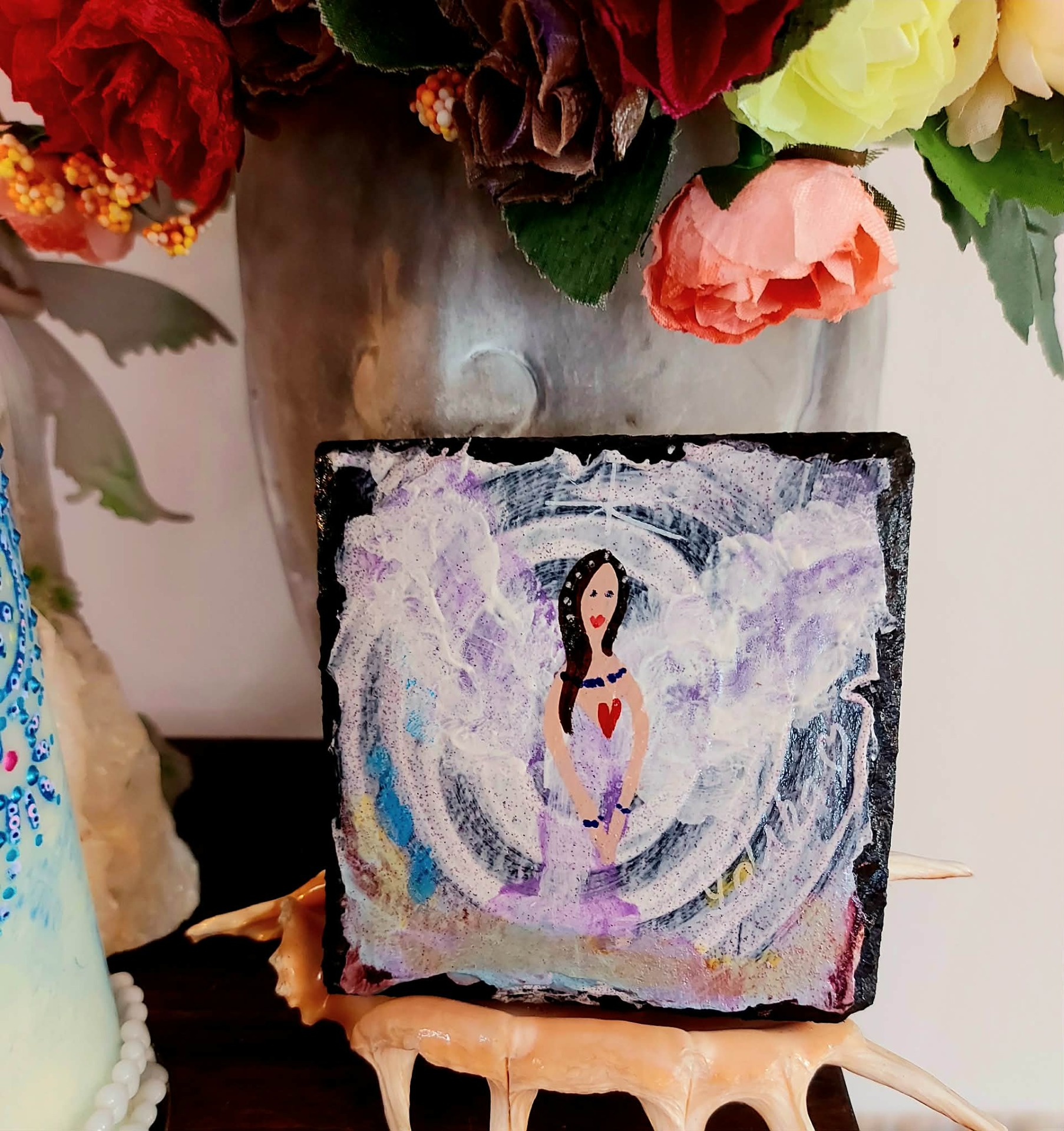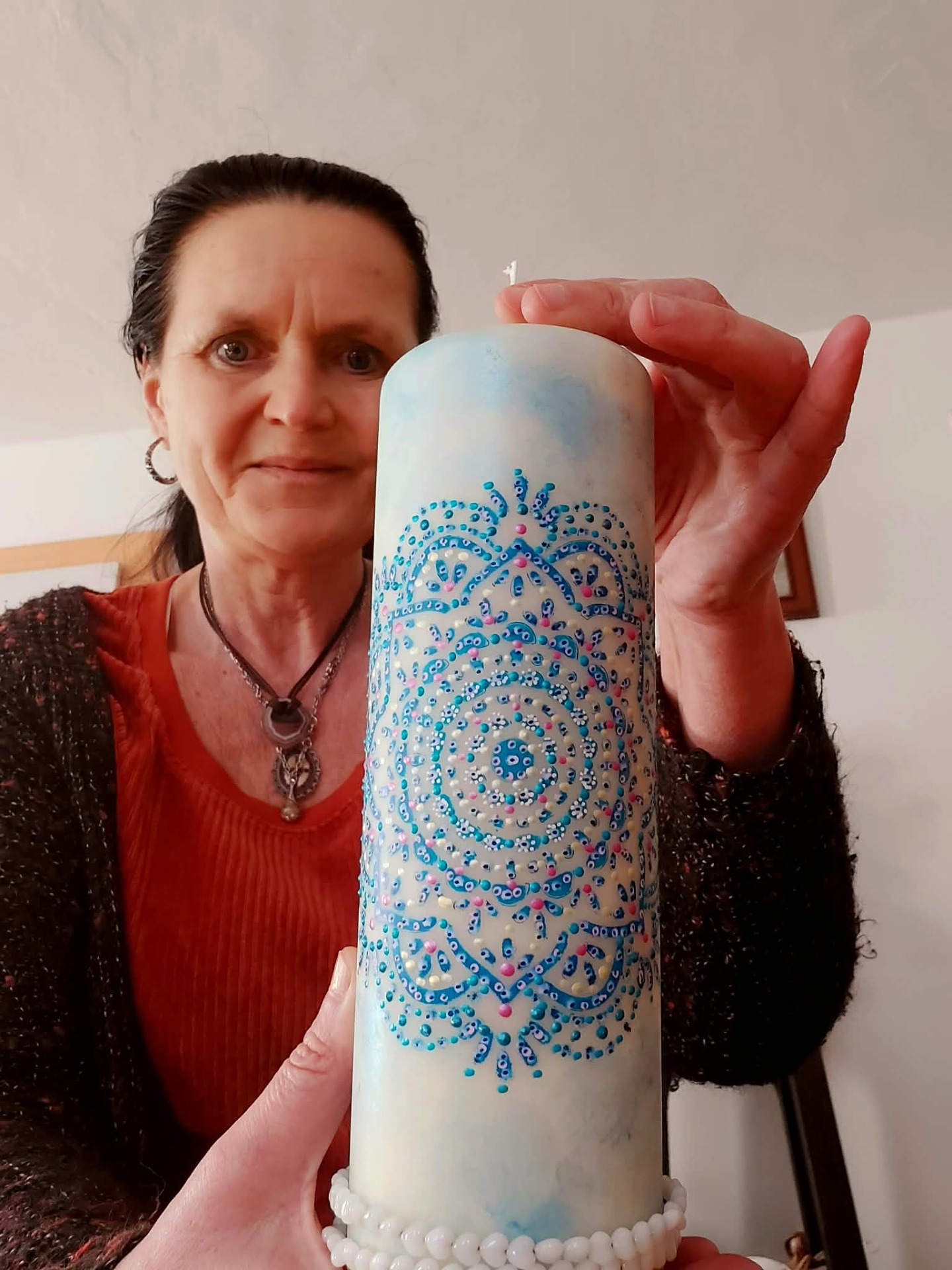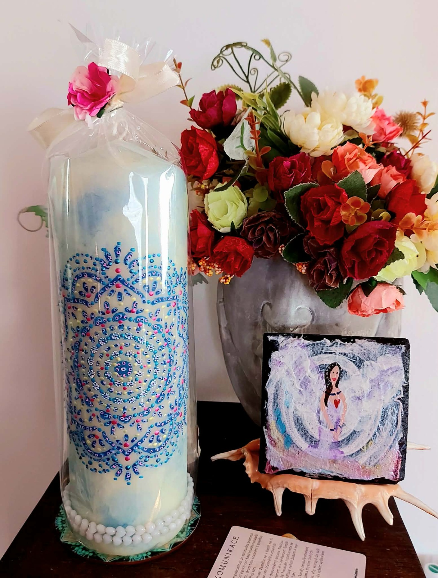 Naladění na prostor a ticho Zapal svíčku. Dovol světlu, aby se rozprostřelo kolem tebe. Vnímej dech takový, jaký právě je. Vnímej, v jakém vnitřním prostoru se právě nacházíš. Tělo se usazuje. Pozornost se zjemňuje. Jsi tady a teď. Prostor kolem tebe se otevírá. Prostor v tobě se pomocí dechu rozšiřuje. Myšlenky nechej plynout. Pocity nech být přítomné. Všechno má své místo. Parafín, 940 g, 22/8 cm, malba na svíčku akryl a tekuté perly, náramek , podložka břidlice , akryl.