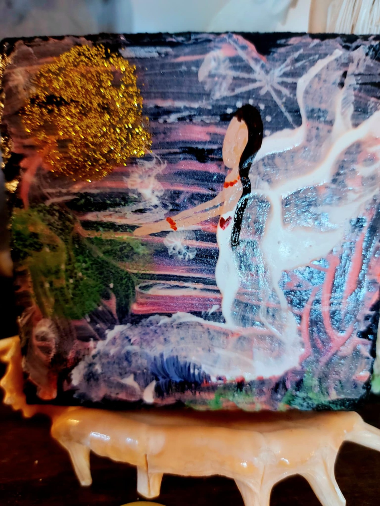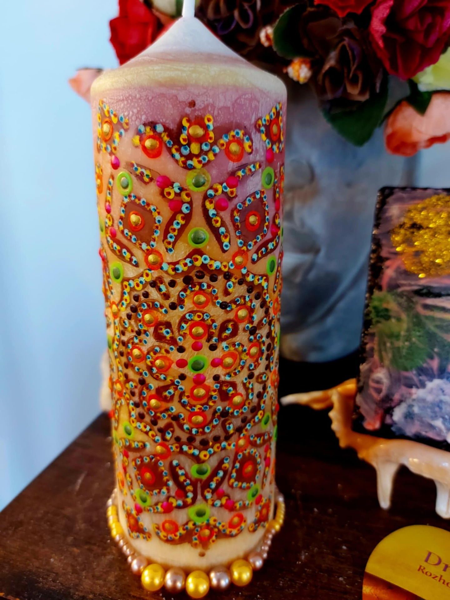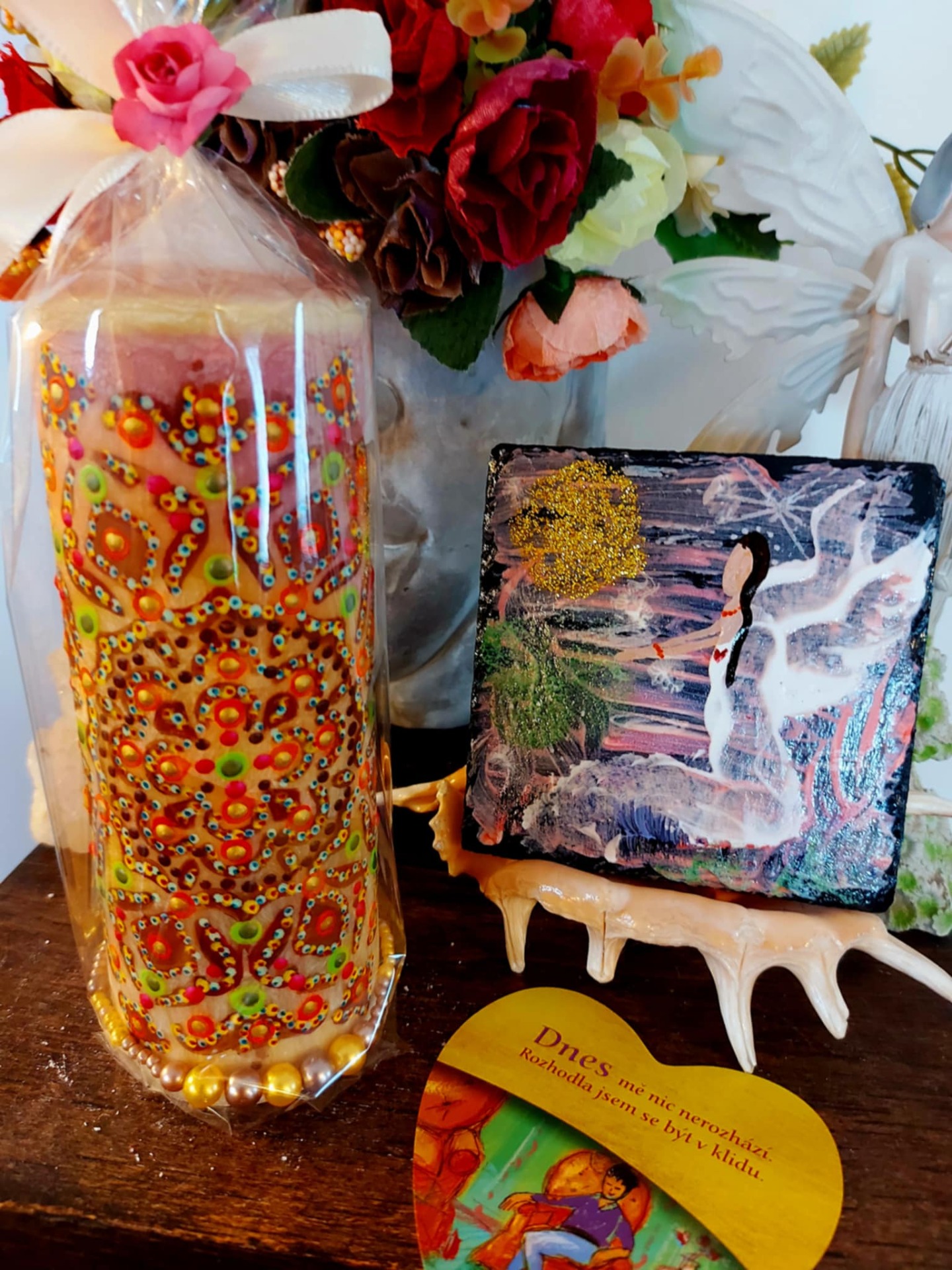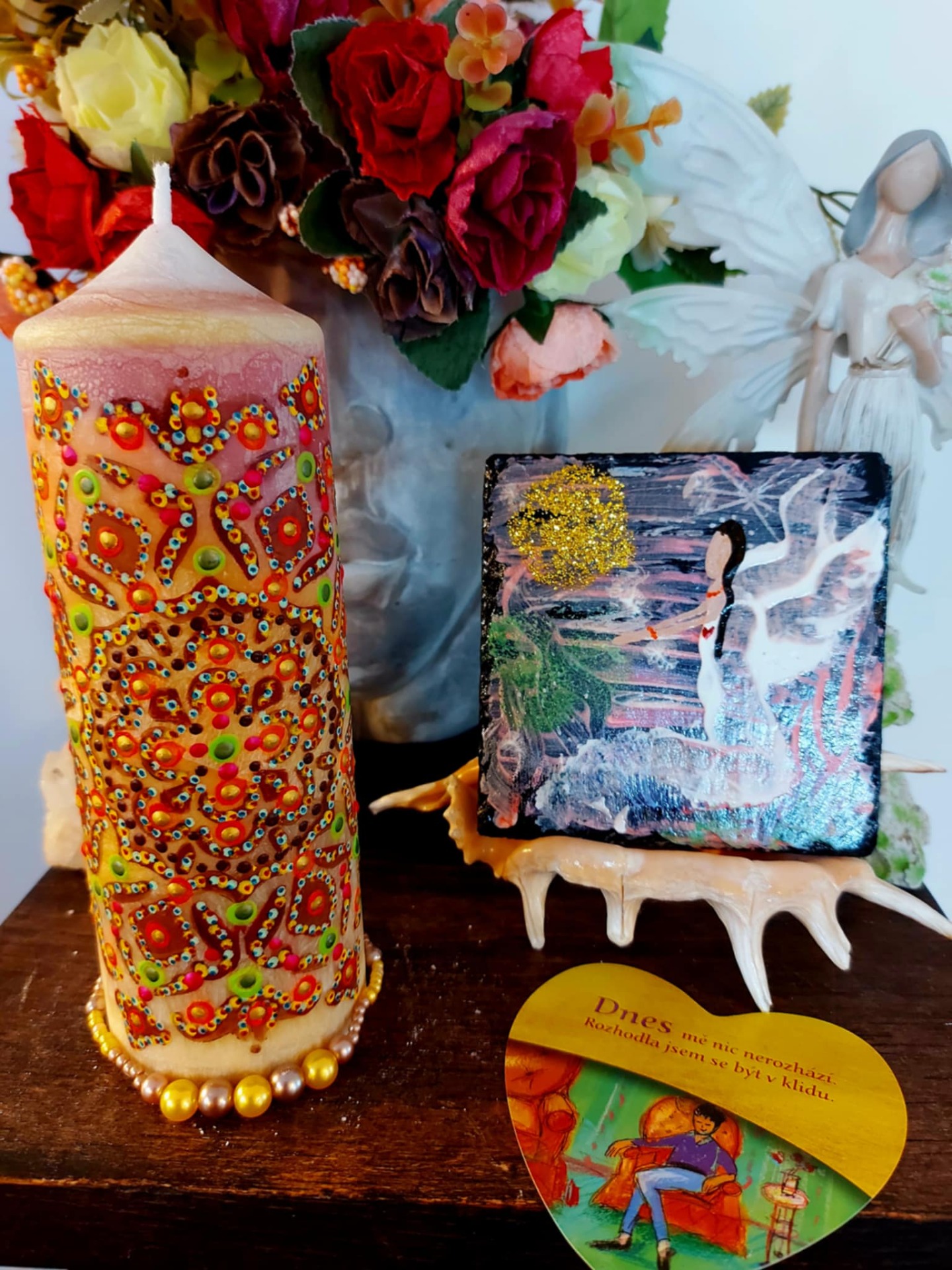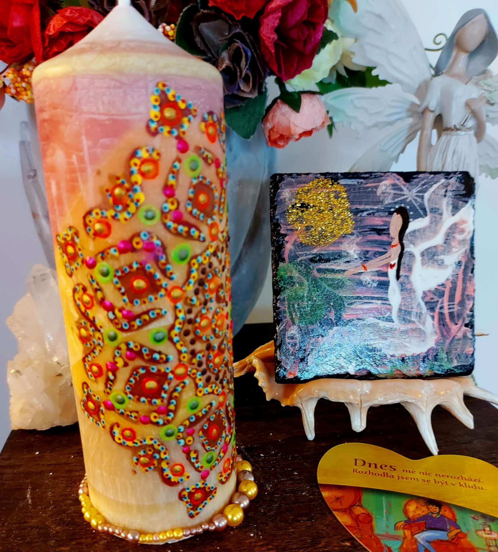 .Minerál vložený do spodu svíčky projasňuje mysl, zvyšuje sebevědomí, přináší novou energií, zklidňuje. Podporuje trpělivost, moudrost a dokonalost. Pomáhá se sebezdokonalováním, samostatností, vytrvalostí. Zesiluje energii svíčky, Uvolňuje ji a reguluje, aby bylo dosaženo harmonie Palmový krystalický vosk 370 g, 16/6 cm, malba na svíčku akryl a tekuté perly.. Podložka břidlice a akryl, Minerál ve svíčce,, esence divokých květů, Bachovy esence. Náramek posvátného záměru doporučuji nosit po celou dobu procesu.