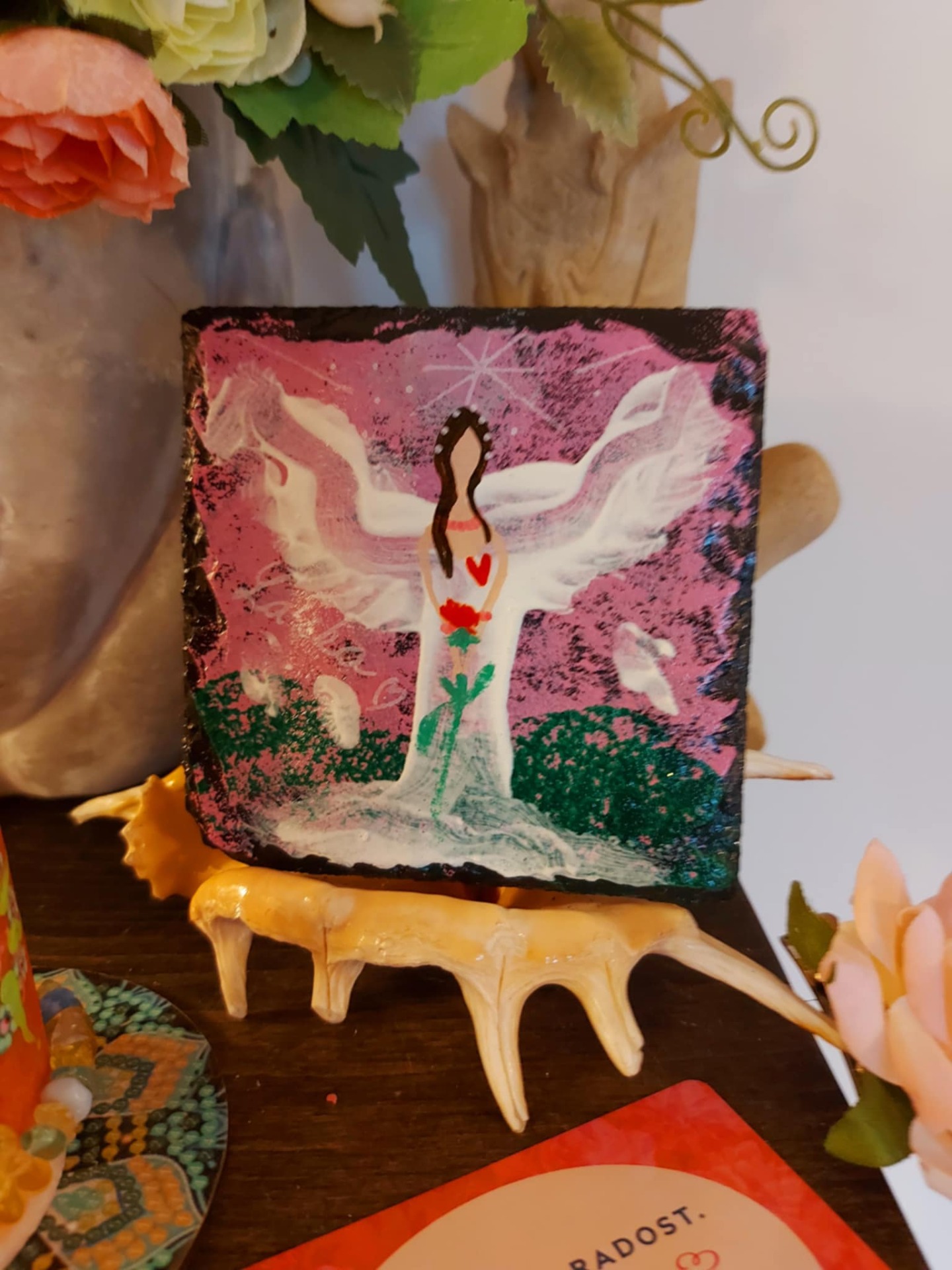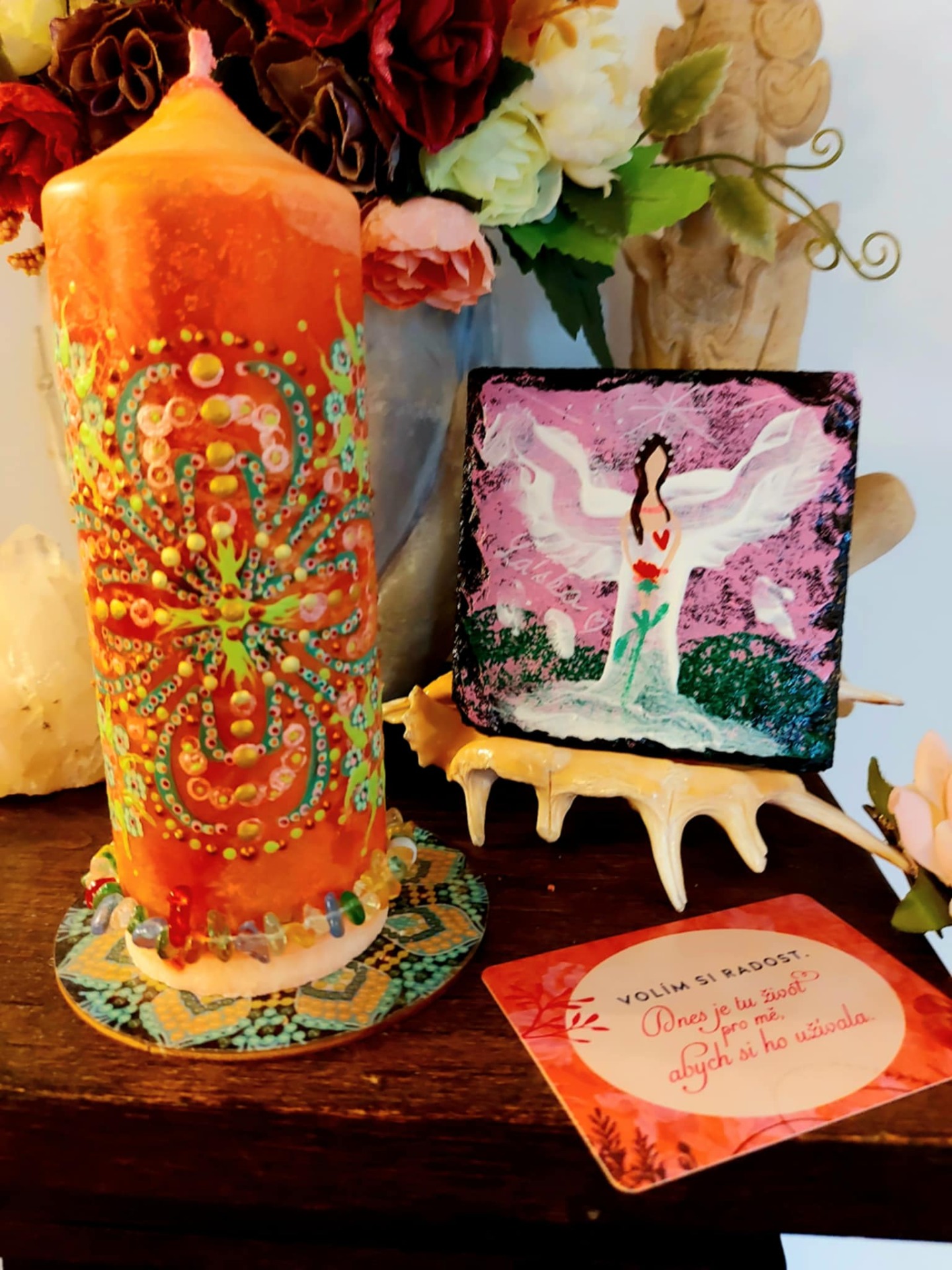 Minerál vložený do spodu svíčky projasňuje mysl, zvyšuje sebevědomí, přináší novou energií, zklidňuje. Podporuje trpělivost, moudrost a dokonalost. Pomáhá se sebezdokonalováním, samostatností, vytrvalostí. Zesiluje energii svíčky, Uvolňuje ji a reguluje, aby bylo dosaženo harmonie Palmový krystalický vosk 370 g, 16/6 cm, malba na svíčku akryl a tekuté perly.. Podložka břidlice a akryl, Minerál ve svíčce,, esence divokých květů, Bachovy esence. Náramek posvátného záměru doporučuji nosit po celou dobu procesu.