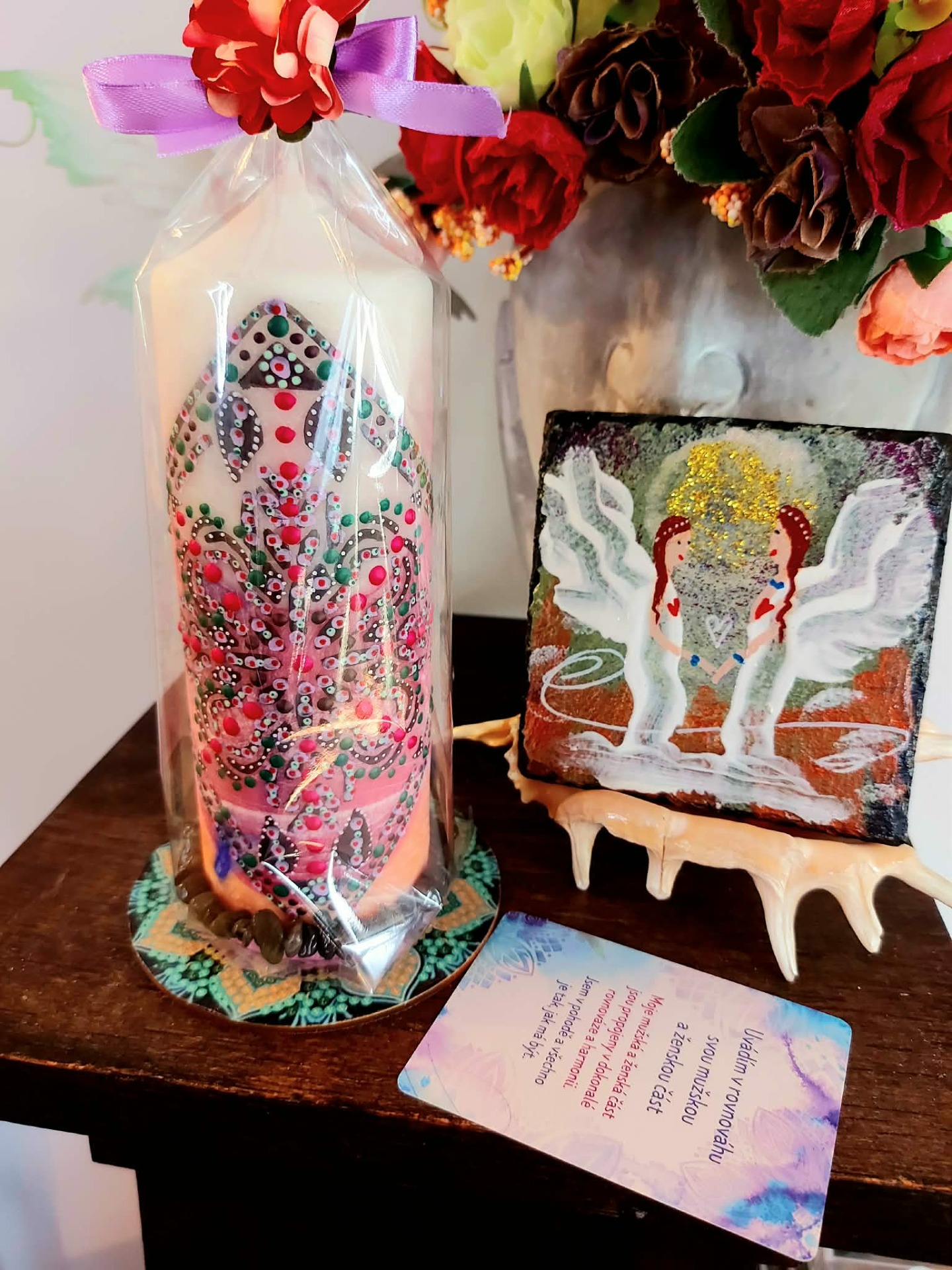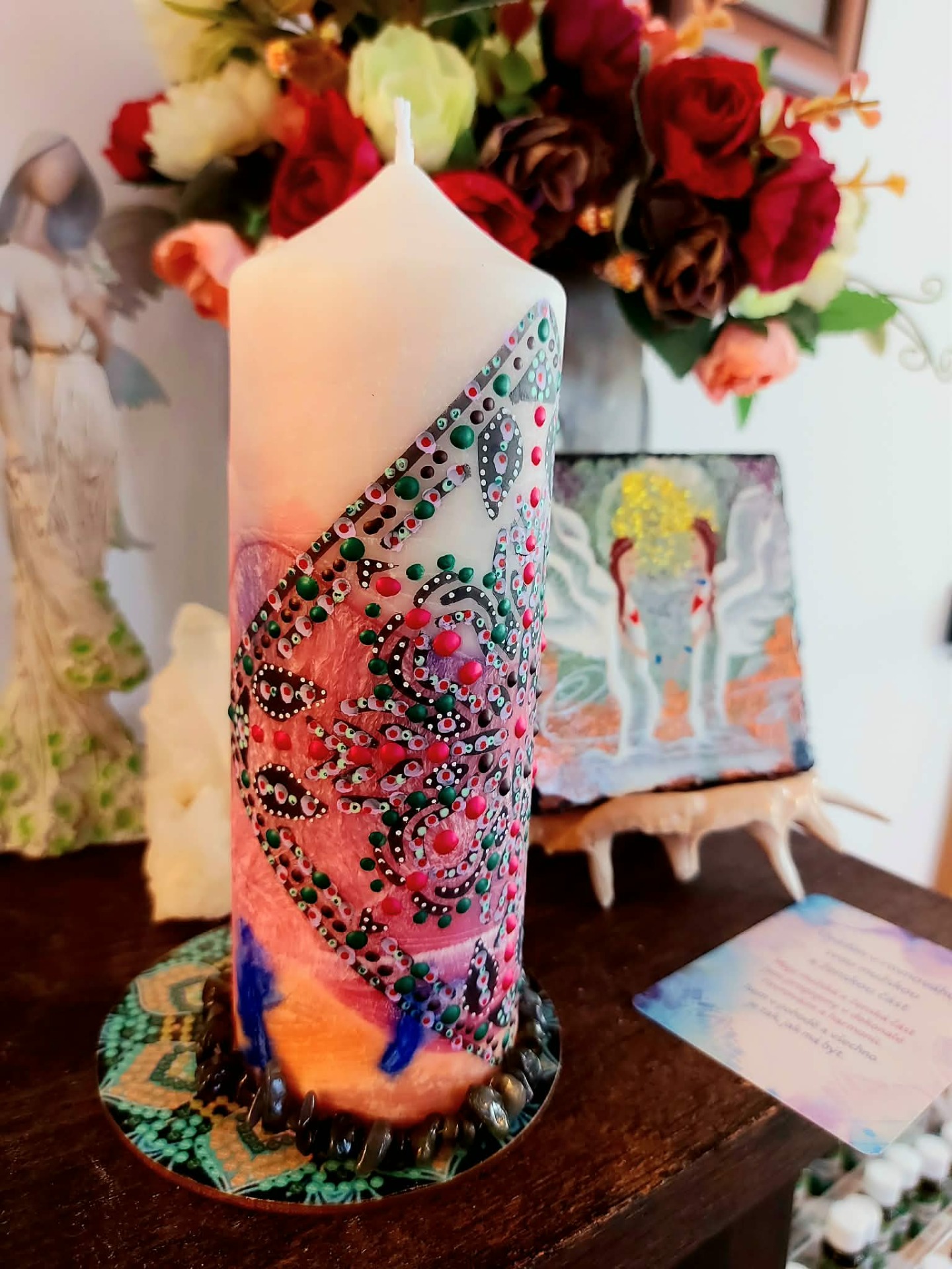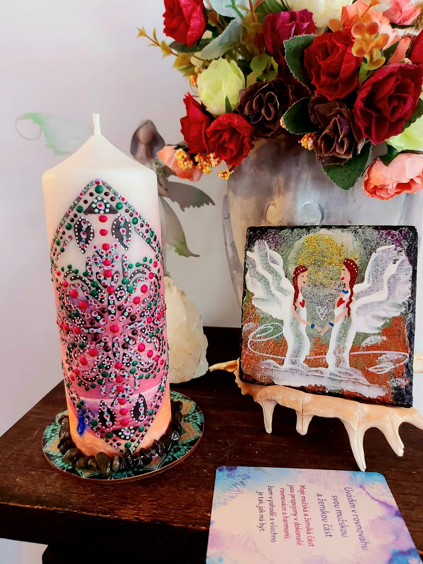 Bachovy esence: Pro podporu celistvosti a integrace: Walnut – pro přechod, přijetí změn a ochranou integritu Star of Bethlehem – pro uzdravení starých zranění a šoků Chestnut Bud – pro integraci zkušeností a učení z minulosti Pine – pro odpuštění sobě a přijetí viny Willow – pro uvolnění hořkosti a přijetí vlastního příběhu Wild Oat – pro návrat ke svému životnímu směru Centaury – pro obnovu vnitřní hranice a vlastní síly . Minerál vložený do spodu svíčky projasňuje mysl, zvyšuje sebevědomí, přináší novou energií, zklidňuje. Podporuje trpělivost, moudrost a dokonalost. Pomáhá se sebezdokonalováním, samostatností, vytrvalostí. Zesiluje energii svíčky, Uvolňuje ji a reguluje, aby bylo dosaženo harmonie Palmový krystalický vosk 370 g, 16/6 cm, malba na svíčku akryl a tekuté perly. Podložka břidlice a akryl, Minerál ve svíčce,, esence divokých květů, Bachovy esence jemně podporují proces, kdy se člověk přestává držet kontroly a dovolí životu, aby jej vedl. Náramek posvátného záměru, pokud je součástí, doporučuji nosit po celou dobu procesu.