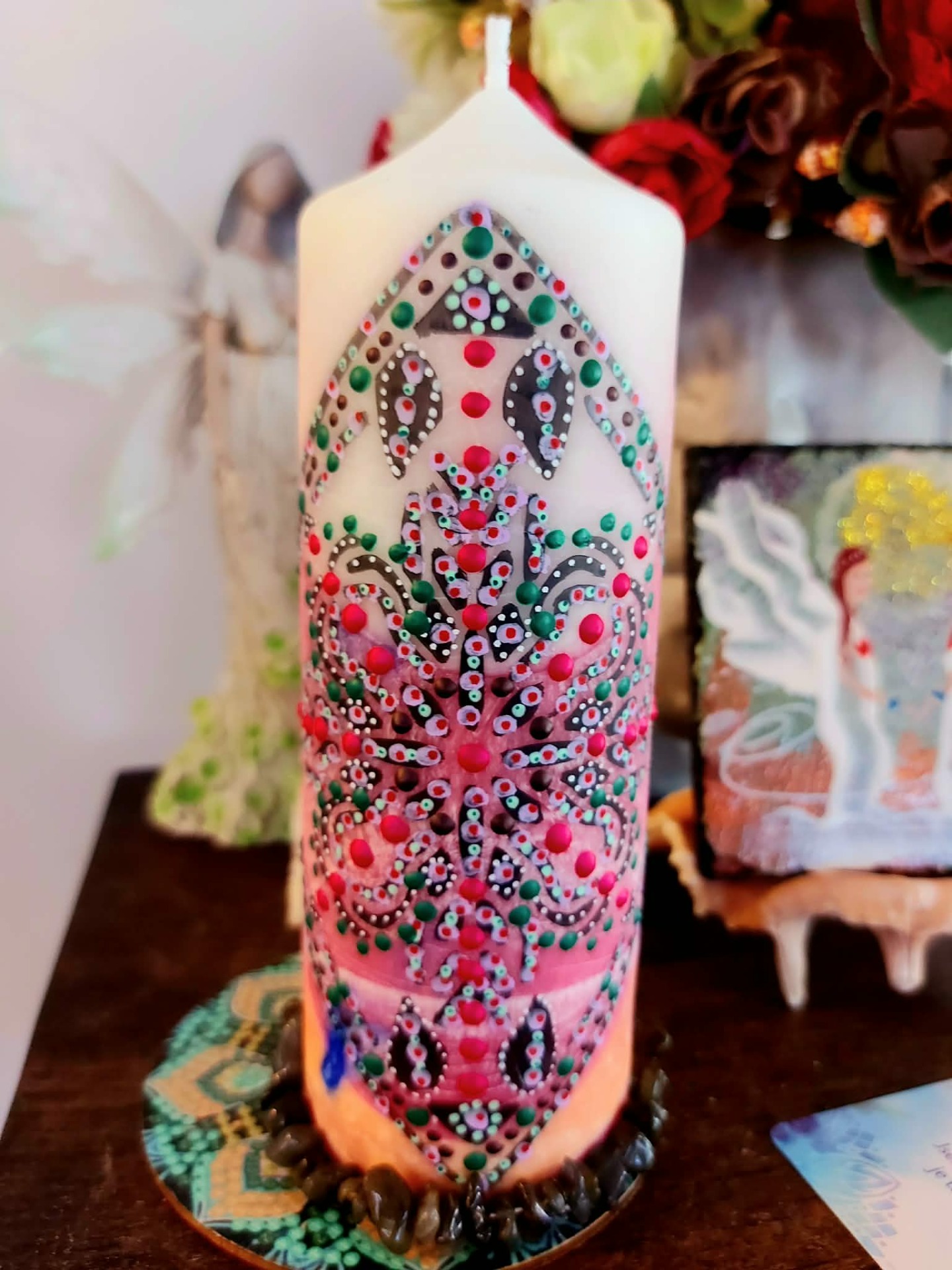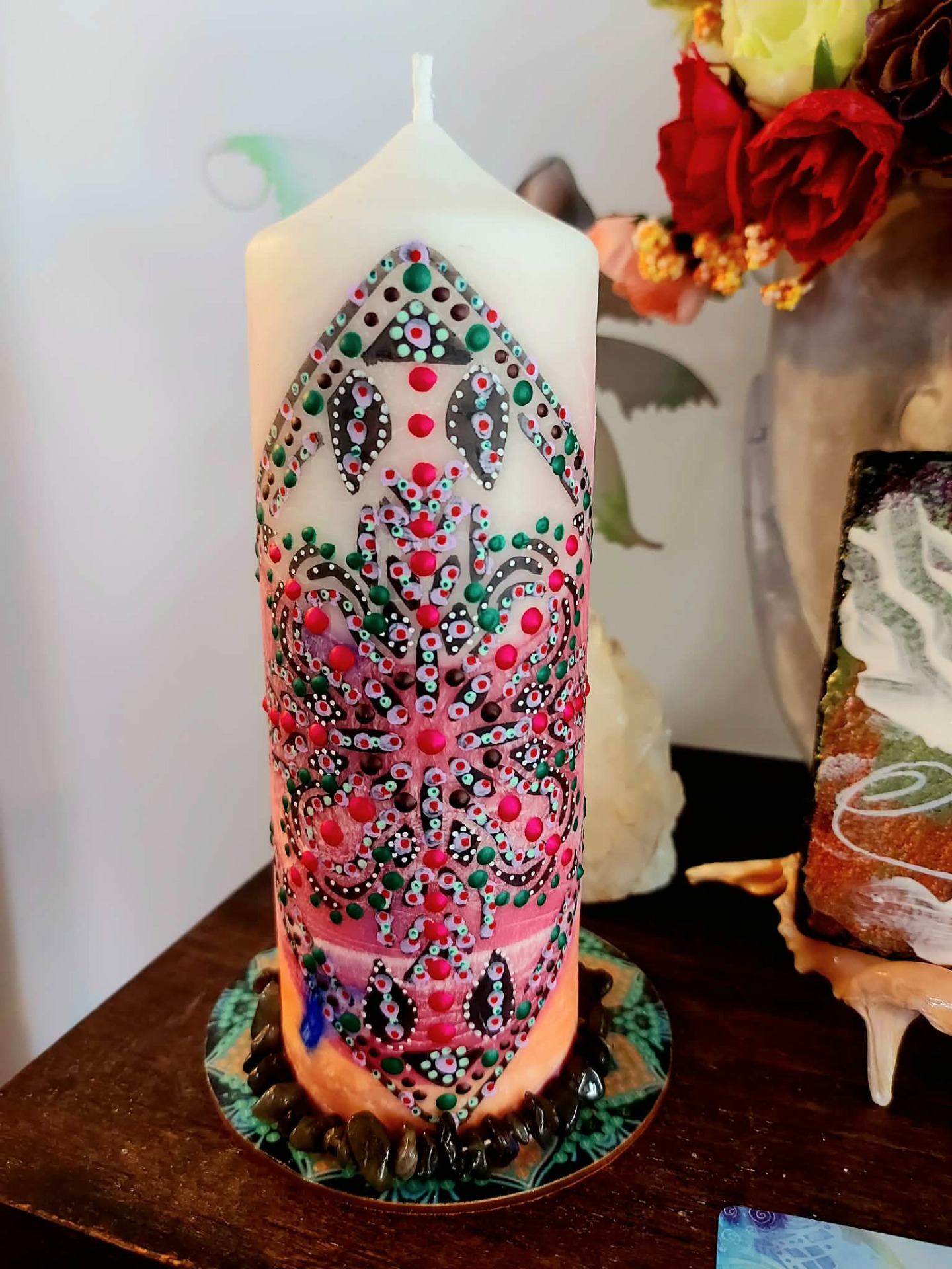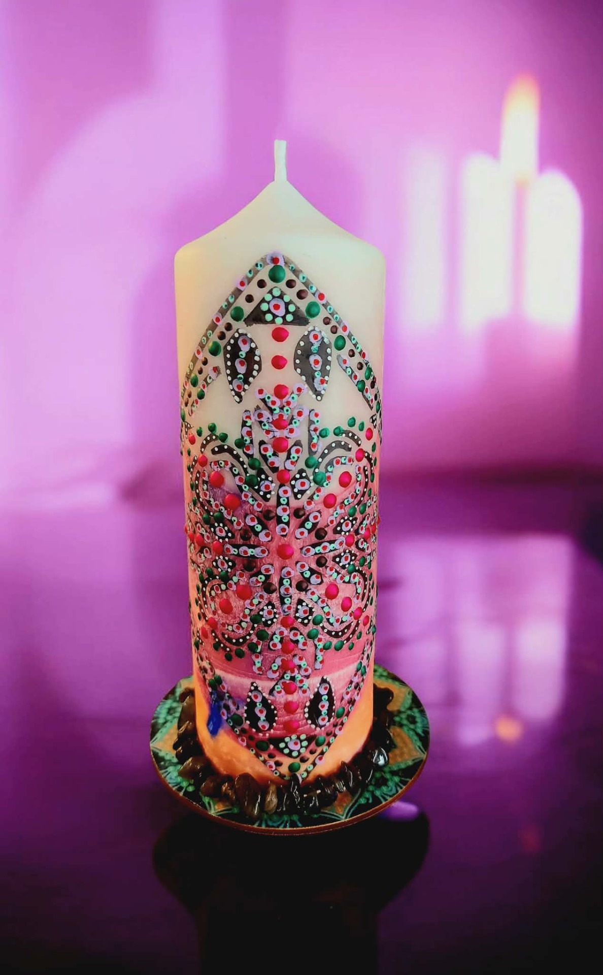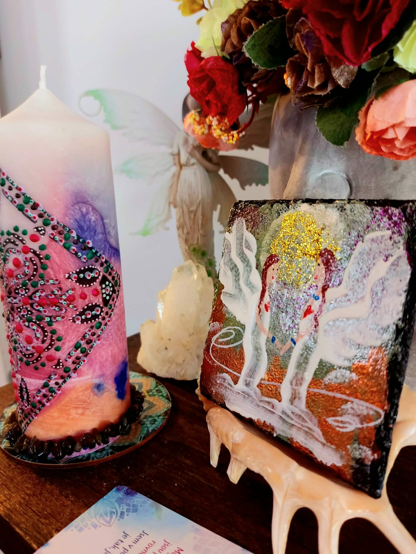 Bachovy esence: Pro podporu celistvosti a integrace: Walnut – pro přechod, přijetí změn a ochranou integritu Star of Bethlehem – pro uzdravení starých zranění a šoků Chestnut Bud – pro integraci zkušeností a učení z minulosti Pine – pro odpuštění sobě a přijetí viny Willow – pro uvolnění hořkosti a přijetí vlastního příběhu Wild Oat – pro návrat ke svému životnímu směru Centaury – pro obnovu vnitřní hranice a vlastní síly . Minerál vložený do spodu svíčky projasňuje mysl, zvyšuje sebevědomí, přináší novou energií, zklidňuje. Podporuje trpělivost, moudrost a dokonalost. Pomáhá se sebezdokonalováním, samostatností, vytrvalostí. Zesiluje energii svíčky, Uvolňuje ji a reguluje, aby bylo dosaženo harmonie Palmový krystalický vosk 370 g, 16/6 cm, malba na svíčku akryl a tekuté perly. Podložka břidlice a akryl, Minerál ve svíčce,, esence divokých květů, Bachovy esence jemně podporují proces, kdy se člověk přestává držet kontroly a dovolí životu, aby jej vedl. Náramek posvátného záměru, pokud je součástí, doporučuji nosit po celou dobu procesu.