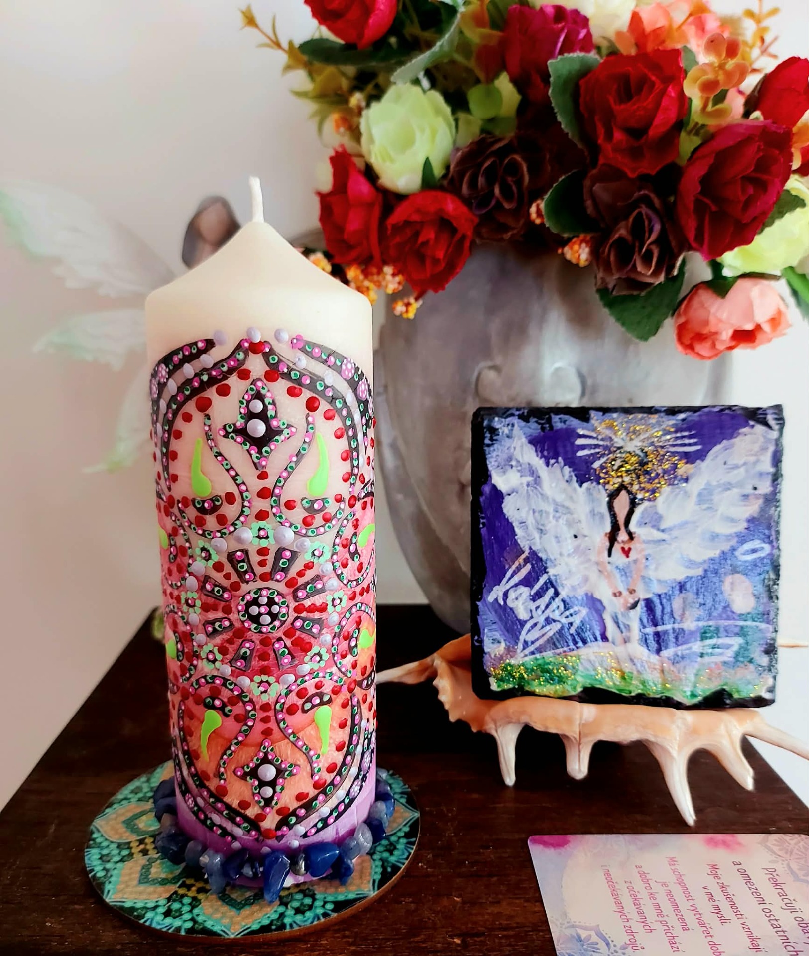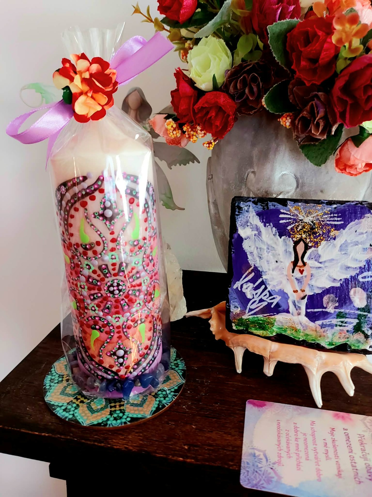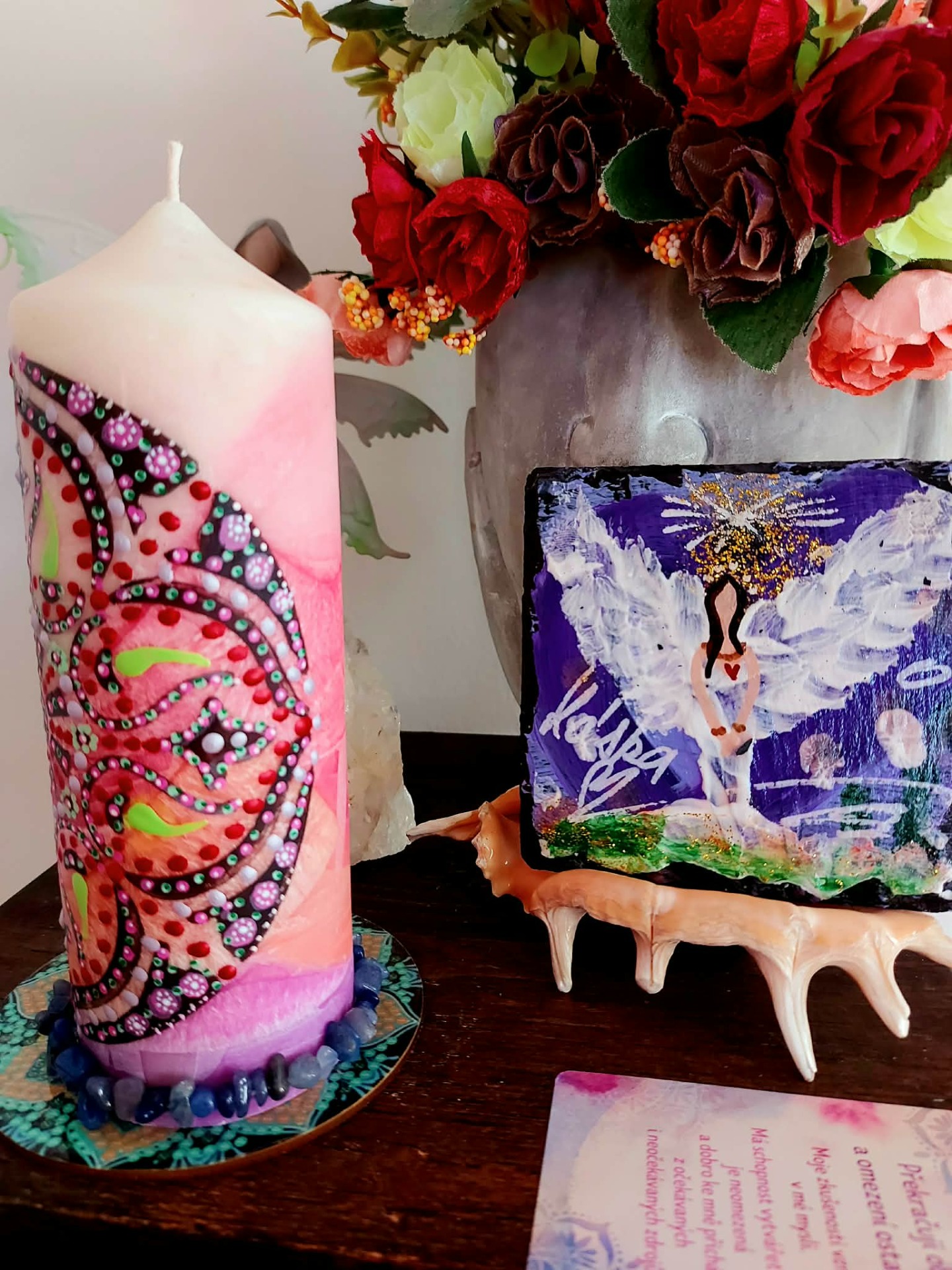 Minerál vložený do spodu svíčky projasňuje mysl, zvyšuje sebevědomí, přináší novou energií, zklidňuje. Podporuje trpělivost, moudrost a dokonalost. Pomáhá se sebezdokonalováním, samostatností, vytrvalostí. Zesiluje energii svíčky, Uvolňuje ji a reguluje, aby bylo dosaženo harmonie Palmový krystalický vosk 370 g, 16/6 cm, malba na svíčku akryl a tekuté perly. Podložka břidlice a akryl, Minerál ve svíčce,, esence divokých květů, Bachovy esence jemně podporují proces, kdy se člověk přestává držet kontroly a dovolí životu, aby jej vedl. Náramek posvátného záměru, pokud je součástí, doporučuji nosit po celou dobu procesu.