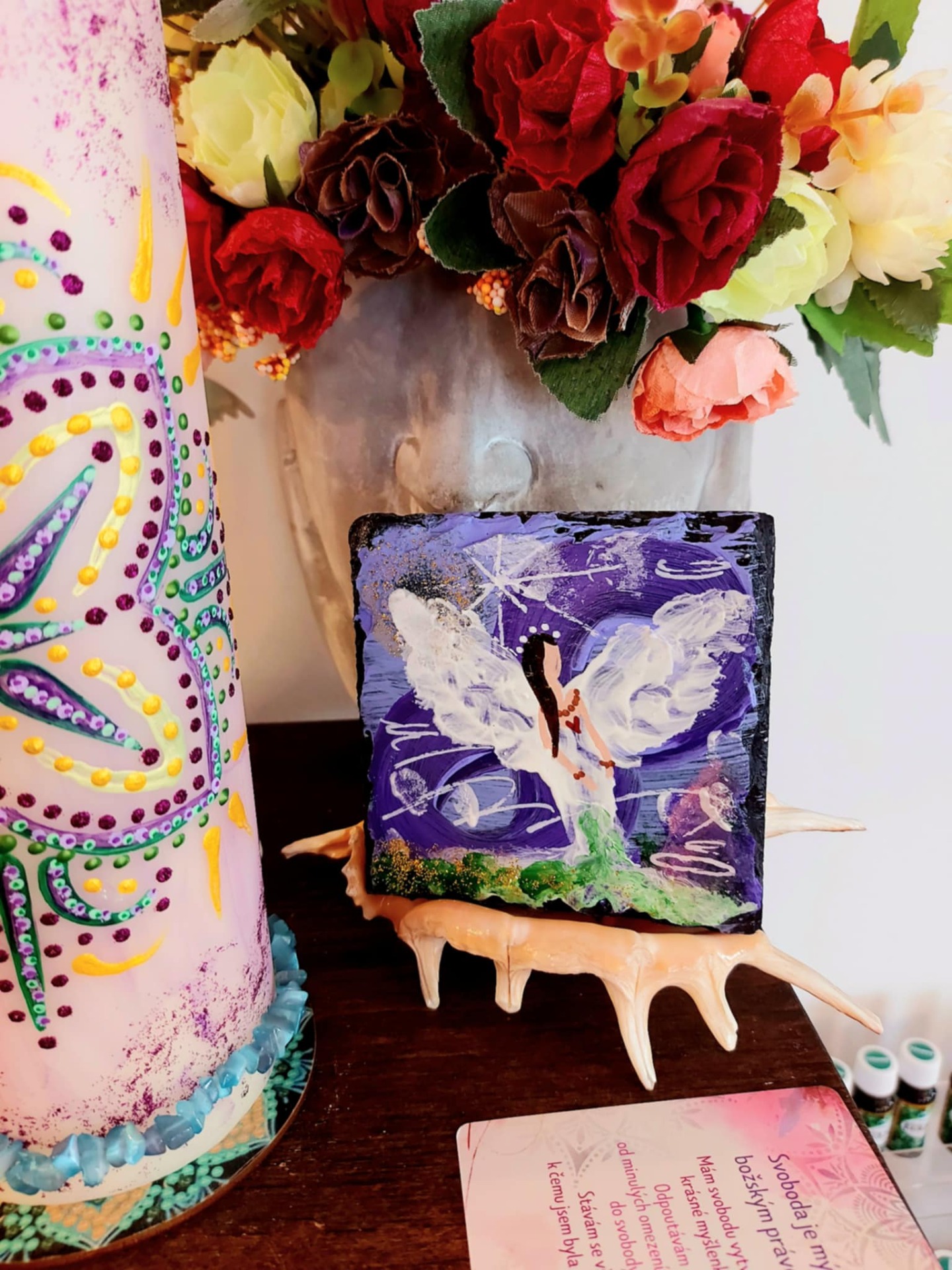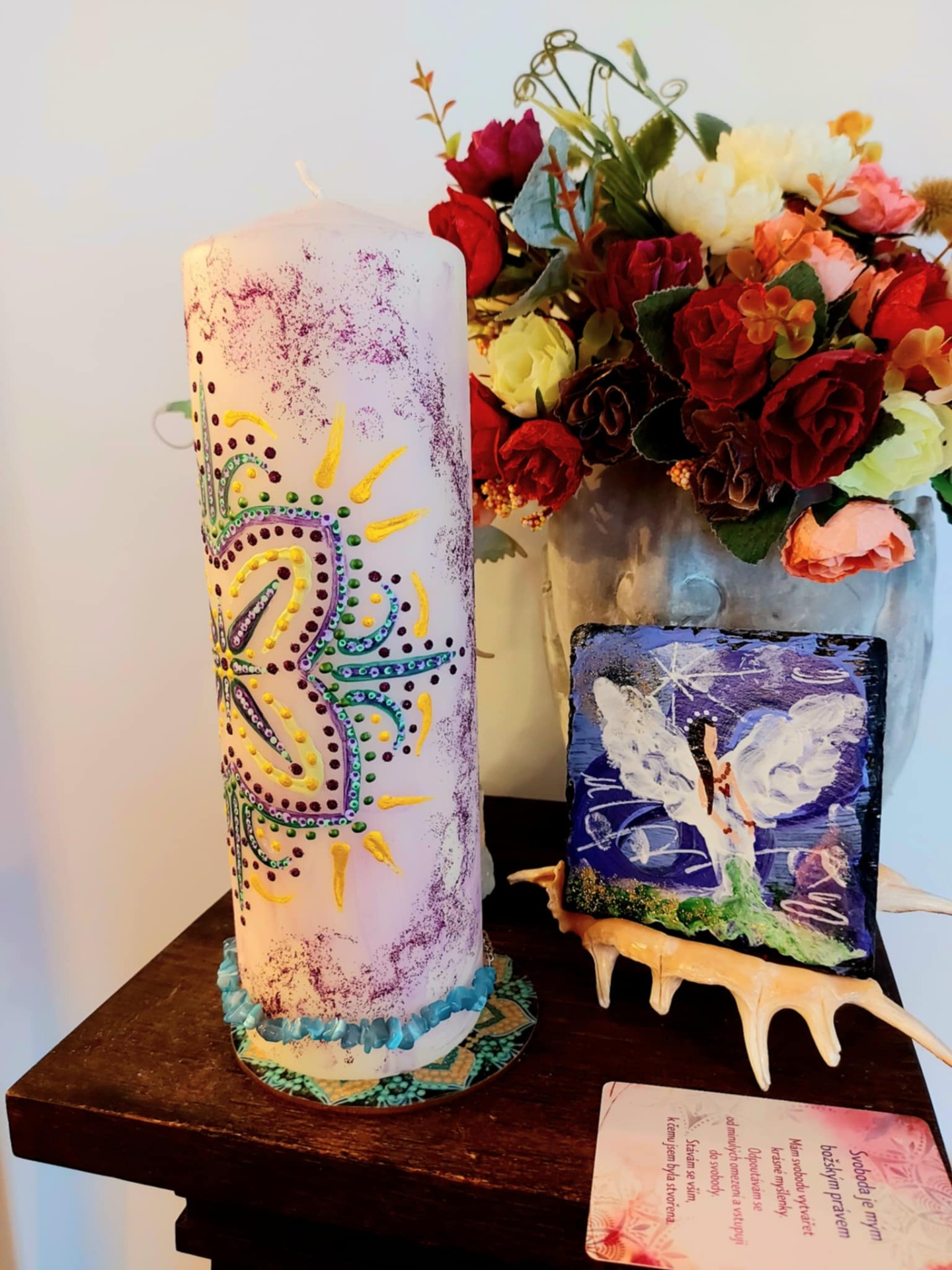 Naladění na prostor a ticho Zapal svíčku. Dovol světlu, aby se rozprostřelo kolem tebe. Vnímej dech takový, jaký právě je.Vnímej, v jakém vnitřním prostoru se právě nacházíš. Tělo se usazuje. Pozornost se zjemňuje. Jsi tady a teď. Prostor kolem tebe se otevírá. Prostor v tobě se pomocí dechu rozšiřuje. Myšlenky nechej plynout. Pocity nech být přítomné. Všechno má své místo. Parafín, 940 g, 22/8 cm, malba na svíčku akryl a tekuté perly, minerál, podložka břidlice , akryl.