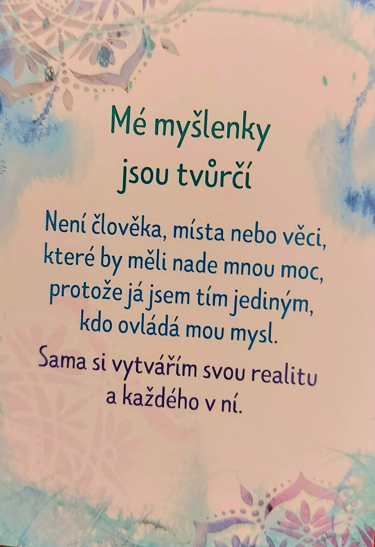 Afirmace :Jsem plně přítomná ve svém těle i ve svém životě. S lehkostí vnímám, co je teď důležité. Mé myšlenky jsou klidné a jasné. Jednám vědomě a s důvěrou. Život se odehrává právě teď — a já jsem jeho součástí.