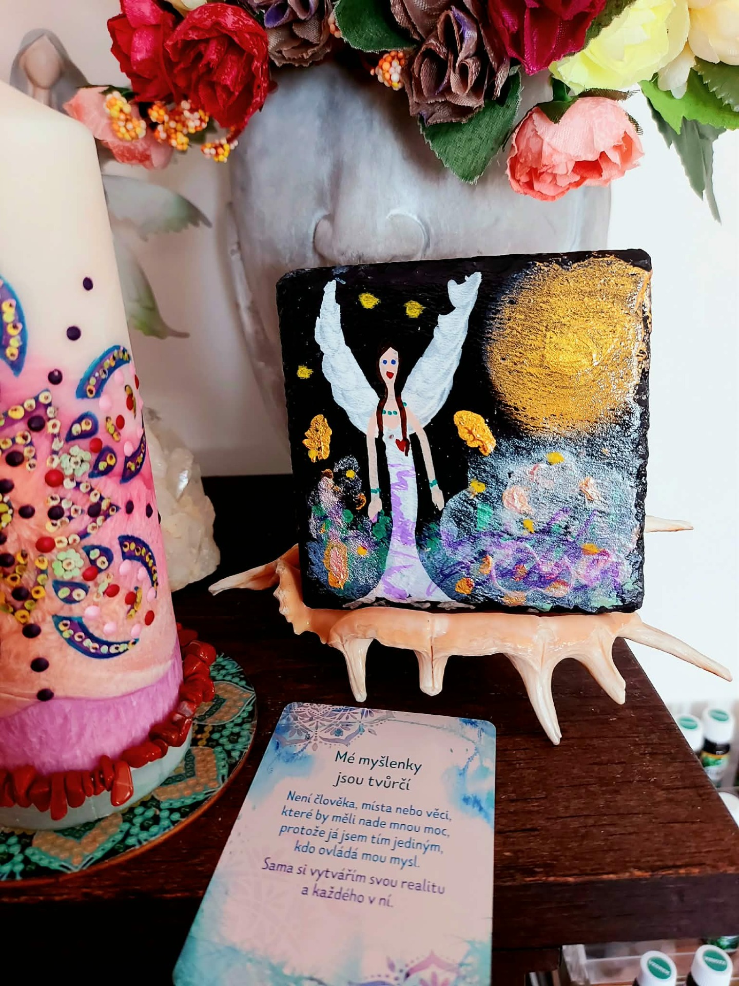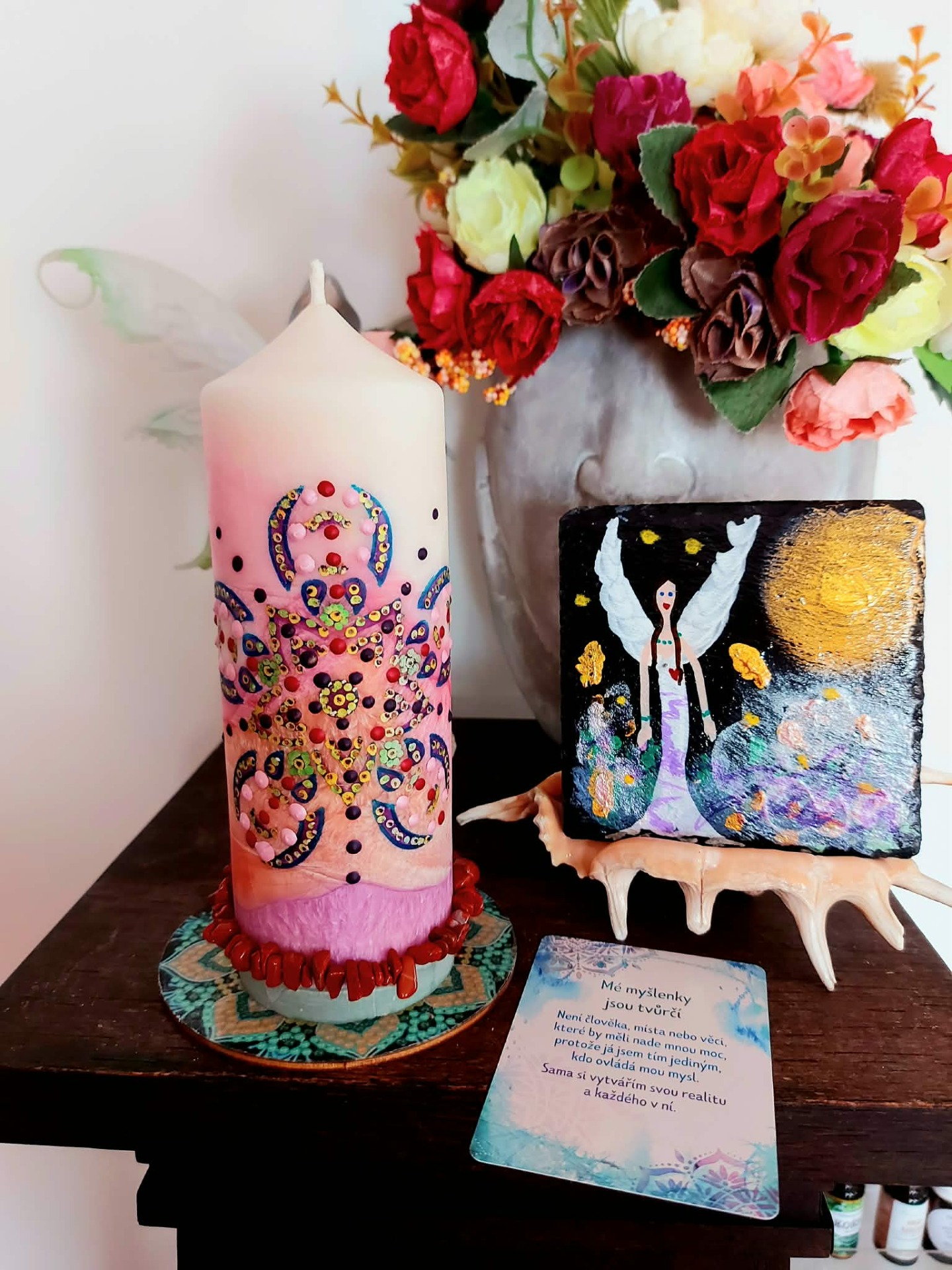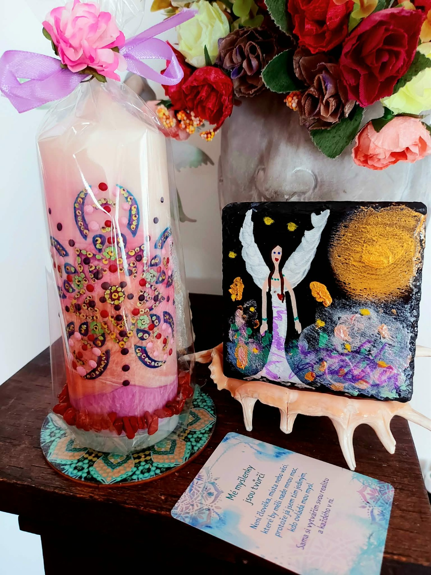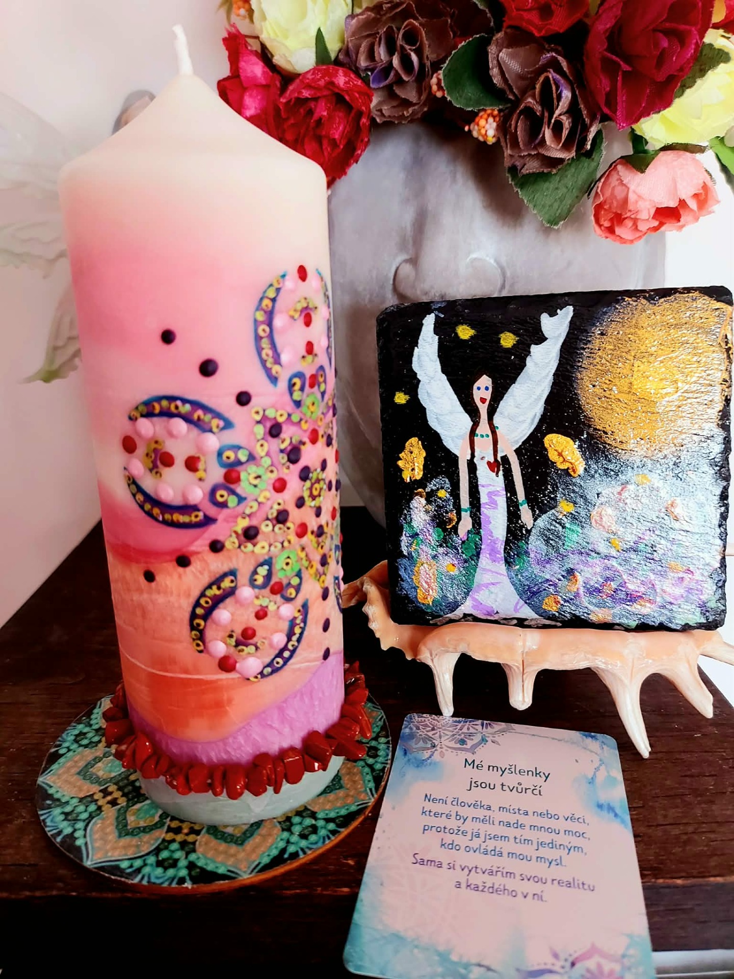 Minerál vložený do spodu svíčky projasňuje mysl, zvyšuje sebevědomí, přináší novou energií, zklidňuje. Podporuje trpělivost, moudrost a dokonalost. Pomáhá se sebezdokonalováním, samostatností, vytrvalostí. Zesiluje energii svíčky, Uvolňuje ji a reguluje, aby bylo dosaženo harmonie Palmový krystalický vosk 370 g, 16/6 cm, malba na svíčku akryl a tekuté perly. Podložka břidlice a akryl, Minerál ve svíčce,, esence divokých květů, Bachovy esence jemně podporují proces, kdy se člověk přestává držet kontroly a dovolí životu, aby jej vedl. Náramek posvátného záměru, pokud je součástí, doporučuji nosit po celou dobu procesu.