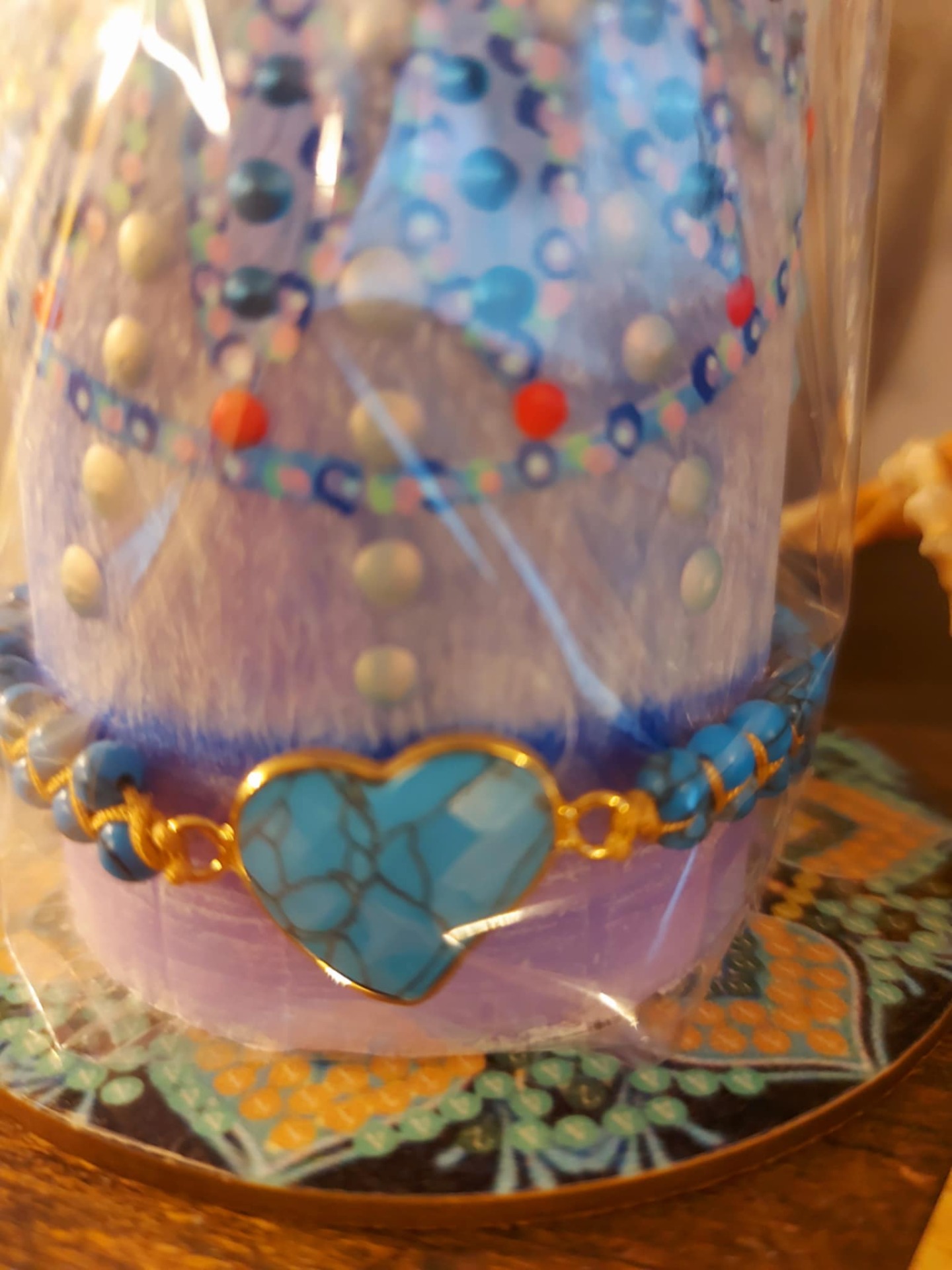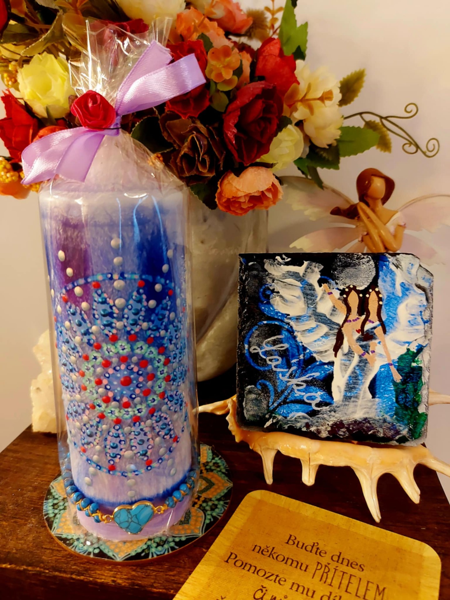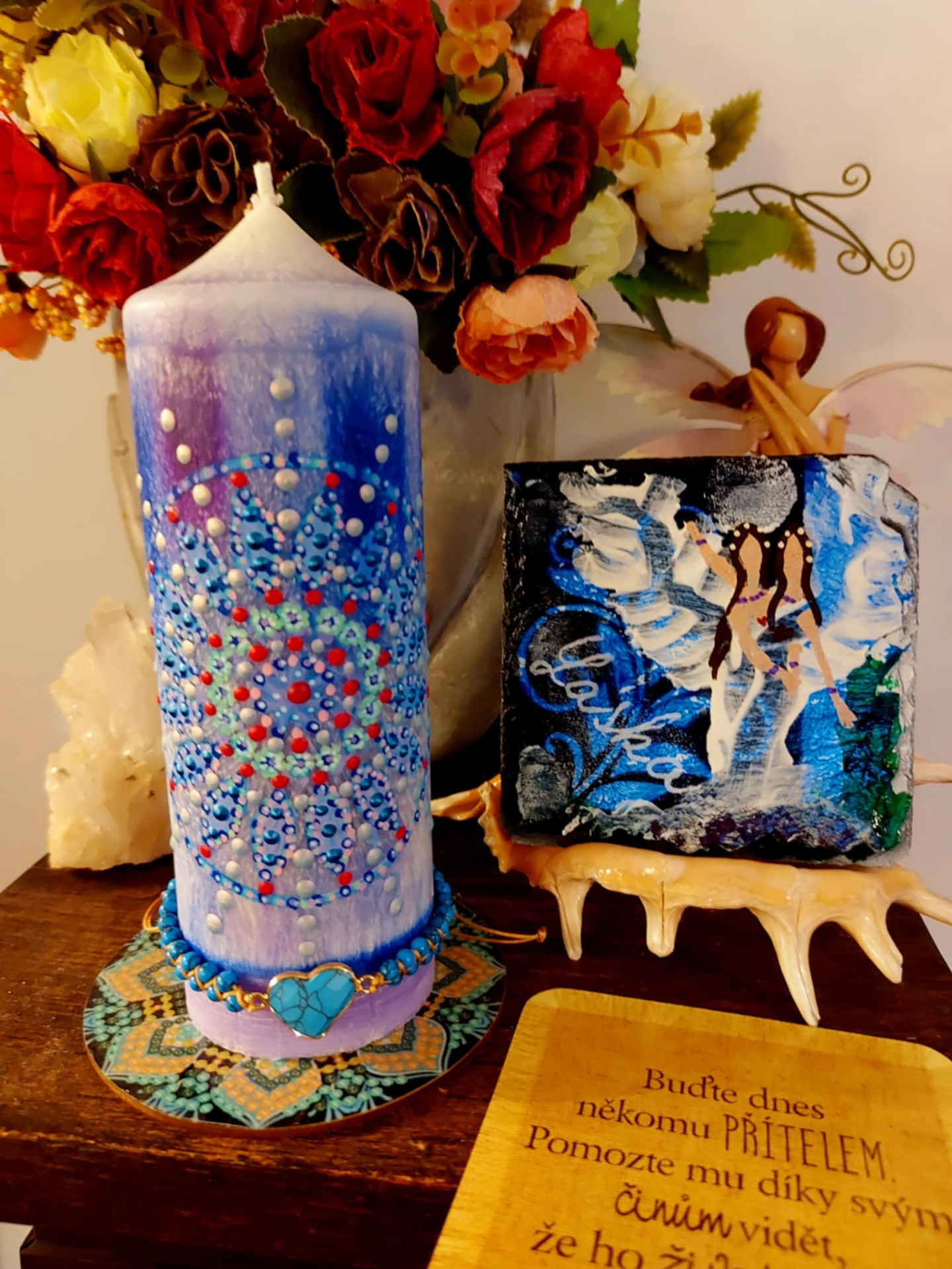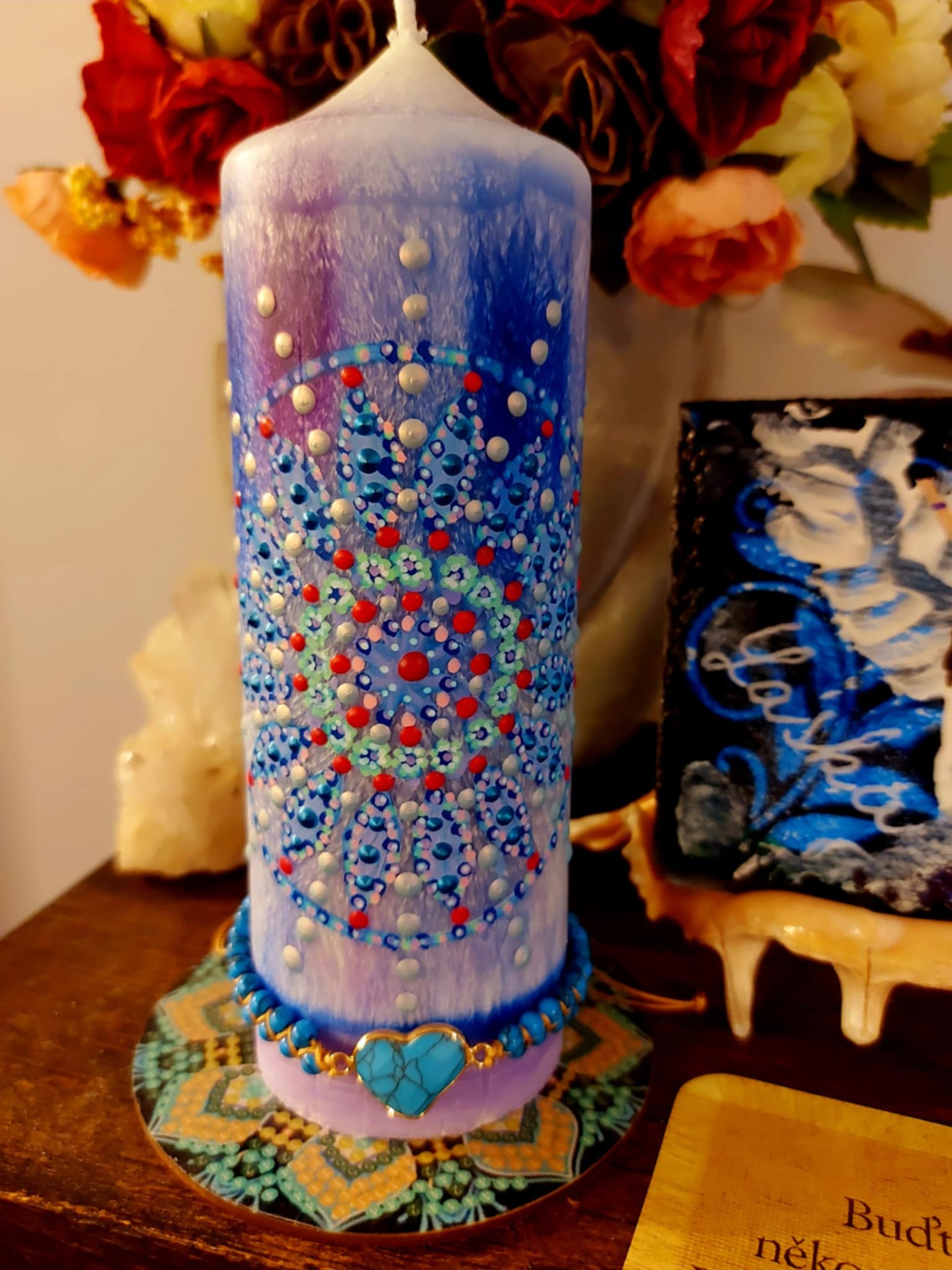 Minerál vložený do spodu svíčky projasňuje mysl, zvyšuje sebevědomí, přináší novou energií, zklidňuje. Podporuje trpělivost, moudrost a dokonalost. Pomáhá se sebezdokonalováním, samostatností, vytrvalostí. Zesiluje energii svíčky, Uvolňuje ji a reguluje, aby bylo dosaženo harmonie Palmový krystalický vosk 370 g, 16/6 cm, malba na svíčku akryl a tekuté perly. Podložka břidlice a akryl, Minerál ve svíčce,, esence divokých květů, Bachovy esence. Náramek posvátného záměru, pokud je součástí, doporučuji nosit po celou dobu procesu.