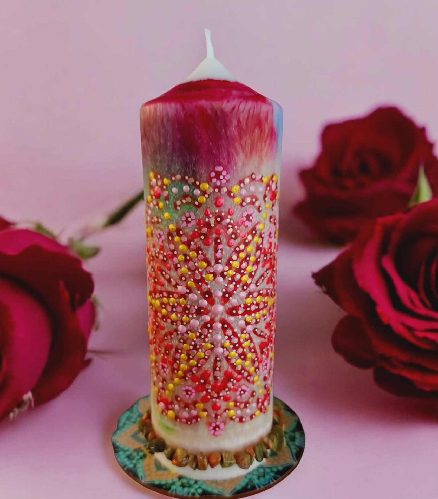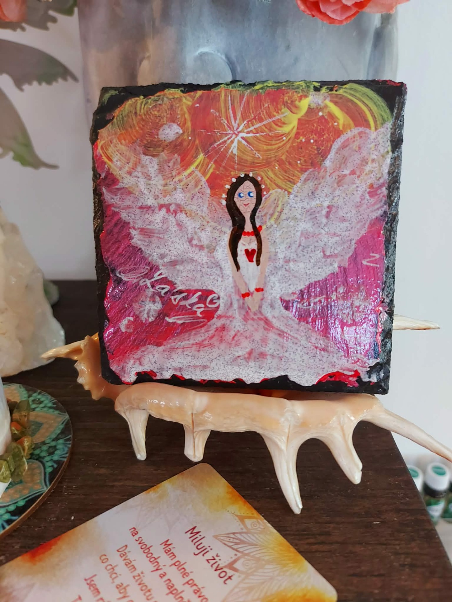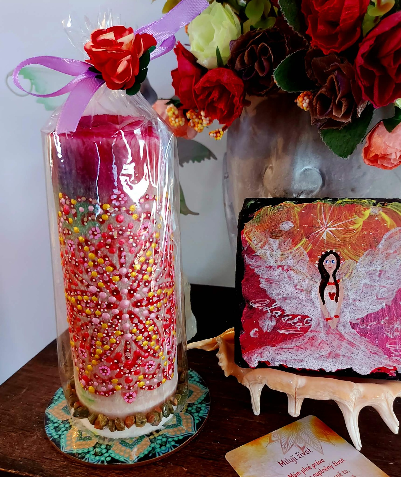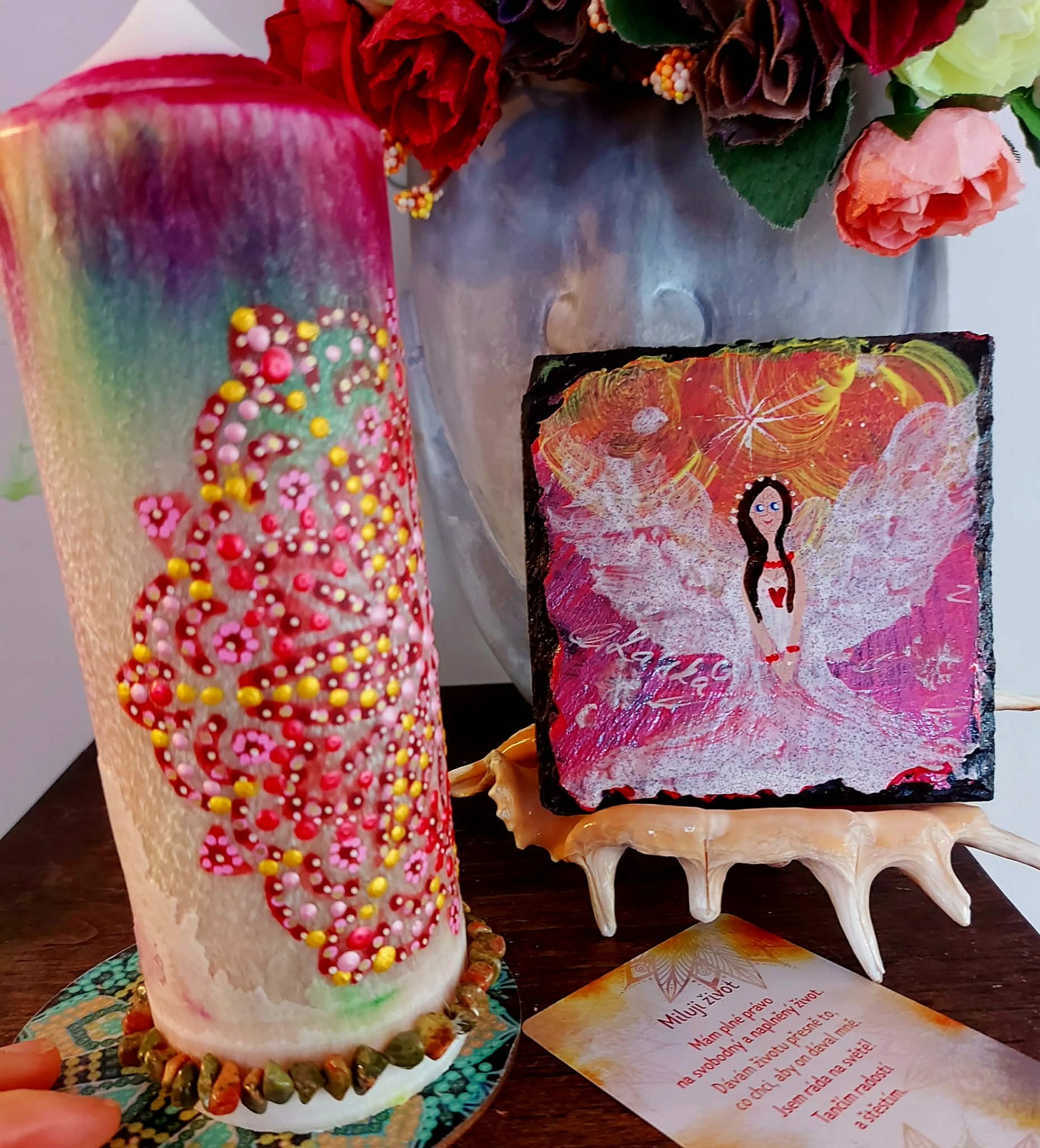 Minerál vložený do spodu svíčky projasňuje mysl, zvyšuje sebevědomí, přináší novou energií, zklidňuje. Podporuje trpělivost, moudrost a dokonalost. Pomáhá se sebezdokonalováním, samostatností, vytrvalostí. Zesiluje energii svíčky, Uvolňuje ji a reguluje, aby bylo dosaženo harmonie Palmový krystalický vosk 370 g, 16/6 cm, malba na svíčku akryl a tekuté perly. Podložka břidlice a akryl, Minerál ve svíčce,, esence divokých květů, Bachovy esence jemně podporují proces, kdy se člověk přestává držet kontroly a dovolí životu, aby jej vedl. Náramek posvátného záměru, pokud je součástí, doporučuji nosit po celou dobu procesu.