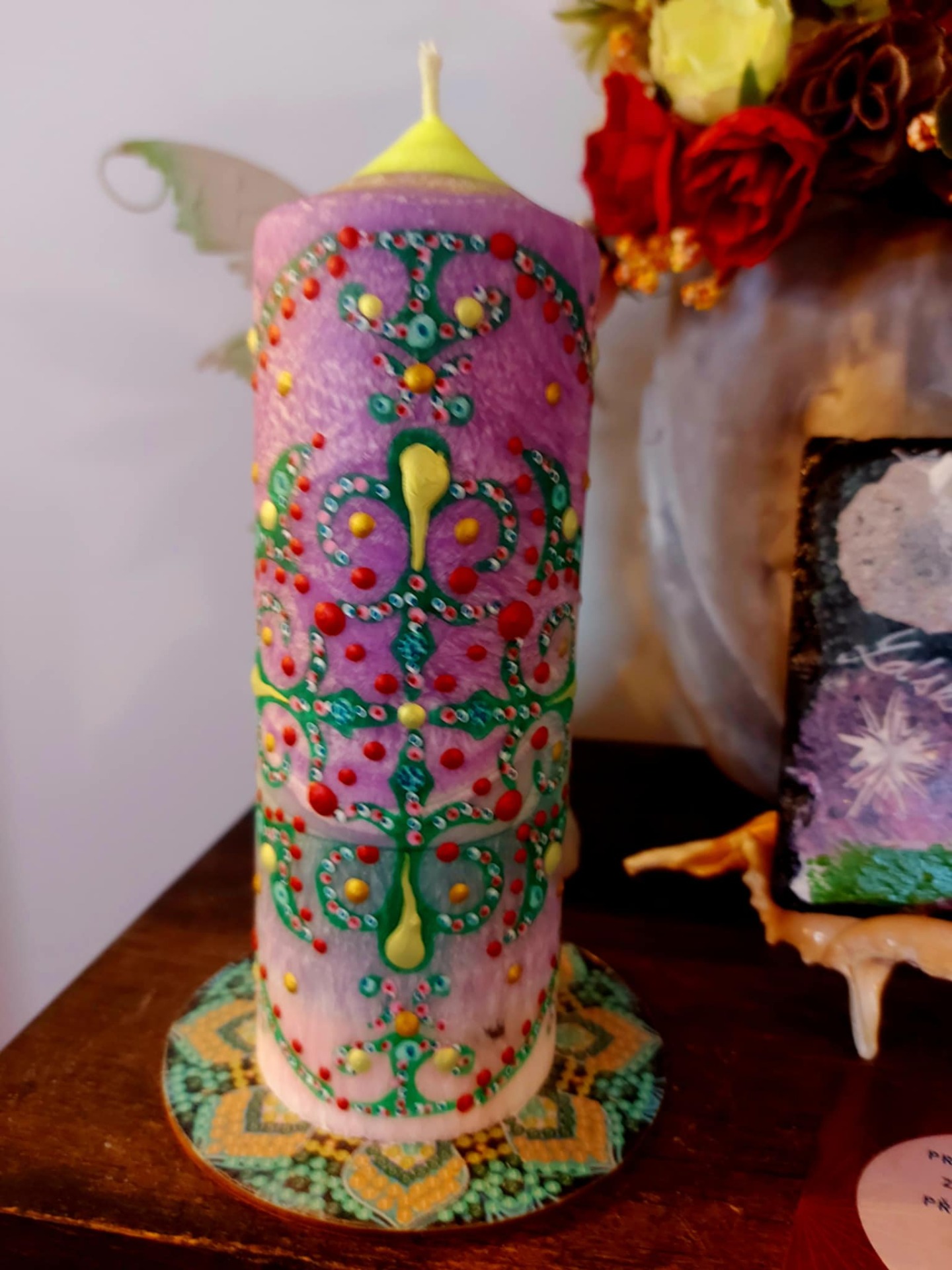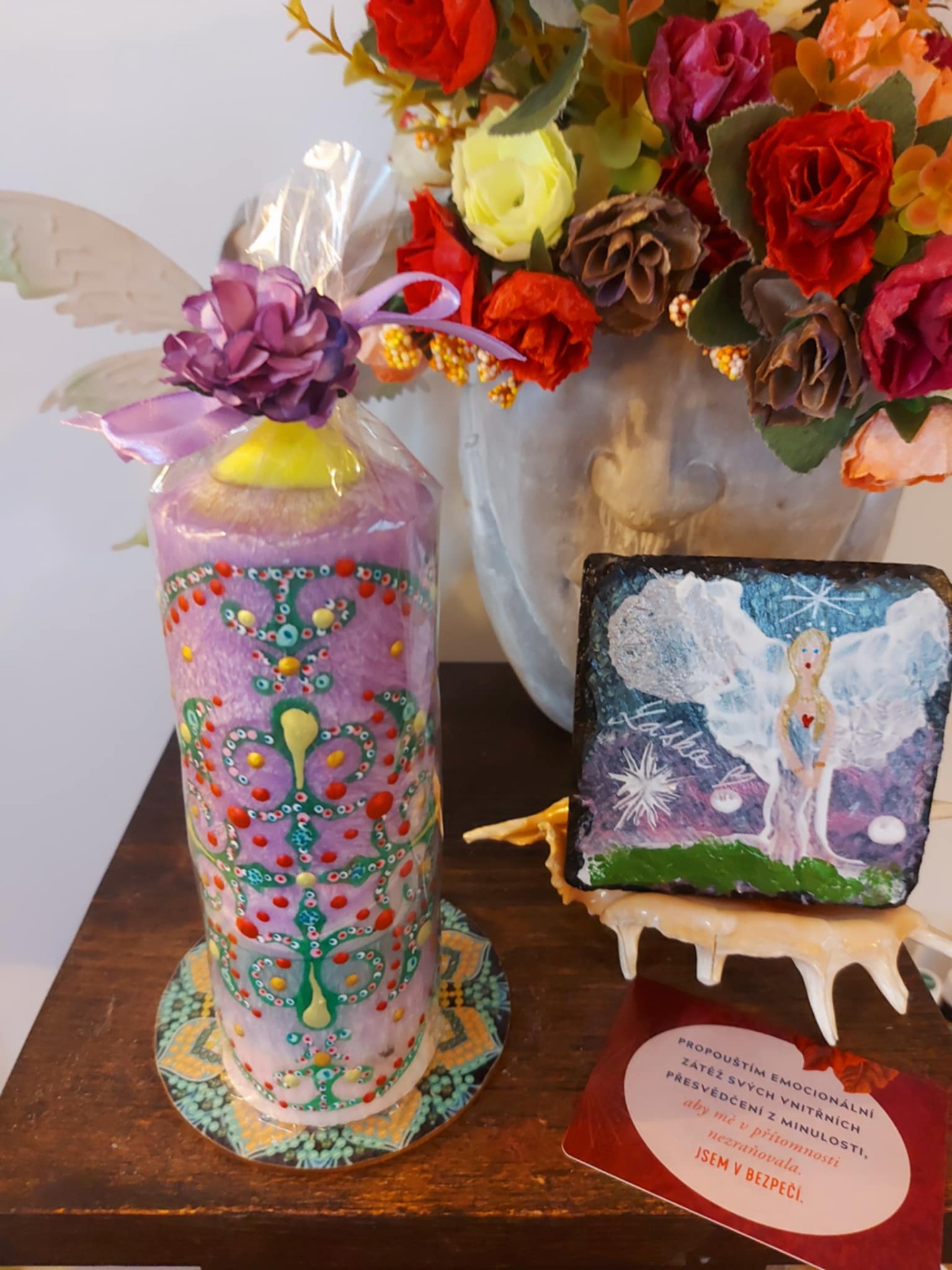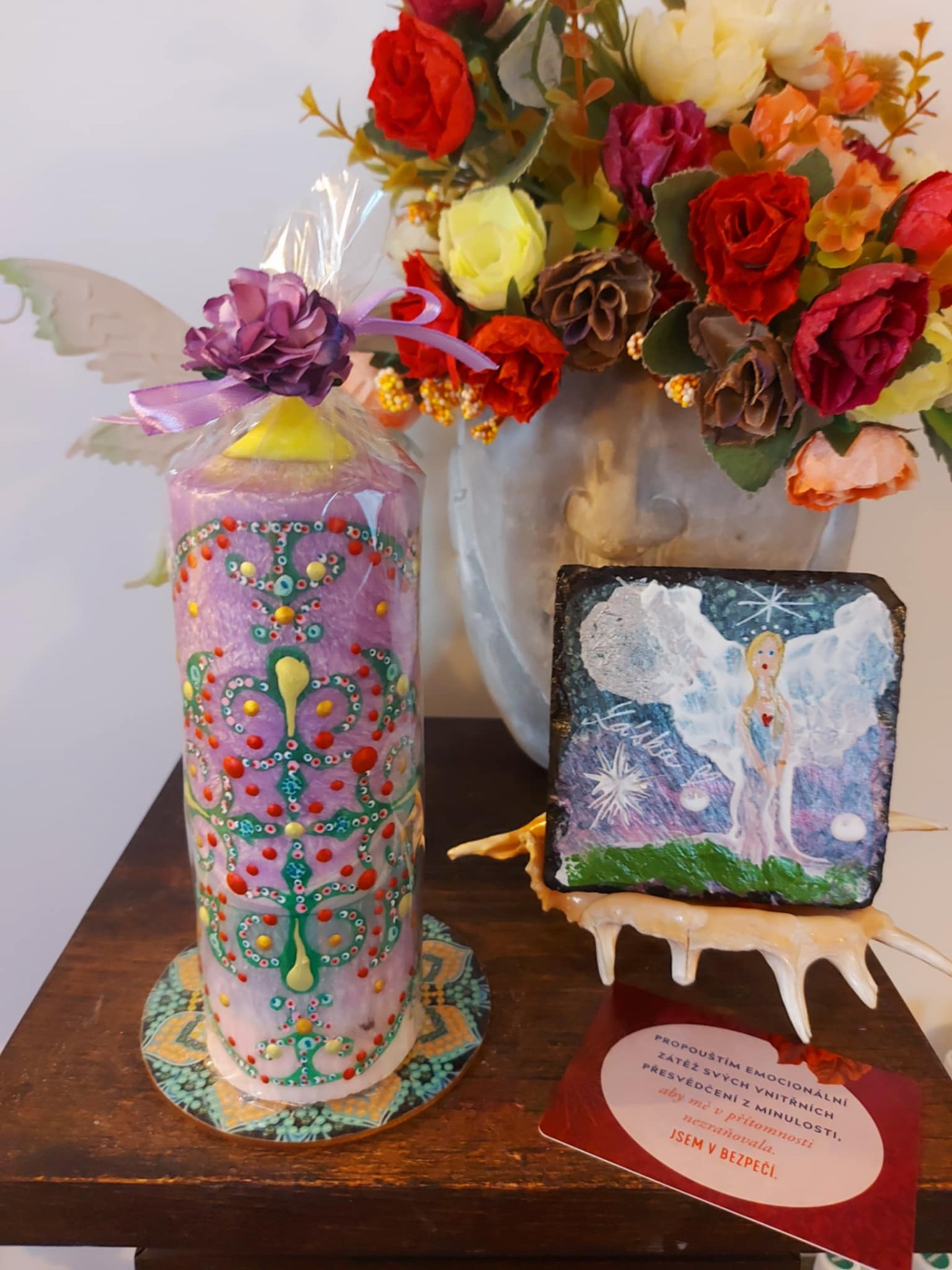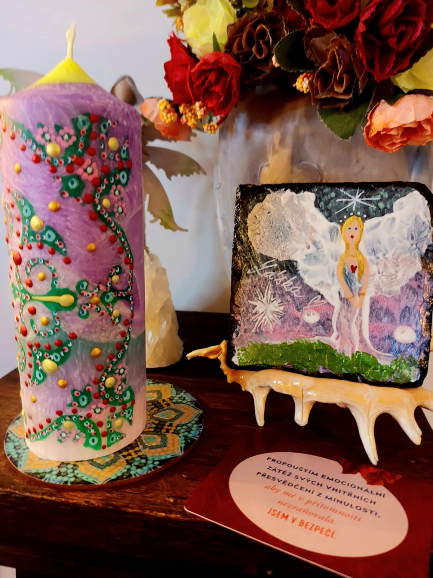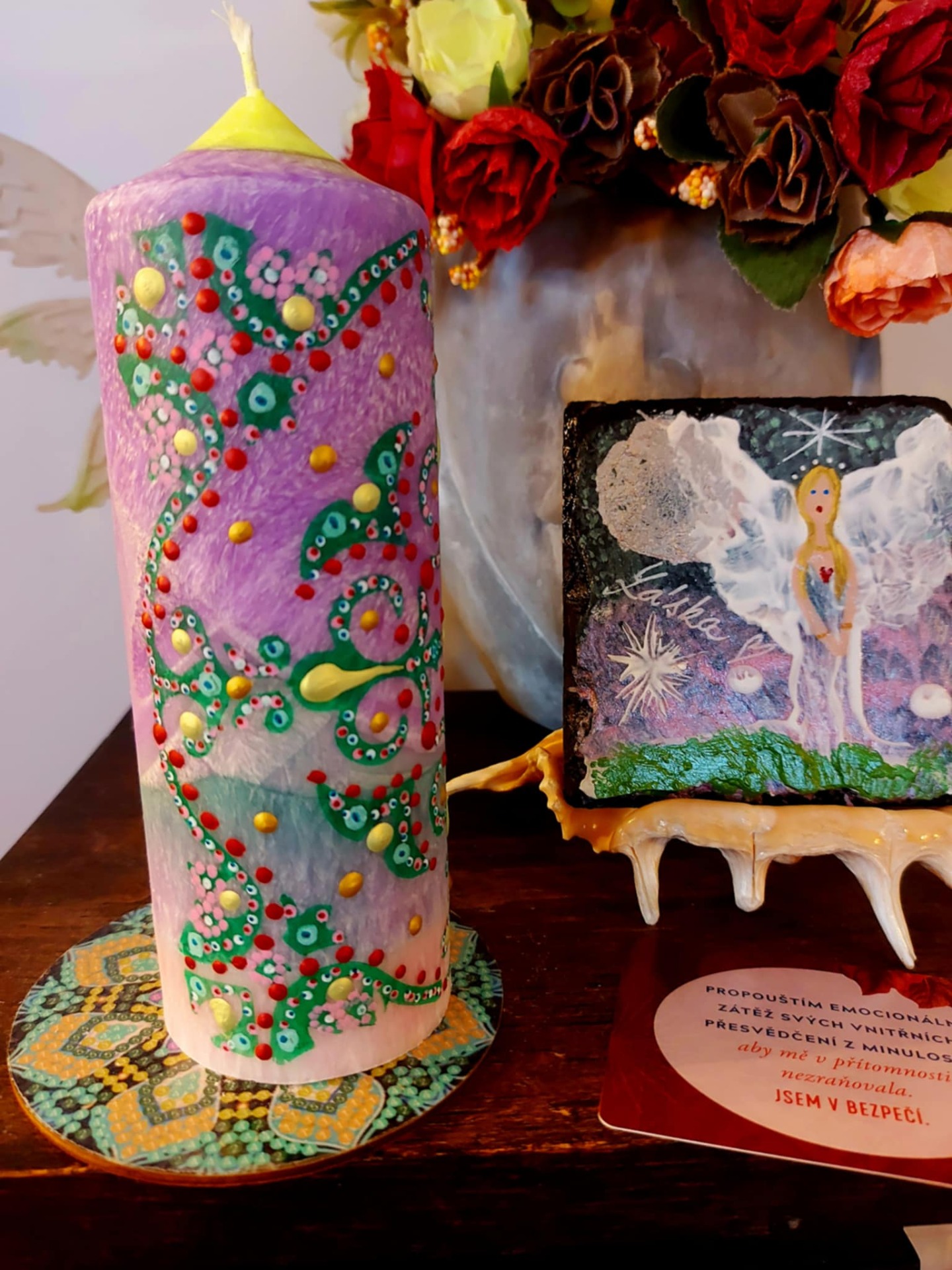 Minerál vložený do spodu svíčky projasňuje mysl, zvyšuje sebevědomí, přináší novou energií, zklidňuje. Podporuje trpělivost, moudrost a dokonalost. Pomáhá se sebezdokonalováním, samostatností, vytrvalostí. Zesiluje energii svíčky, Uvolňuje ji a reguluje, aby bylo dosaženo harmonie Palmový krystalický vosk 370 g, 16/6 cm, malba na svíčku akryl a tekuté perly. Podložka břidlice a akryl, Minerál ve svíčce,, esence divokých květů, Bachovy esence jemně podporují proces, kdy se člověk přestává držet kontroly a dovolí životu, aby jej vedl. Náramek posvátného záměru, pokud je součástí, doporučuji nosit po celou dobu procesu.