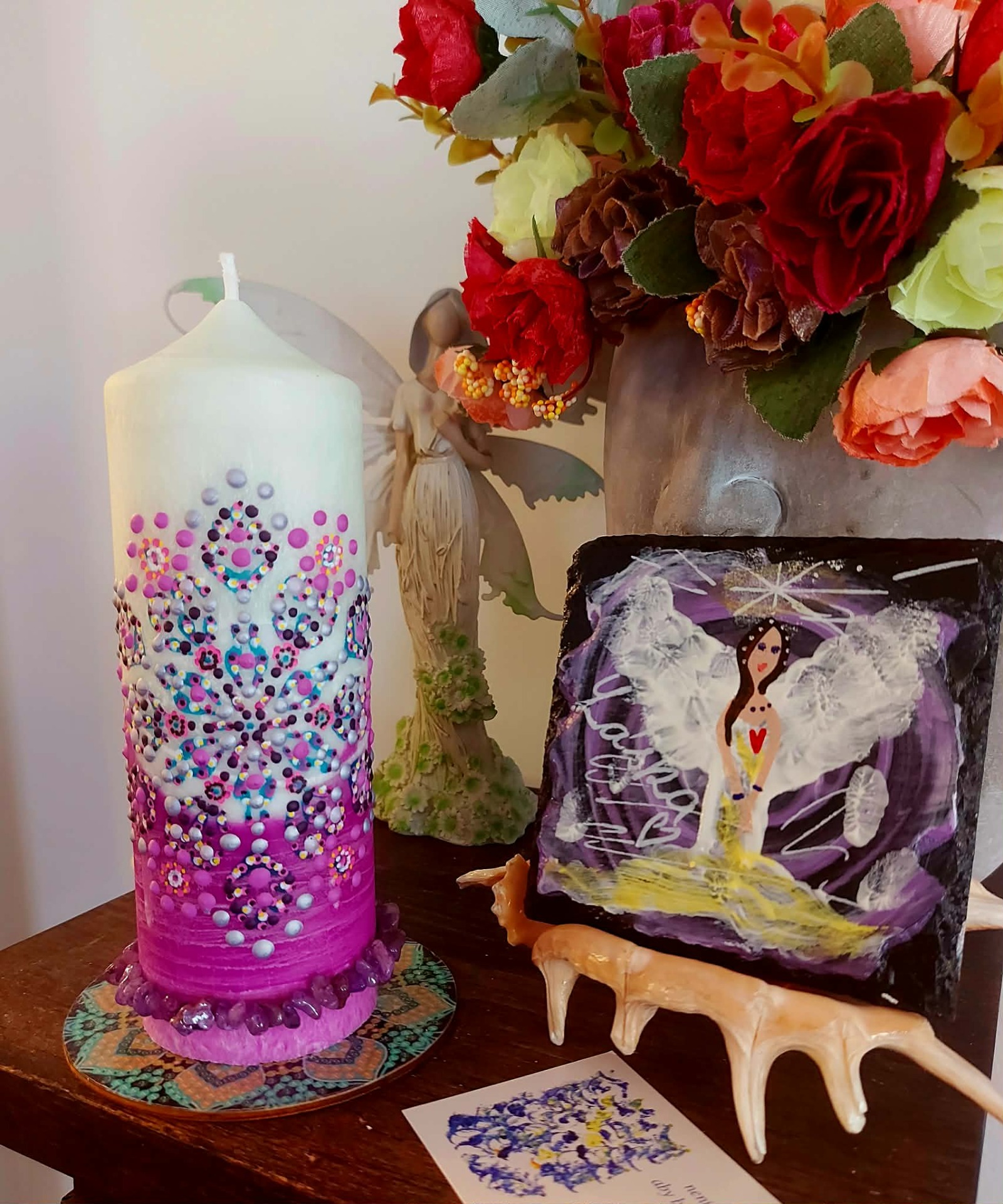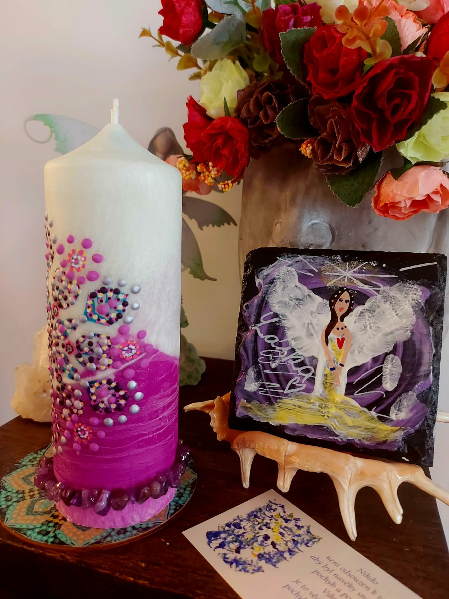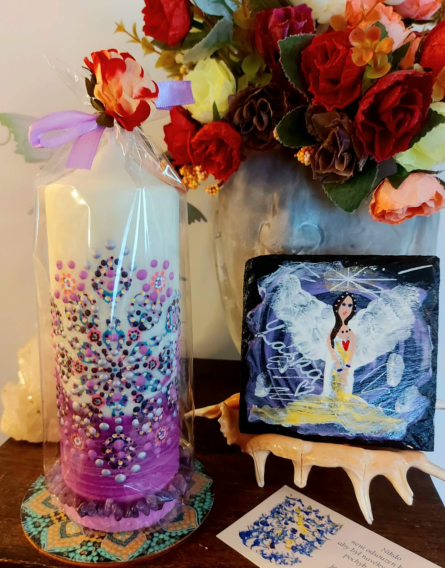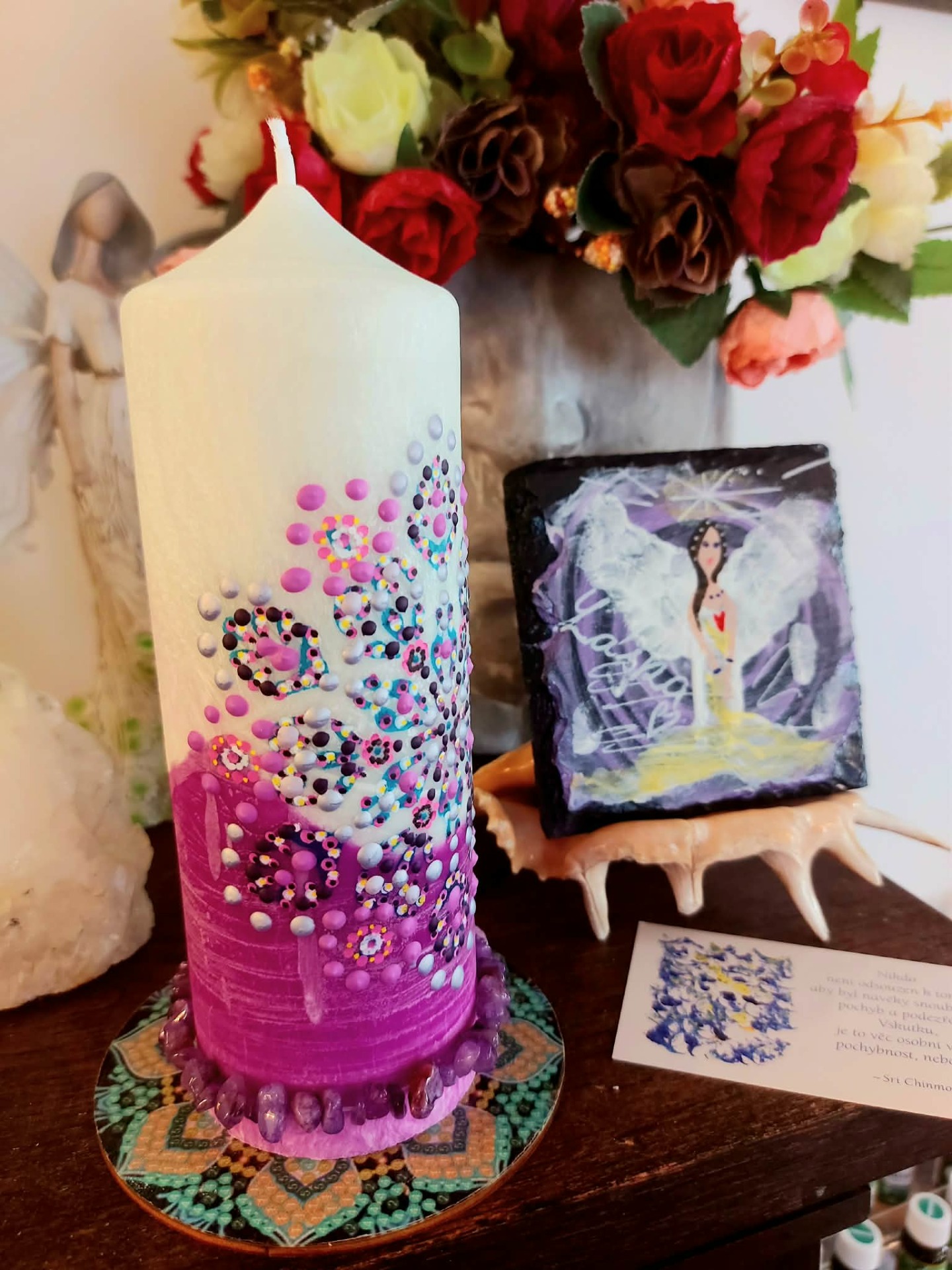 Minerál vložený do spodu svíčky projasňuje mysl, zvyšuje sebevědomí, přináší novou energií, zklidňuje. Podporuje trpělivost, moudrost a dokonalost. Pomáhá se sebezdokonalováním, samostatností, vytrvalostí. Zesiluje energii svíčky, Uvolňuje ji a reguluje, aby bylo dosaženo harmonie Palmový krystalický vosk 370 g, 16/6 cm, malba na svíčku akryl a tekuté perly. Podložka břidlice a akryl, Minerál ve svíčce,, esence divokých květů, Bachovy esence jemně podporují proces, kdy se člověk přestává držet kontroly a dovolí životu, aby jej vedl. Náramek posvátného záměru, pokud je součástí, doporučuji nosit po celou dobu procesu.