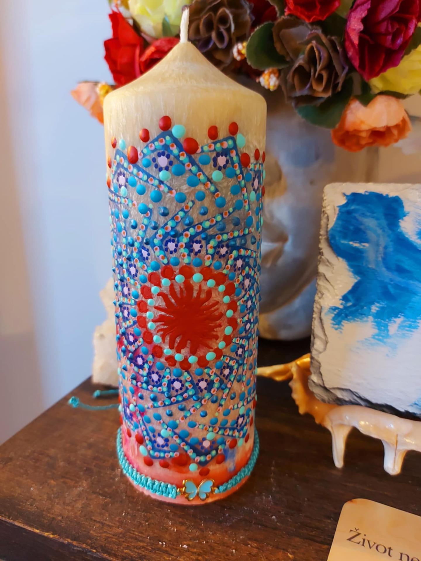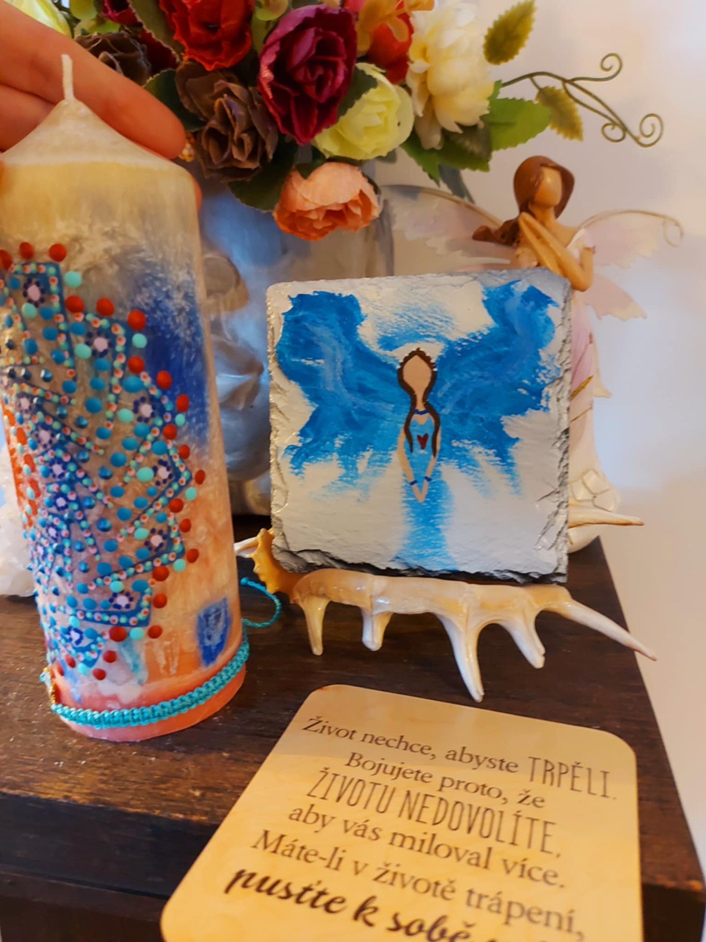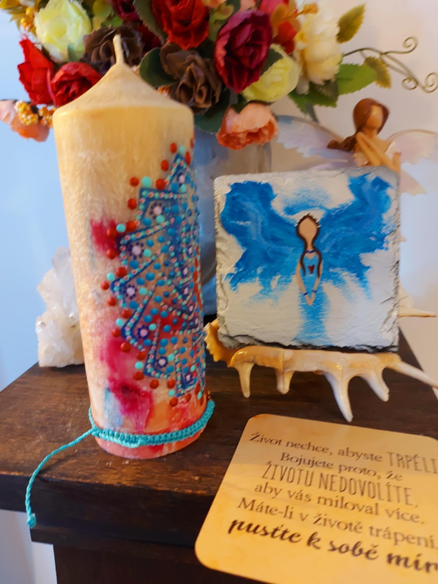 Minerál vložený do spodu svíčky projasňuje mysl, zvyšuje sebevědomí, přináší novou energií, zklidňuje. Podporuje trpělivost, moudrost a dokonalost. Pomáhá se sebezdokonalováním, samostatností, vytrvalostí. Zesiluje energii svíčky, Uvolňuje ji a reguluje, aby bylo dosaženo harmonie Palmový krystalický vosk 370 g, 16/6 cm, malba na svíčku akryl a tekuté perly. Podložka břidlice a akryl, Minerál ve svíčce,, esence divokých květů, Bachovy esence. Náramek posvátného záměru, pokud je součástí, doporučuji nosit po celou dobu procesu.