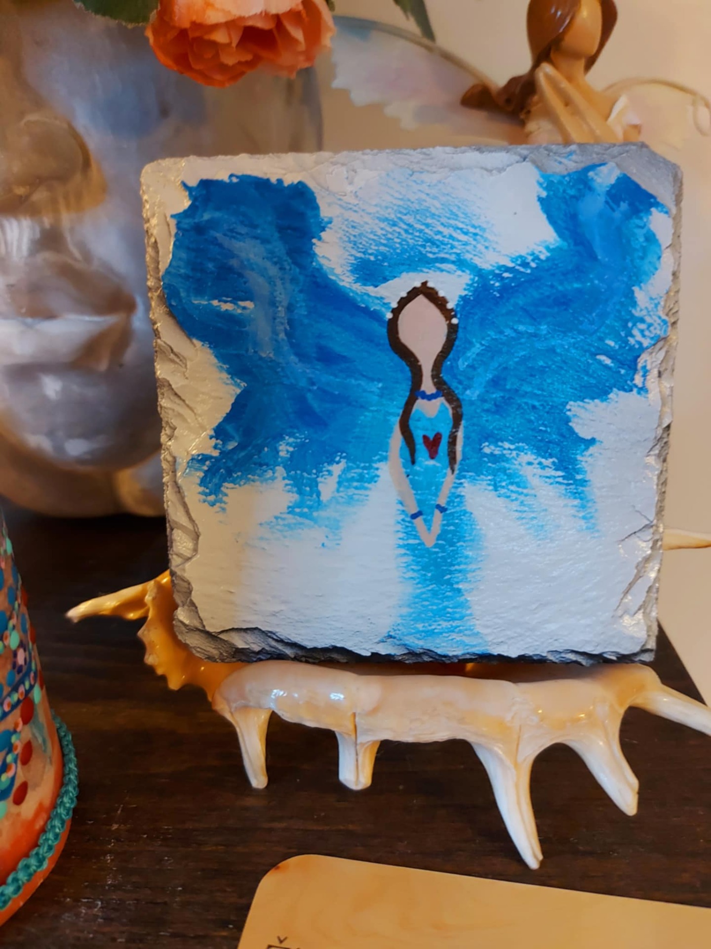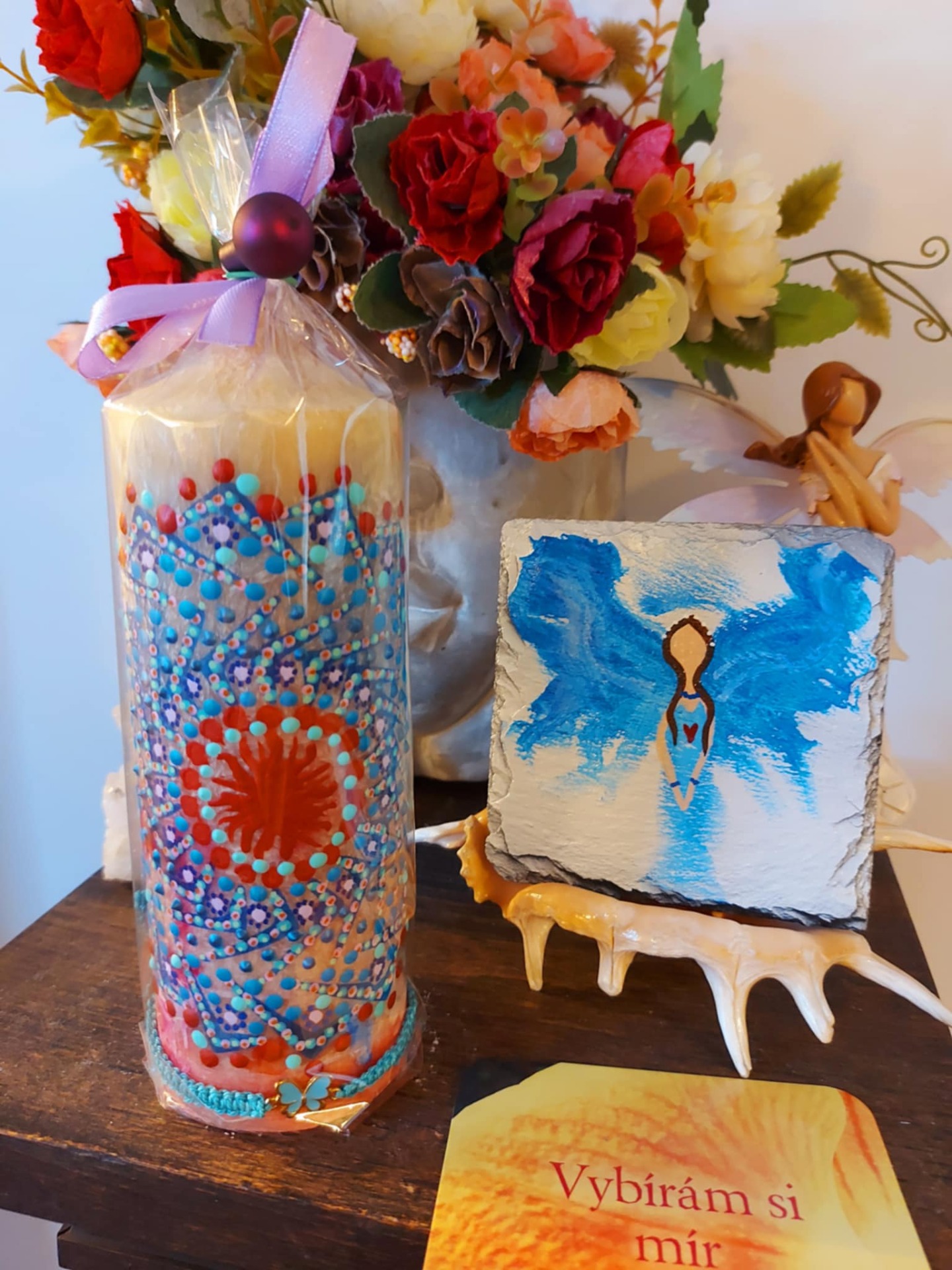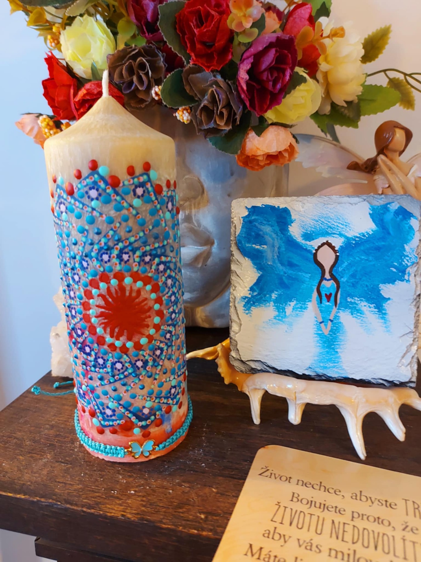 Minerál vložený do spodu svíčky projasňuje mysl, zvyšuje sebevědomí, přináší novou energií, zklidňuje. Podporuje trpělivost, moudrost a dokonalost. Pomáhá se sebezdokonalováním, samostatností, vytrvalostí. Zesiluje energii svíčky, Uvolňuje ji a reguluje, aby bylo dosaženo harmonie Palmový krystalický vosk 370 g, 16/6 cm, malba na svíčku akryl a tekuté perly. Podložka břidlice a akryl, Minerál ve svíčce,, esence divokých květů, Bachovy esence. Náramek posvátného záměru, pokud je součástí, doporučuji nosit po celou dobu procesu.