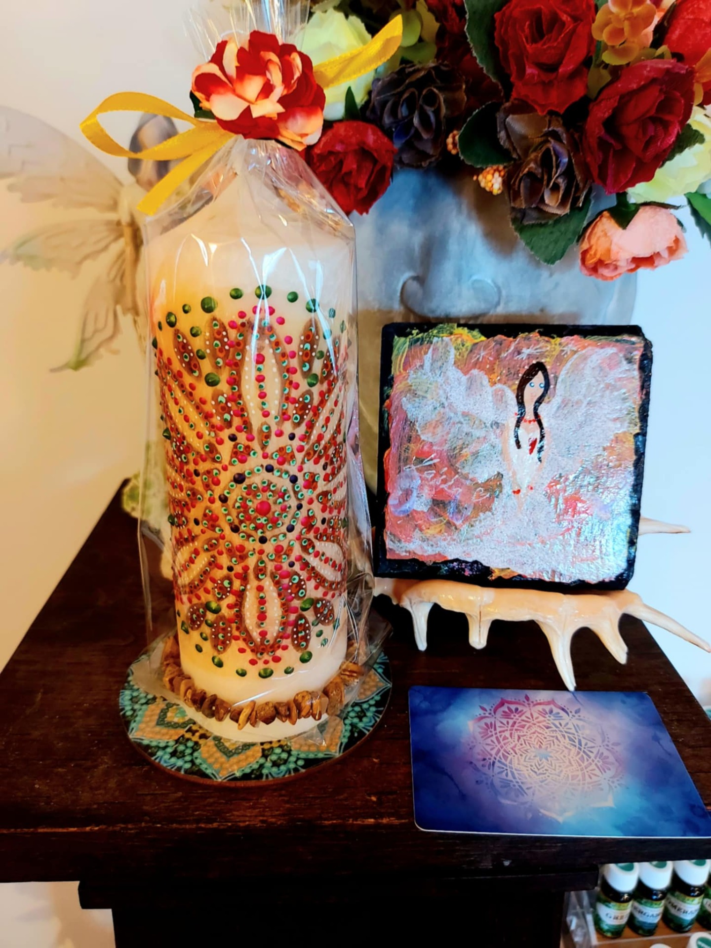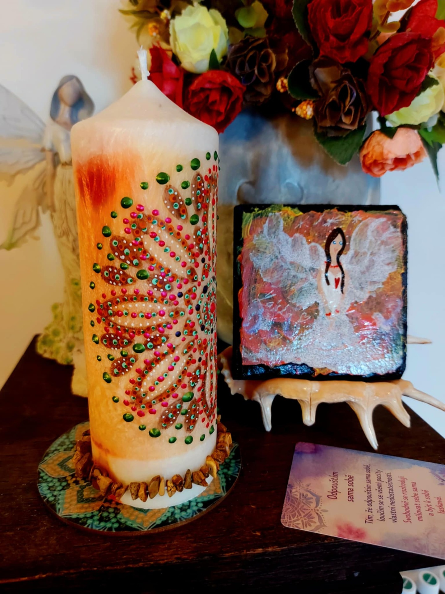 Minerál vložený do spodu svíčky projasňuje mysl, zvyšuje sebevědomí, přináší novou energií, zklidňuje. Podporuje trpělivost, moudrost a dokonalost. Pomáhá se sebezdokonalováním, samostatností, vytrvalostí. Zesiluje energii svíčky, Uvolňuje ji a reguluje, aby bylo dosaženo harmonie Palmový krystalický vosk 370 g, 16/6 cm, malba na svíčku akryl a tekuté perly. Podložka břidlice a akryl, Minerál ve svíčce,, esence divokých květů, Bachovy esence  jemně podporují proces, kdy se člověk přestává držet kontroly a dovolí životu, aby jej vedl. Náramek posvátného záměru, pokud je součástí, doporučuji nosit po celou dobu procesu.