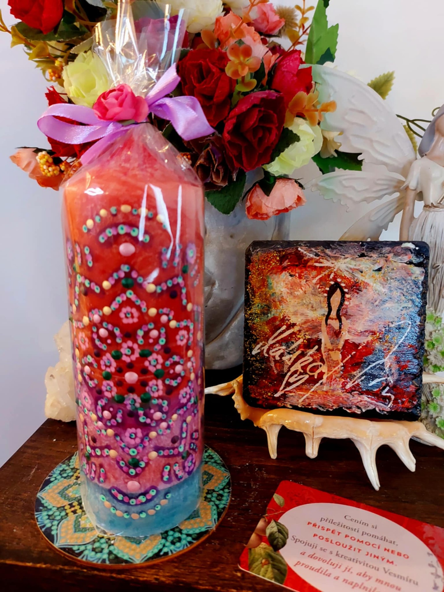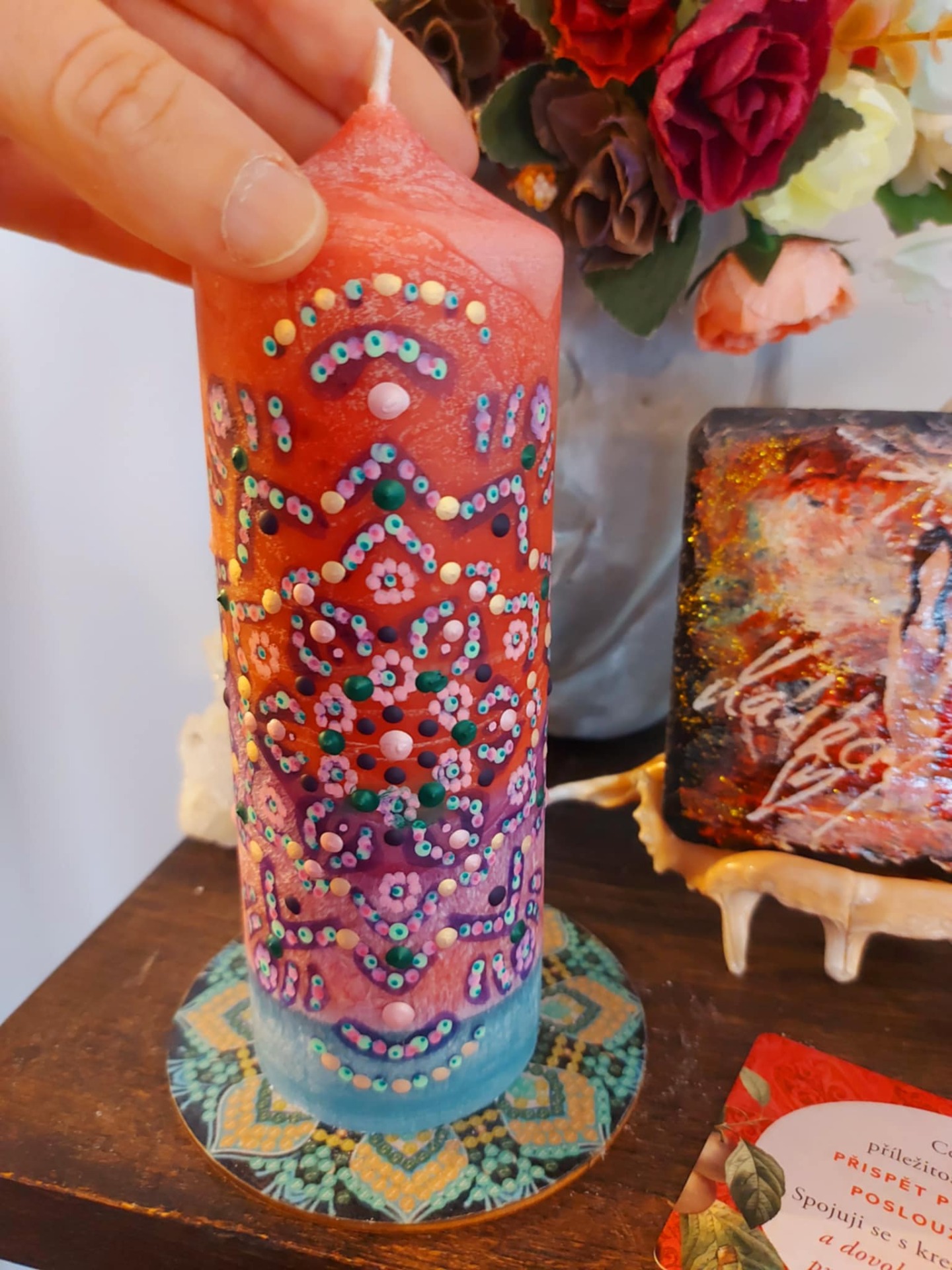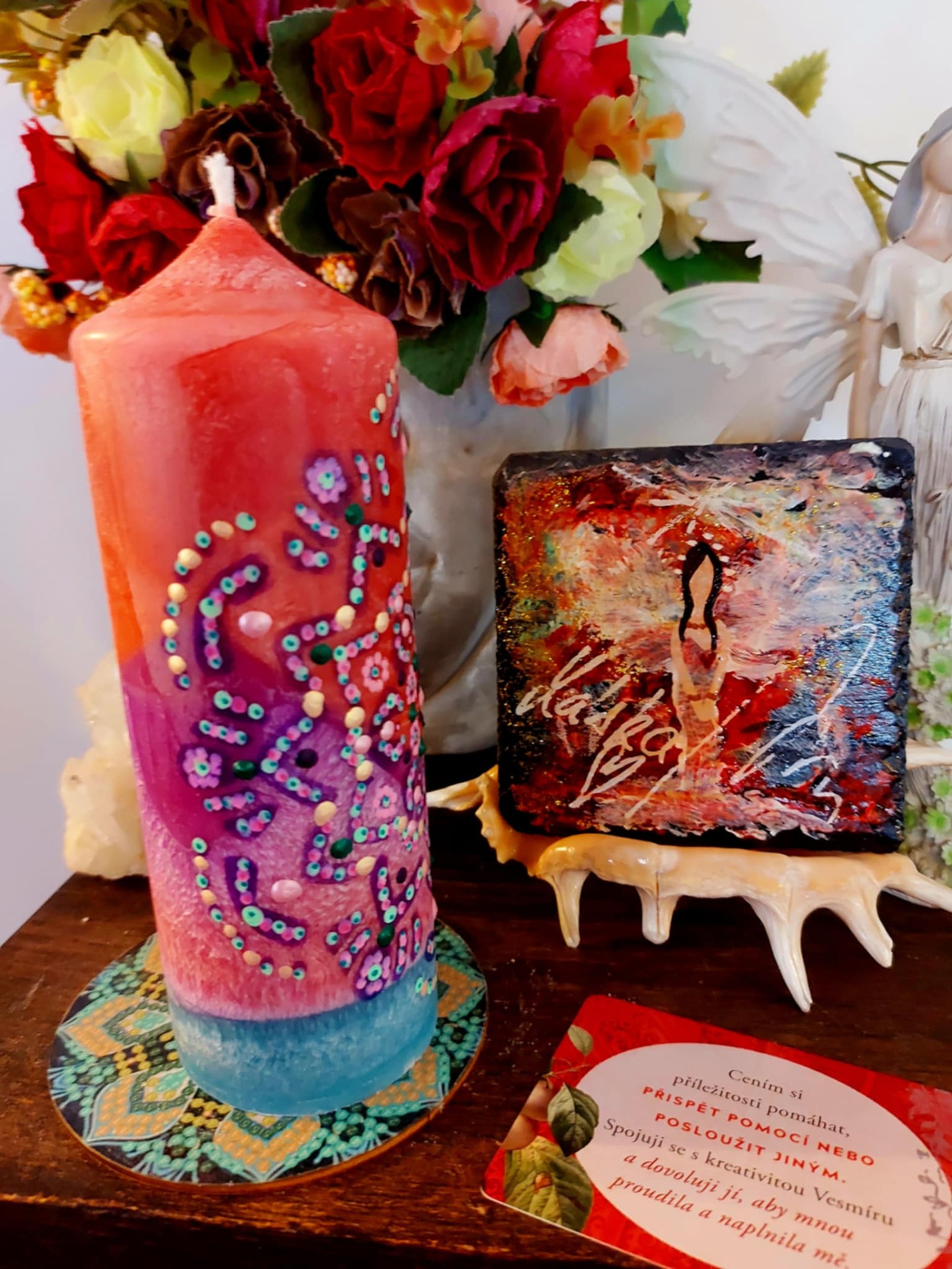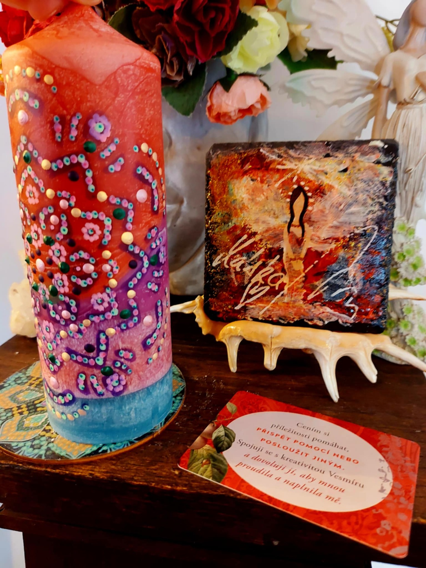 Najdi si tiché místo. Svíčka hoří. Napij se vody. Buď v těle. A dýchej… Zavři oči a představ si, že ve tvém srdci doutná jemný plamínek. Malý, tichý, ale jistý. Je to oheň, který tvoří. Nadechni se do hrudníku – jemně, bez námahy. S každým nádechem plamen sílí. S každým výdechem tiše šeptá: