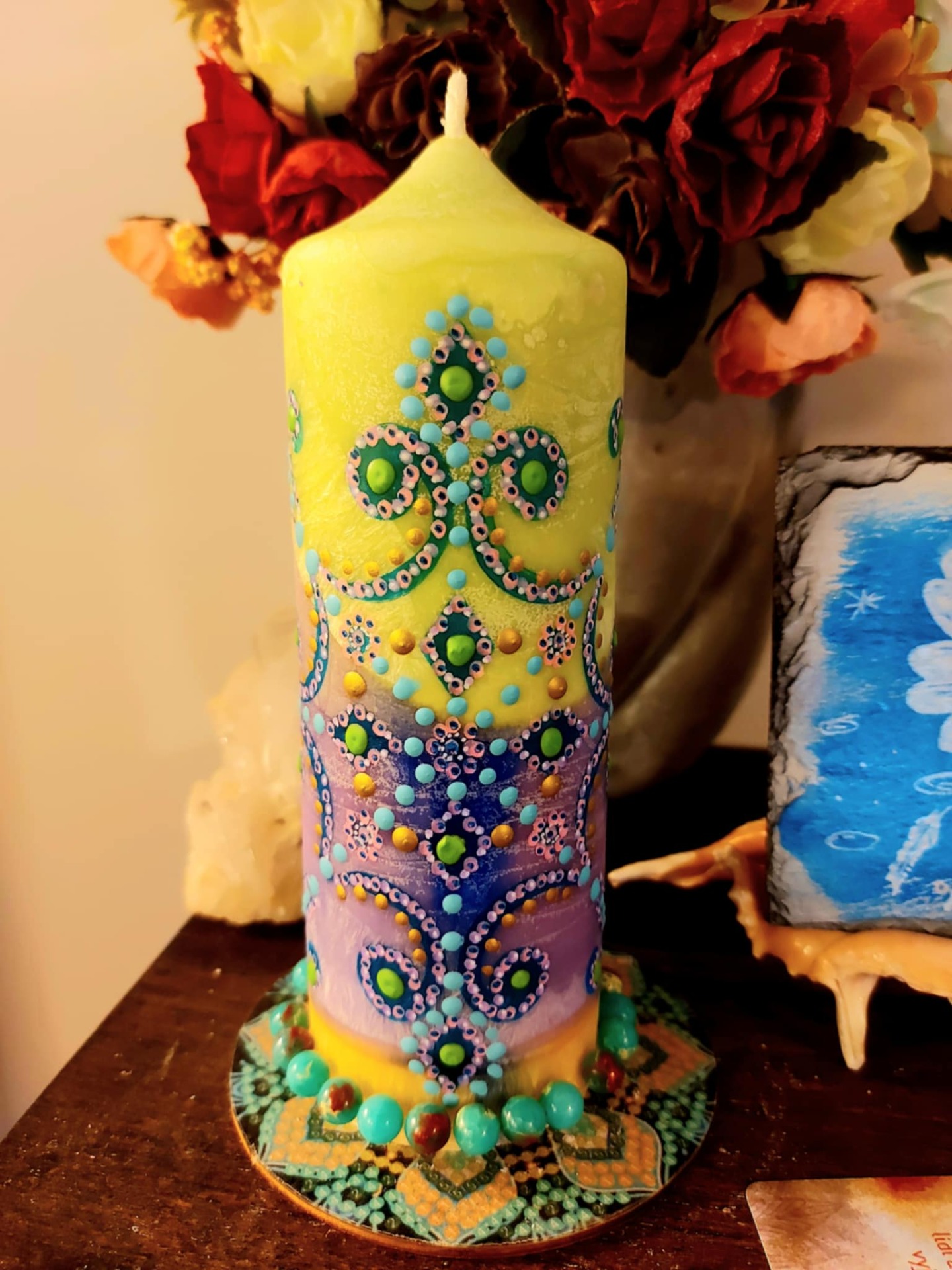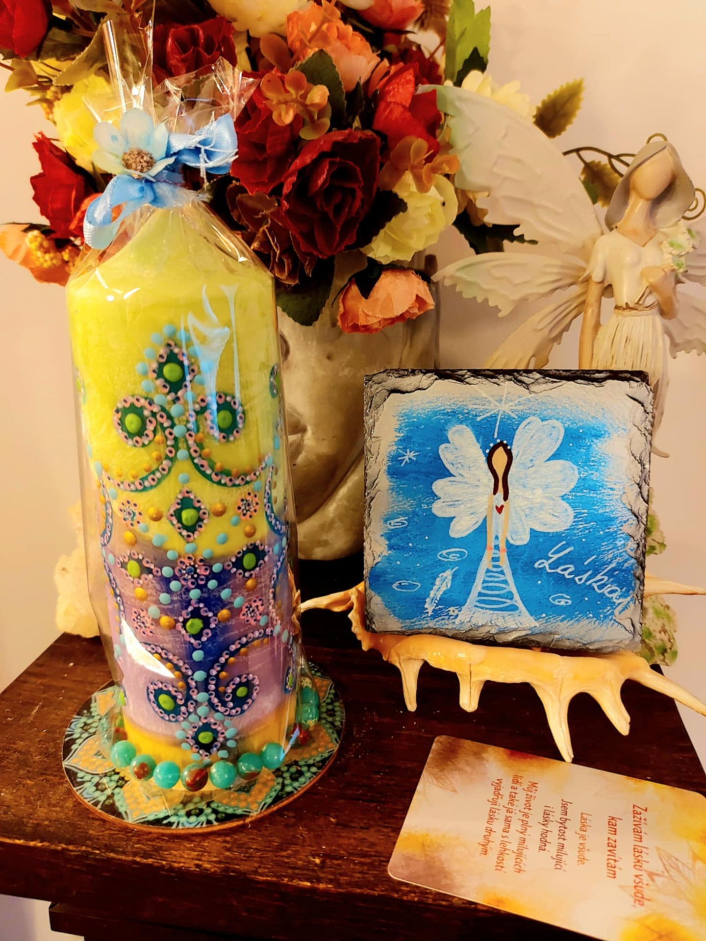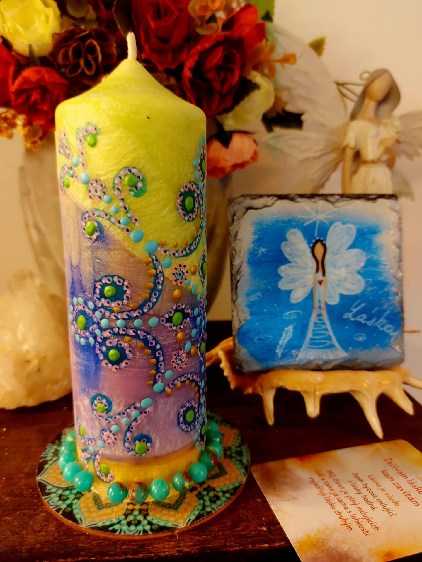 Minerál vložený do spodu svíčky projasňuje mysl, zvyšuje sebevědomí, přináší novou energií, zklidňuje. Podporuje trpělivost, moudrost a dokonalost. Pomáhá se sebezdokonalováním, samostatností, vytrvalostí. Zesiluje energii svíčky, Uvolňuje ji a reguluje, aby bylo dosaženo harmonie Palmový krystalický vosk 370 g, 16/6 cm, malba na svíčku akryl a tekuté perly. Podložka břidlice a akryl, Minerál ve svíčce,, esence divokých květů, Bachovy esence. Náramek posvátného záměru, pokud je součástí, doporučuji nosit po celou dobu procesu.