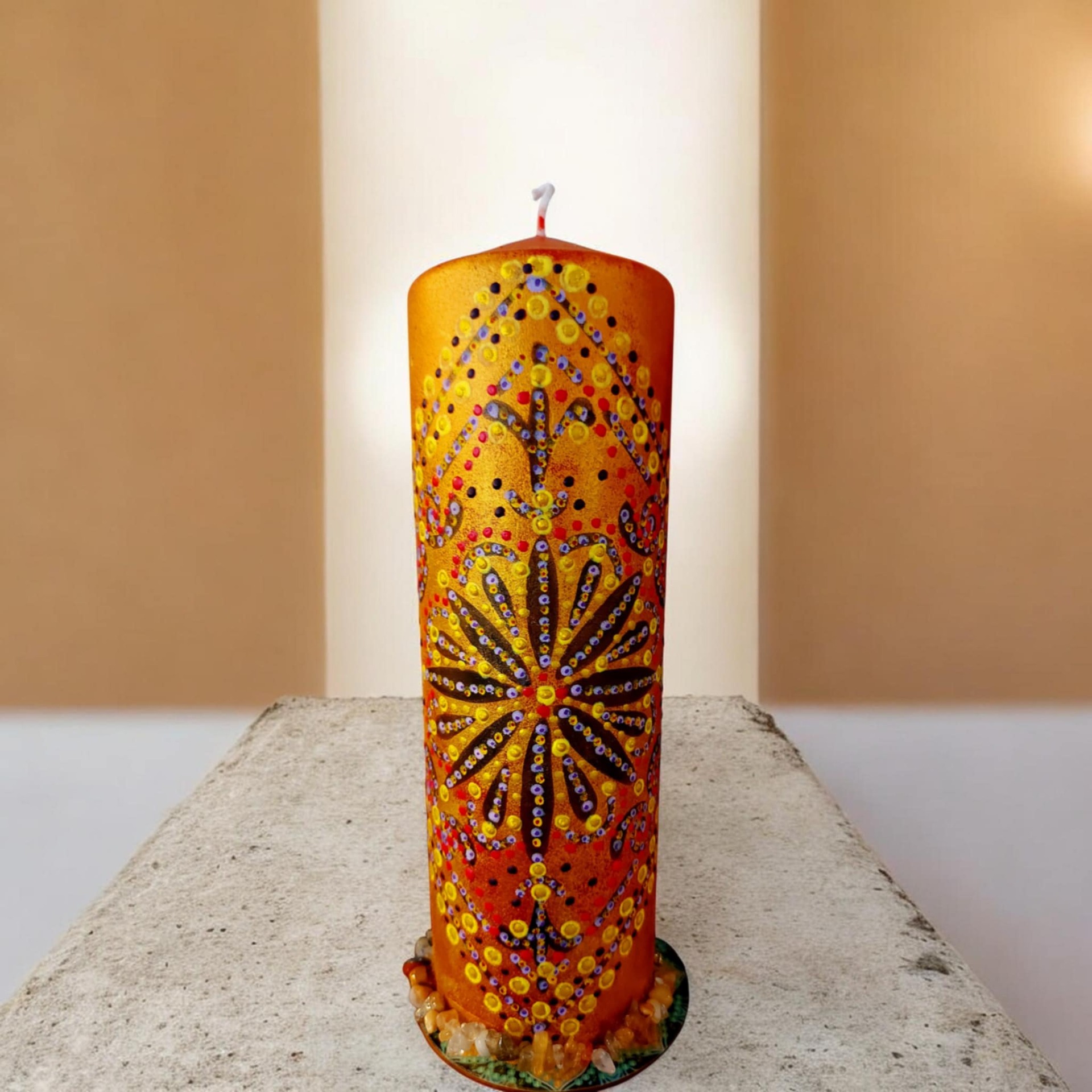 Parafín, 940 g, 22/8 cm, malba na svíčku akryl a tekuté perly, minerál, podložka břidlice , akryl.