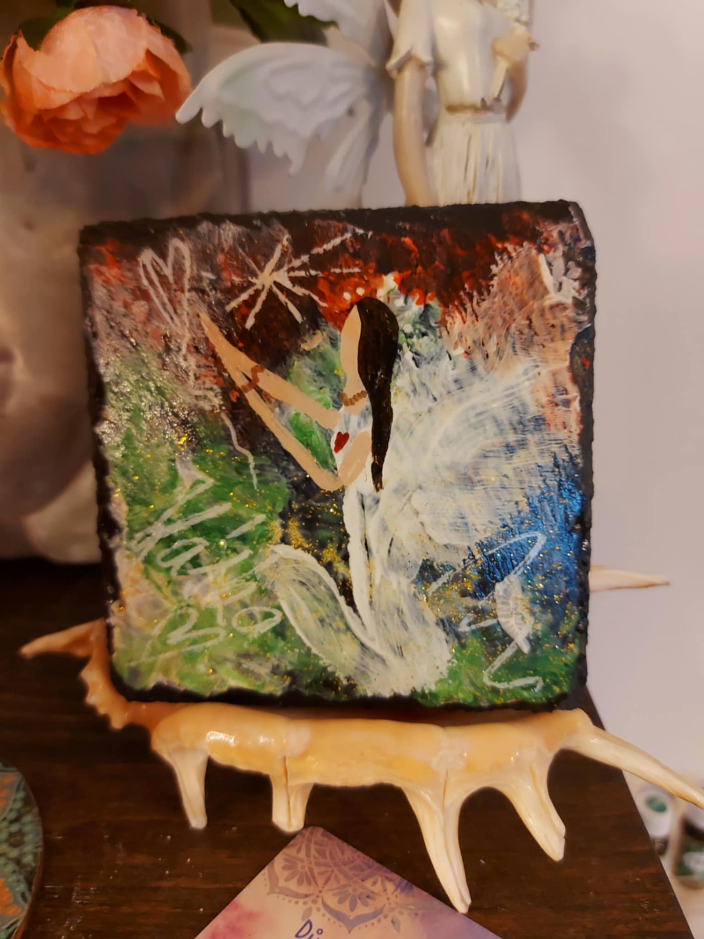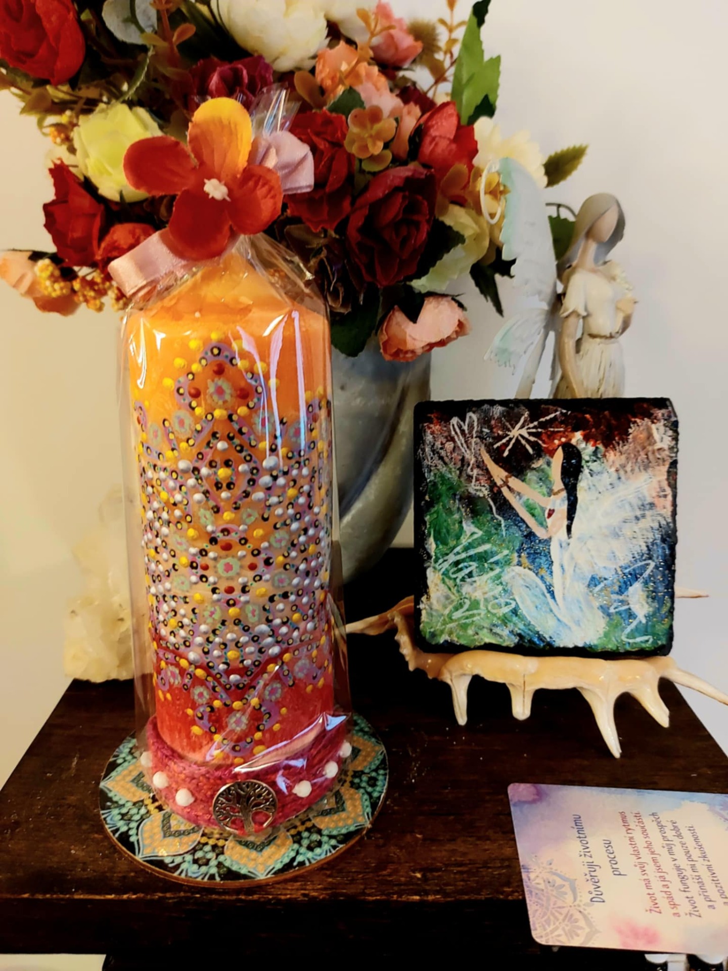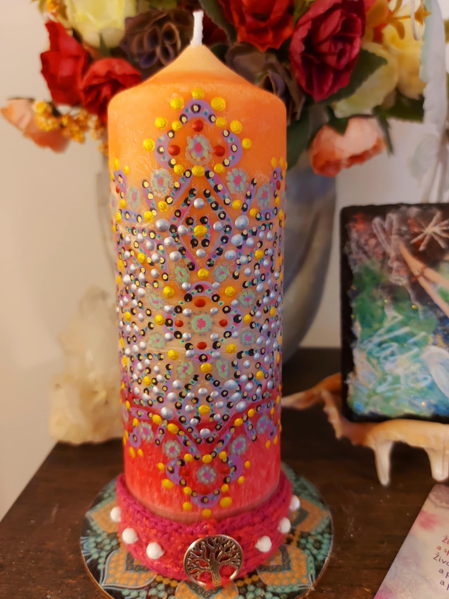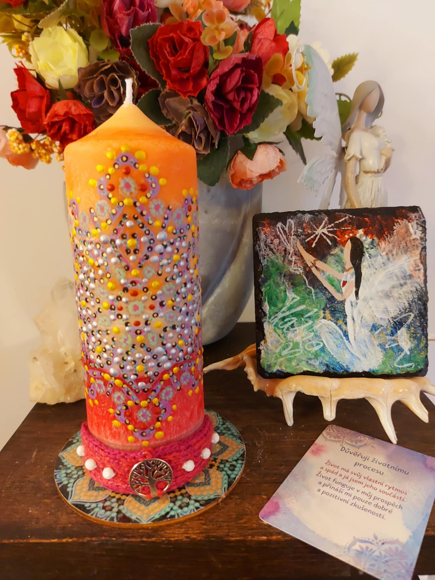 Minerál vložený do spodu svíčky projasňuje mysl, zvyšuje sebevědomí, přináší novou energií, zklidňuje. Podporuje trpělivost, moudrost a dokonalost. Pomáhá se sebezdokonalováním, samostatností, vytrvalostí. Zesiluje energii svíčky, Uvolňuje ji a reguluje, aby bylo dosaženo harmonie Palmový krystalický vosk 370 g, 16/6 cm, malba na svíčku akryl a tekuté perly. Podložka břidlice a akryl, Minerál ve svíčce,, esence divokých květů, Bachovy esence. Náramek posvátného záměru, pokud je součástí, doporučuji nosit po celou dobu procesu.