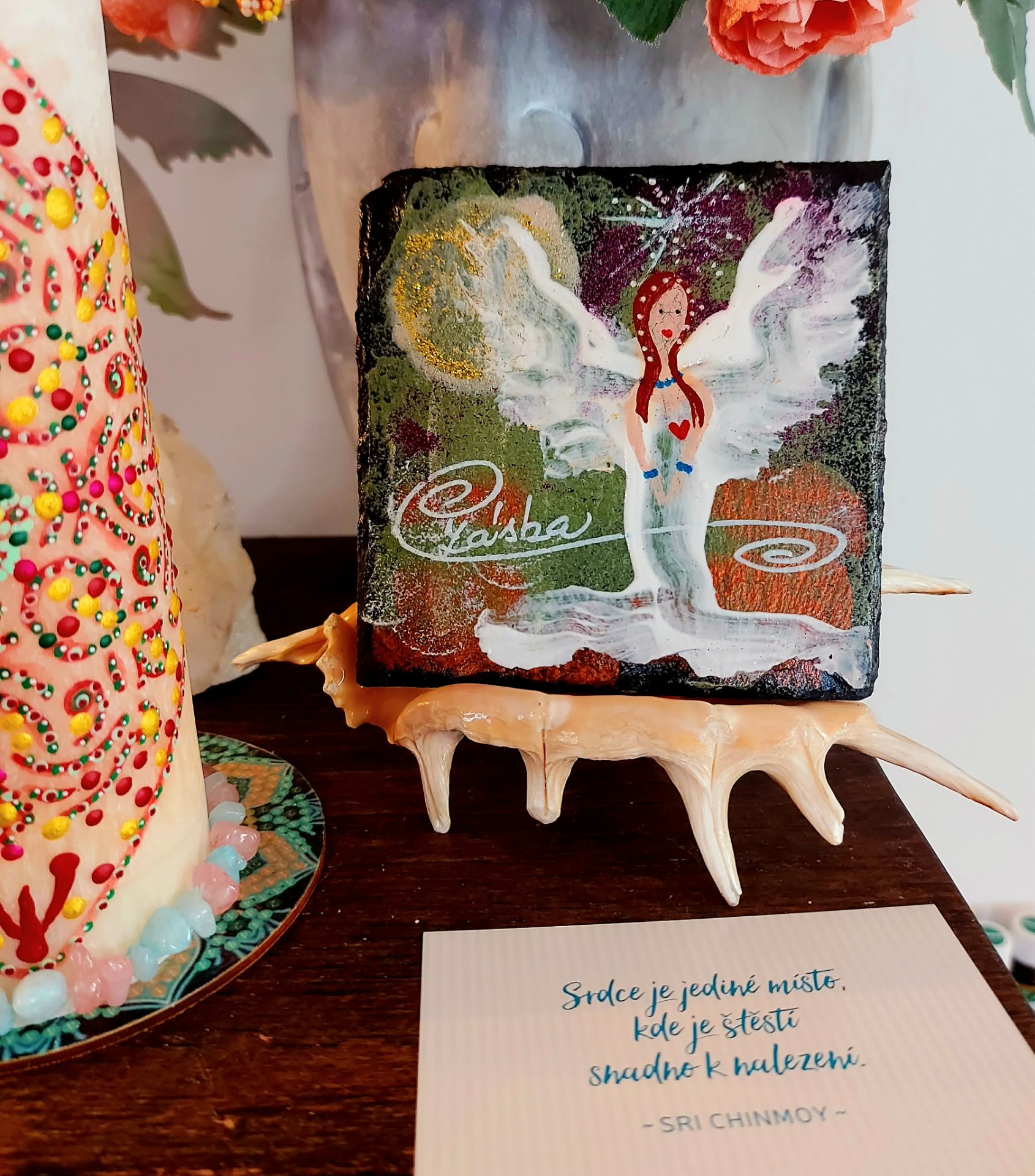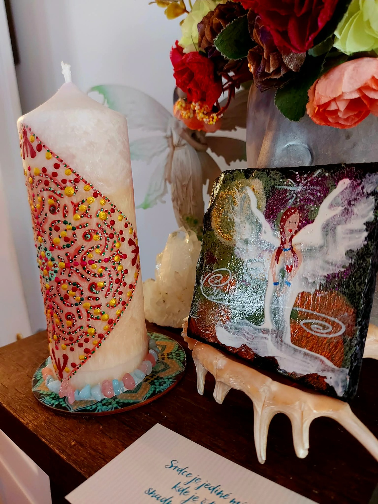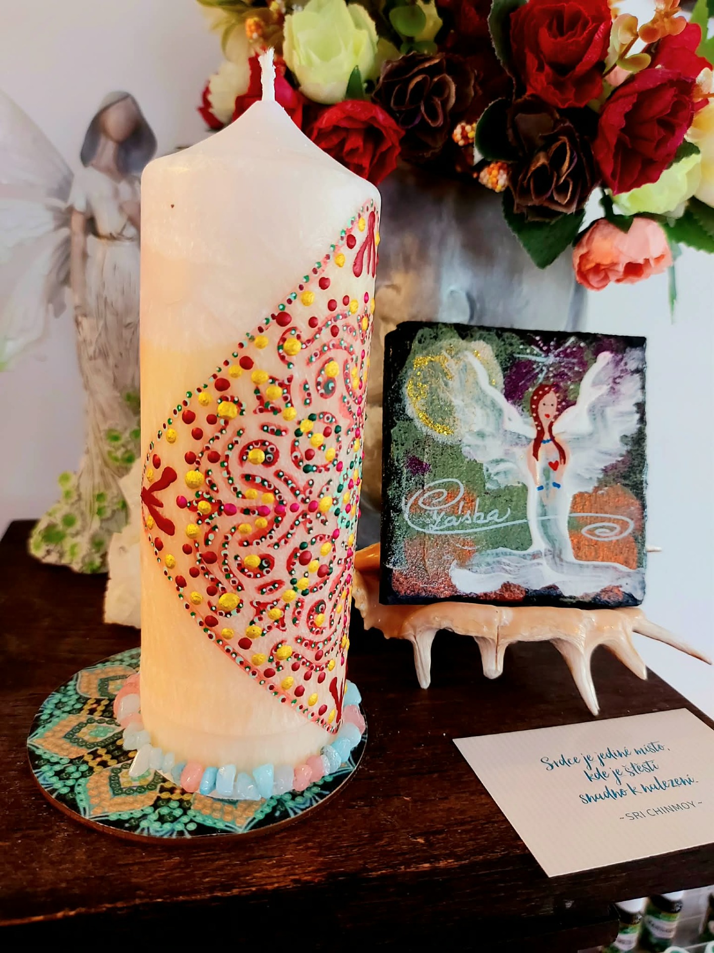 Cítíš, jak tě ten prostor přijímá… bez podmínek… bez hodnocení. Pomalu ponoříš ruce do vody. A v tu chvíli začneš vnímat, jak se něco v tobě uvolňuje. Staré příběhy… staré bolesti… očekávání… Všechno, co už nepotřebuješ nést, se rozpouští v tom prameni. Teď si představ, že z hlubin vody začne stoupat jemné světlo. Dotýká se tvých rukou… prochází do tvého těla… a postupně zaplňuje celé tvé nitro. To světlo v sobě nese nový začátek jako tichou, přirozenou možnost. Vnímej, kde v sobě cítíš jemné "ano". Možná je to pocit. Možná obraz. Možná jen klid. To je směr. Zůstaň chvíli v tom prostoru… a dovol, aby se ten nový začátek v tobě ukotvil. Až budeš připravená, vrať se zpět do svého dechu. Pomalu otevři oči… a nech plamen svíčky dál pracovat za tebe. BACHOVY ESENCE : Walnut – klíčová esence pro nové začátky, ochrana při změnách, přestřižení starých vazeb. Star of Bethlehem – jemné uzdravení starých bolestí a šoků, které brání otevření srdce. Honeysuckle – uvolnění pout k minulosti, návrat do přítomnosti. Wild Rose – probuzení radosti ze života, znovuobjevení chuti tvořit. Gentian – podpora víry ve směr i ve chvílích pochybností Minerál vložený do spodu svíčky projasňuje mysl, zvyšuje sebevědomí, přináší novou energií, zklidňuje. Podporuje trpělivost, moudrost a dokonalost. Pomáhá se sebezdokonalováním, samostatností, vytrvalostí. Zesiluje energii svíčky, Uvolňuje ji a reguluje, aby bylo dosaženo harmonie Palmový krystalický vosk 370 g, 16/6 cm, malba na svíčku akryl a tekuté perly. Podložka břidlice a akryl, Minerál ve svíčce,, esence divokých květů, Bachovy esence jemně podporují proces, kdy se člověk přestává držet kontroly a dovolí životu, aby jej vedl. Náramek posvátného záměru, pokud je součástí, doporučuji nosit po celou dobu procesu.