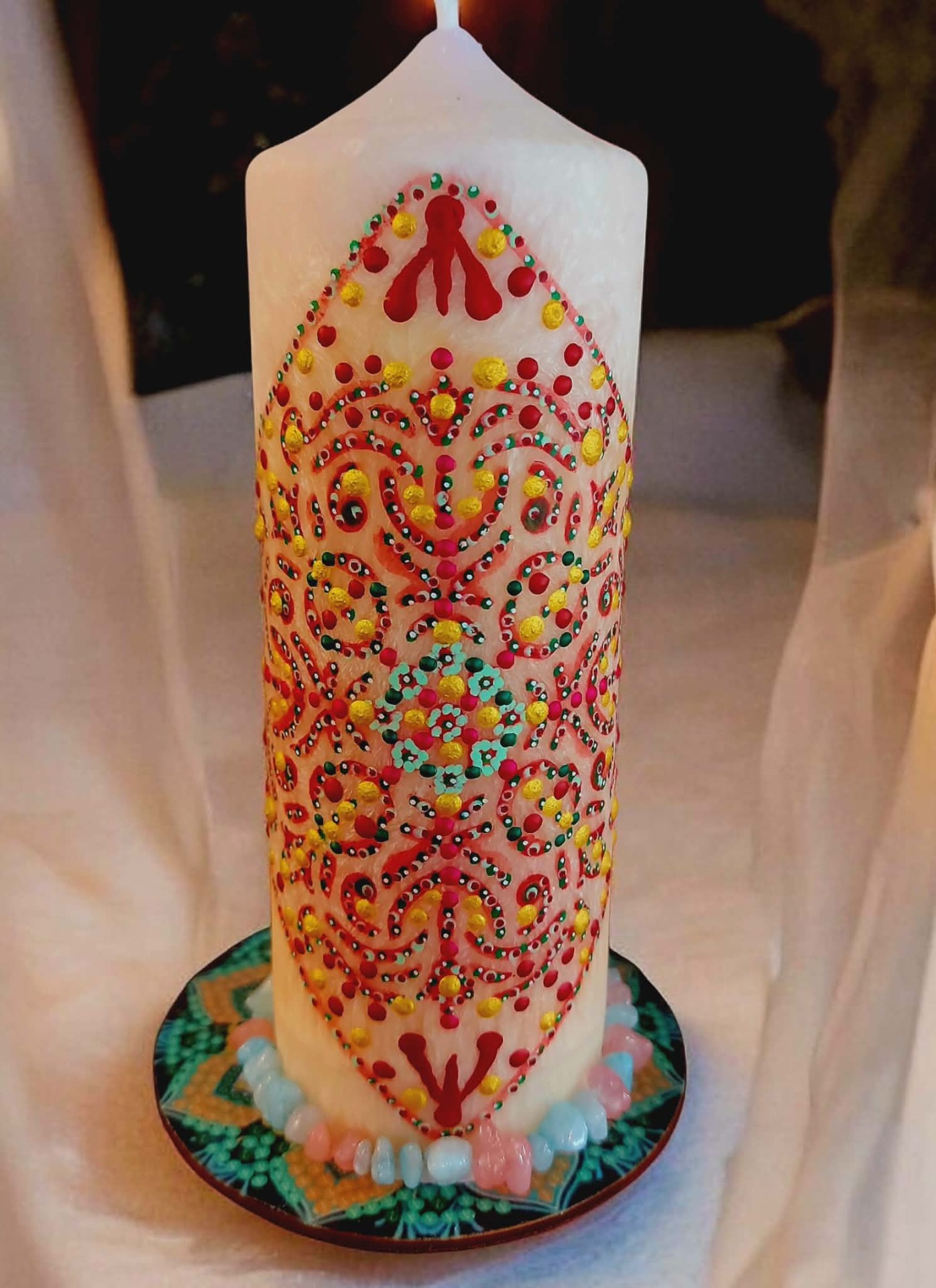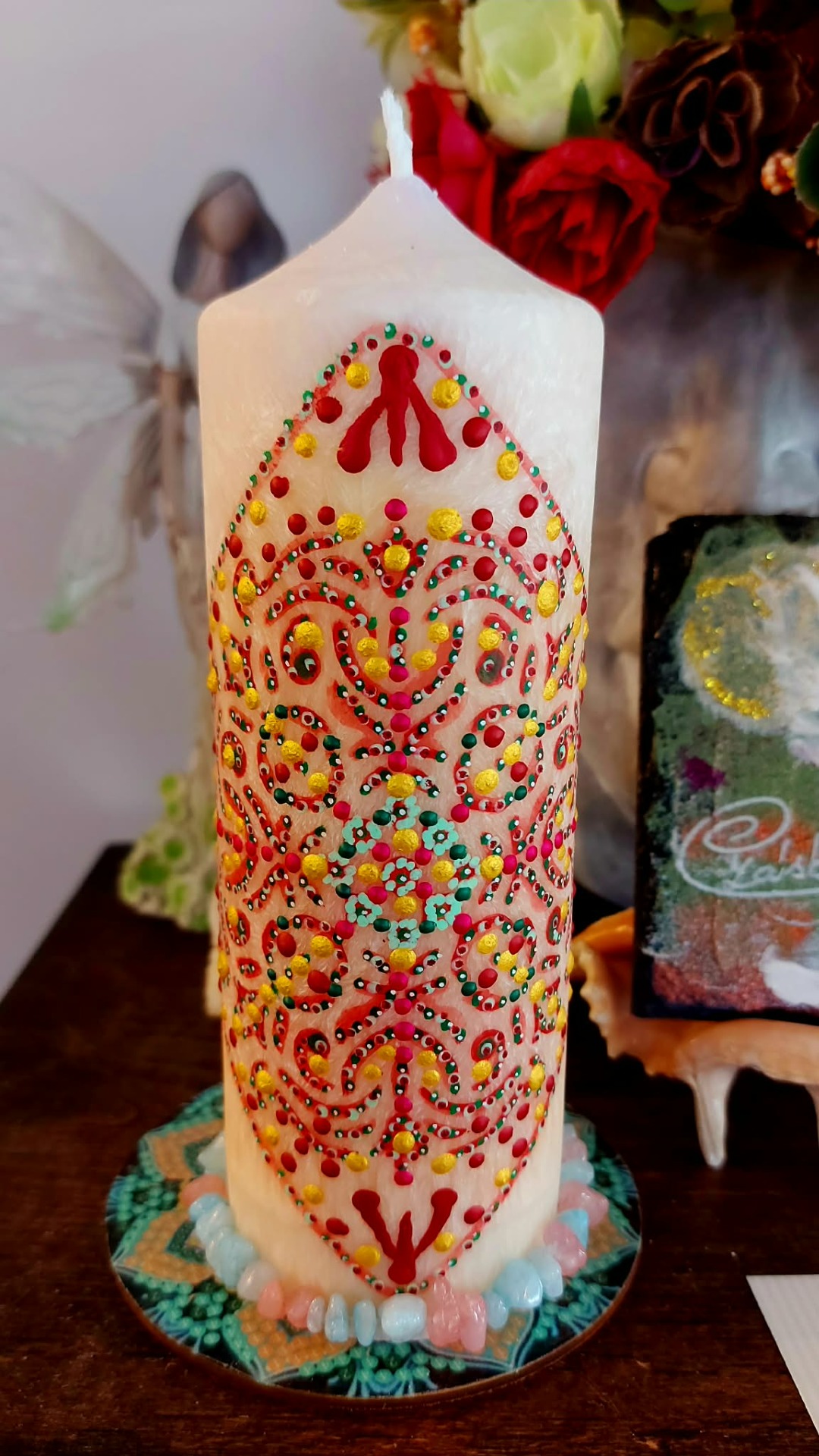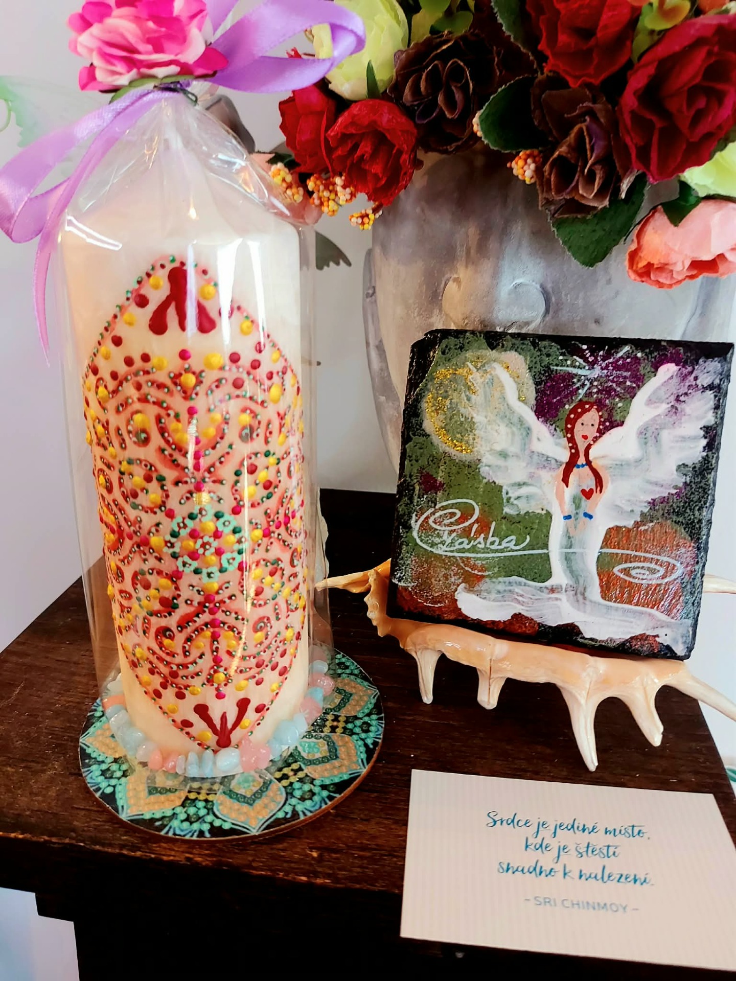 Cítíš, jak tě ten prostor přijímá… bez podmínek… bez hodnocení. Pomalu ponoříš ruce do vody. A v tu chvíli začneš vnímat, jak se něco v tobě uvolňuje. Staré příběhy… staré bolesti… očekávání… Všechno, co už nepotřebuješ nést, se rozpouští v tom prameni. Teď si představ, že z hlubin vody začne stoupat jemné světlo. Dotýká se tvých rukou… prochází do tvého těla… a postupně zaplňuje celé tvé nitro. To světlo v sobě nese nový začátek jako tichou, přirozenou možnost. Vnímej, kde v sobě cítíš jemné "ano". Možná je to pocit. Možná obraz. Možná jen klid. To je směr. Zůstaň chvíli v tom prostoru… a dovol, aby se ten nový začátek v tobě ukotvil. Až budeš připravená, vrať se zpět do svého dechu. Pomalu otevři oči… a nech plamen svíčky dál pracovat za tebe. BACHOVY ESENCE : Walnut – klíčová esence pro nové začátky, ochrana při změnách, přestřižení starých vazeb. Star of Bethlehem – jemné uzdravení starých bolestí a šoků, které brání otevření srdce. Honeysuckle – uvolnění pout k minulosti, návrat do přítomnosti. Wild Rose – probuzení radosti ze života, znovuobjevení chuti tvořit. Gentian – podpora víry ve směr i ve chvílích pochybností Minerál vložený do spodu svíčky projasňuje mysl, zvyšuje sebevědomí, přináší novou energií, zklidňuje. Podporuje trpělivost, moudrost a dokonalost. Pomáhá se sebezdokonalováním, samostatností, vytrvalostí. Zesiluje energii svíčky, Uvolňuje ji a reguluje, aby bylo dosaženo harmonie Palmový krystalický vosk 370 g, 16/6 cm, malba na svíčku akryl a tekuté perly. Podložka břidlice a akryl, Minerál ve svíčce,, esence divokých květů, Bachovy esence jemně podporují proces, kdy se člověk přestává držet kontroly a dovolí životu, aby jej vedl. Náramek posvátného záměru, pokud je součástí, doporučuji nosit po celou dobu procesu.
