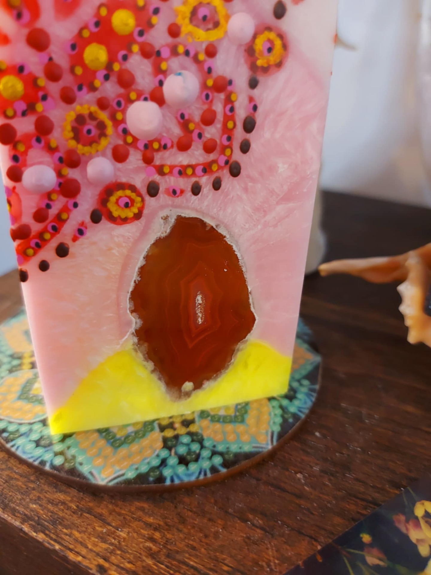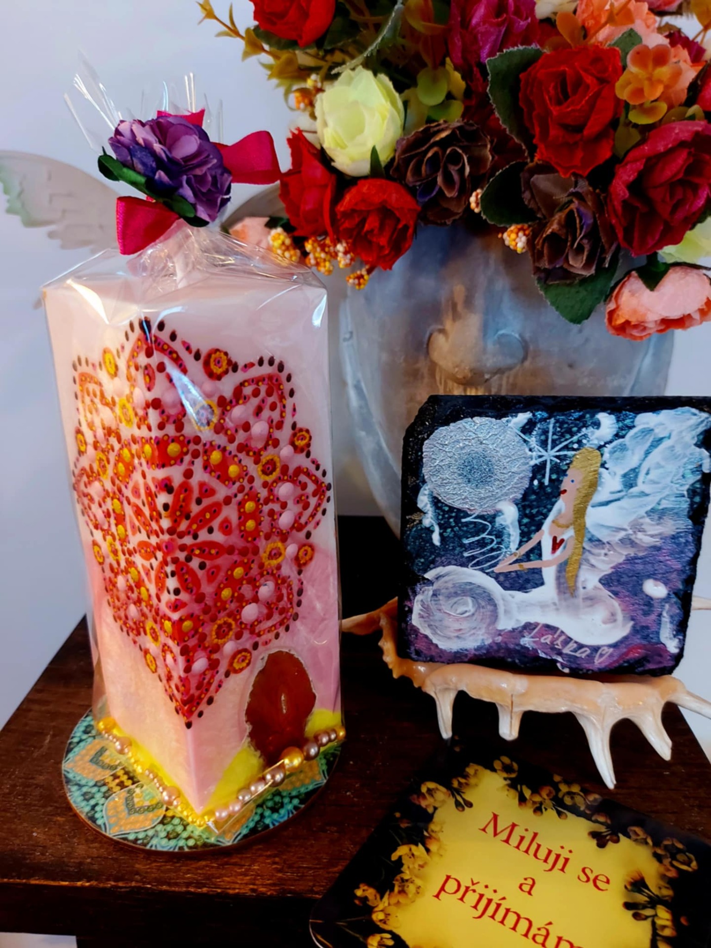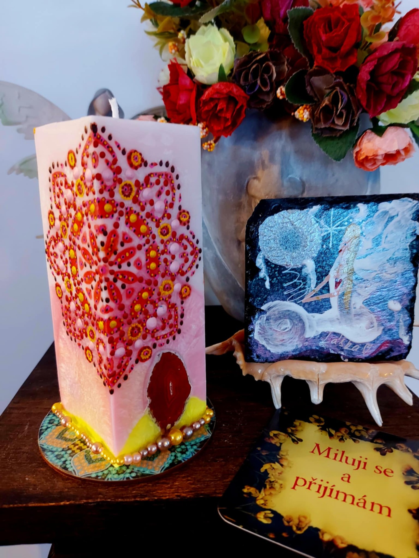 Bachovy květové esence – Láska & Sebepřijetí- Larch – posílení sebedůvěry, pocit "jsem dost dobrá", Pine – uvolnění viny, sebekritiky a pocitu selhání, Crab Apple – přijetí vlastního těla a vnitřní očista, Star of Bethlehem – hojení starých citových ran a traumat, Holly – otevření srdce, léčení zraněné lásky a žárlivosti. Dovol si být láskou, kterou hledáš. Achát udržuje stabilitu všude tam, kam jej umístíte a stejně tak i v naší mysli. Tento kámen je vhodný snad pro každého a svou příjemnou, harmonizující energií si získá srdce každého. Posílí sebedůvěru i vnitřní sílu. Má velmi široké využití zejména v psychické oblasti. S achátem se už nikdy nebudete cítit méněcenní. Achát vás podpoří když ve svém životě potřebujete stabilitu a uzemnění. 490g, palmový vosk, 6,5/6,5/16 cm, vonná esence divoké květy, podložka břidlice, akryl.Pro pro očistný proces, aby mohl působit jsou zakomponovány Bachovy esence..Náramek, pokud je součástí doporučuji nosit po celou dobu procesu. Jak pracovat se záměrem: Zapálením svíčky se aktivuje a uvolňuje její vibrační síla, která během hoření intenzivně působí na své okolí. Tato energie ovlivňuje prostor i všechny přítomné, proto je důležité s ní pracovat vědomě a s respektem.Pokud cítíte, že ještě nenastal čas svíčku zapálit, důvěřujte tomu. Vědomý záměr, který ve svíčce je, i tak působí. I když nehoří, její vibrace, časový klíč a energetické pole jsou přítomny ve Vašem prostoru a propojují se s Vámi. Před zapálením: Vložte do svíčky pozitivní záměr nebo přání. Pokud je přiložený text součástí rituálu, můžete ho využít, případně si vytvořit vlastní. Obsah záměru si vizualizujte a napojte se na něj. Při dalším zapalování: Pokud svíčku používáte opakovaně, původní záměr již neměňte. Zachovejte kontinuitu energie, kterou jste do svíčky vložili. Bezpečné použití svíčky: Umístěte svíčku na nehořlavou podložku s dostatečným objemem, aby zachytila případný vosk. Pokud svíčku používáte pro terapeutické účely, může se stát, že praskne a rychle vyteče. To je známka intenzivního zpracování energie řešeného problému. Po ztuhnutí vyteklého vosku celý obsah zlikvidujte. Nezkoušejte vosk znovu použít, například na výrobu další svíčky. Obsahuje zpracované energie, emoce a disharmonii spojenou s vaším tématem, kterou je nutné zcela odstranit. Osobní podpora: Pokud je vaše téma hluboko skryté a nevíte, jak ho uchopit, nabízím vytvoření Osobní lahvičky na míru. Tato lahvička, vytvořená na základě konzultace, může pomoci odhalit váš skrytý potenciál a přivést ho na světlo. Využívám Bachovy esence, které účinně podporují harmonizaci emocí a duševní rovnováhu. Kontakt: e-mail: jablickova@seznam.cz Svíčky jsou mocným nástrojem pro transformaci. Respektujte jejich energii a využijte je jako spojence na své cestě ke klidu, sebepoznání.Upozornění: Svíčka nenahrazuje odbornou lékařskou pomoc. Uživatel je zodpovědný sám za sebe, za své myšlenky, pocity i duševní rovnováhu.