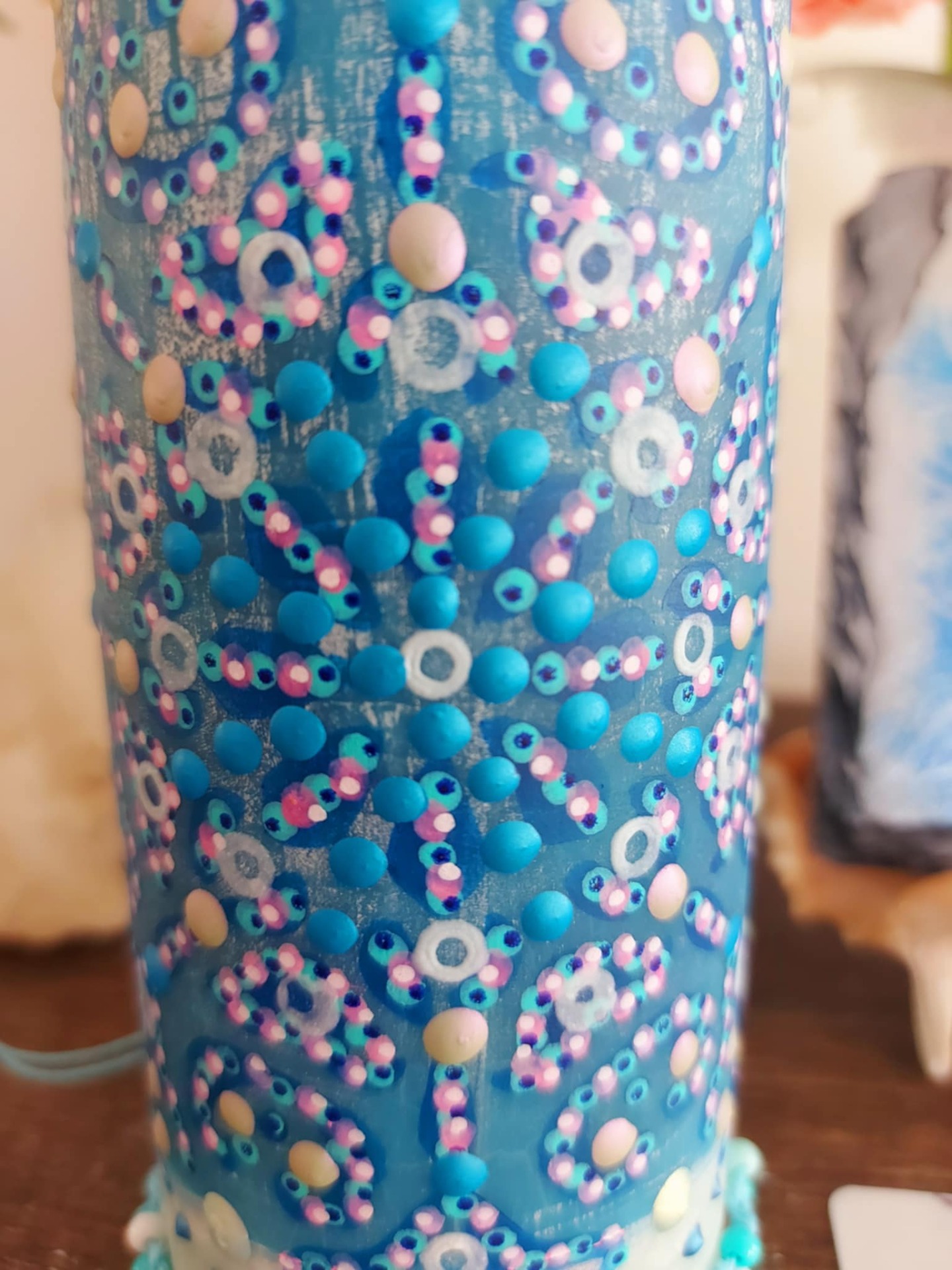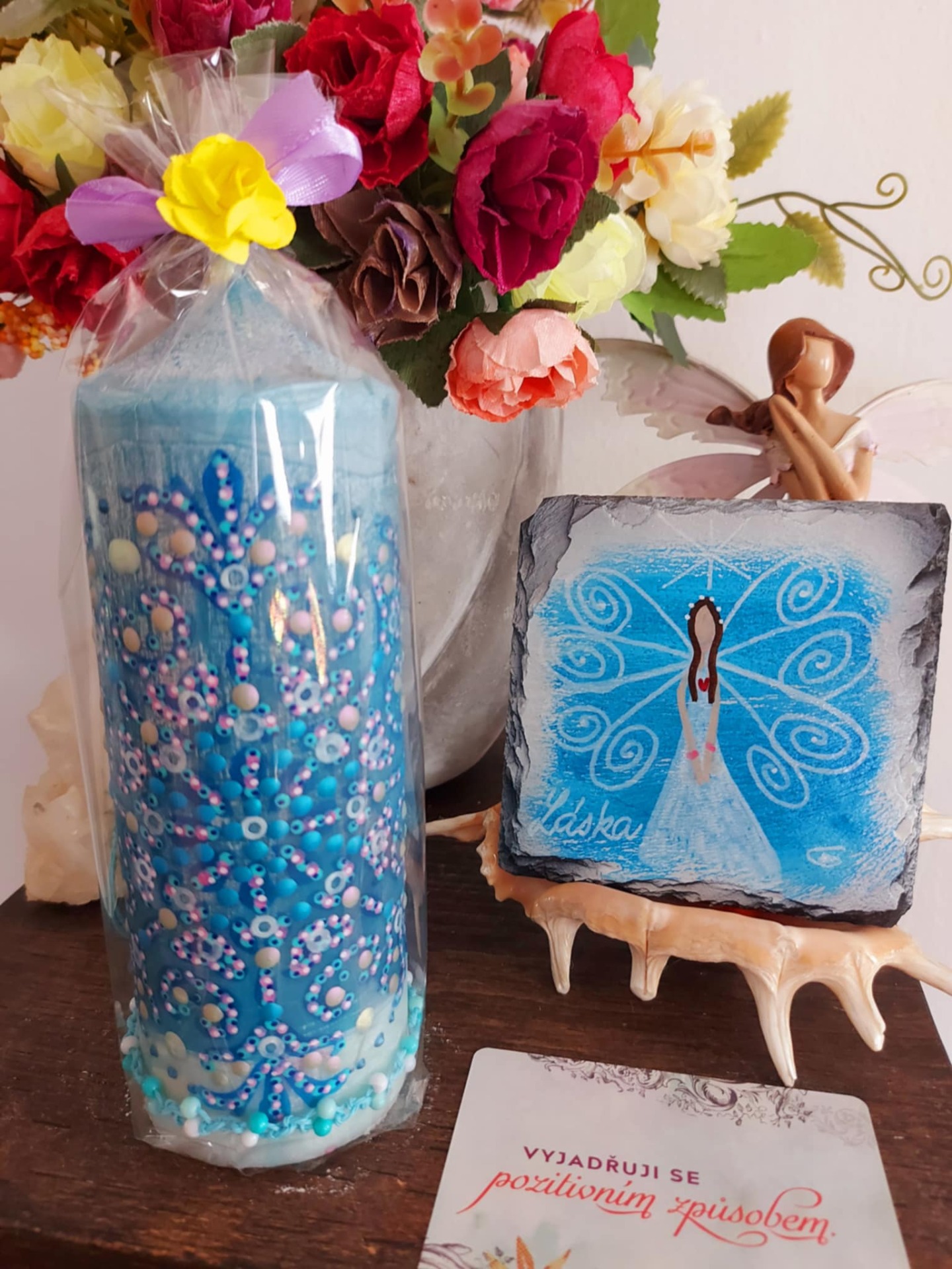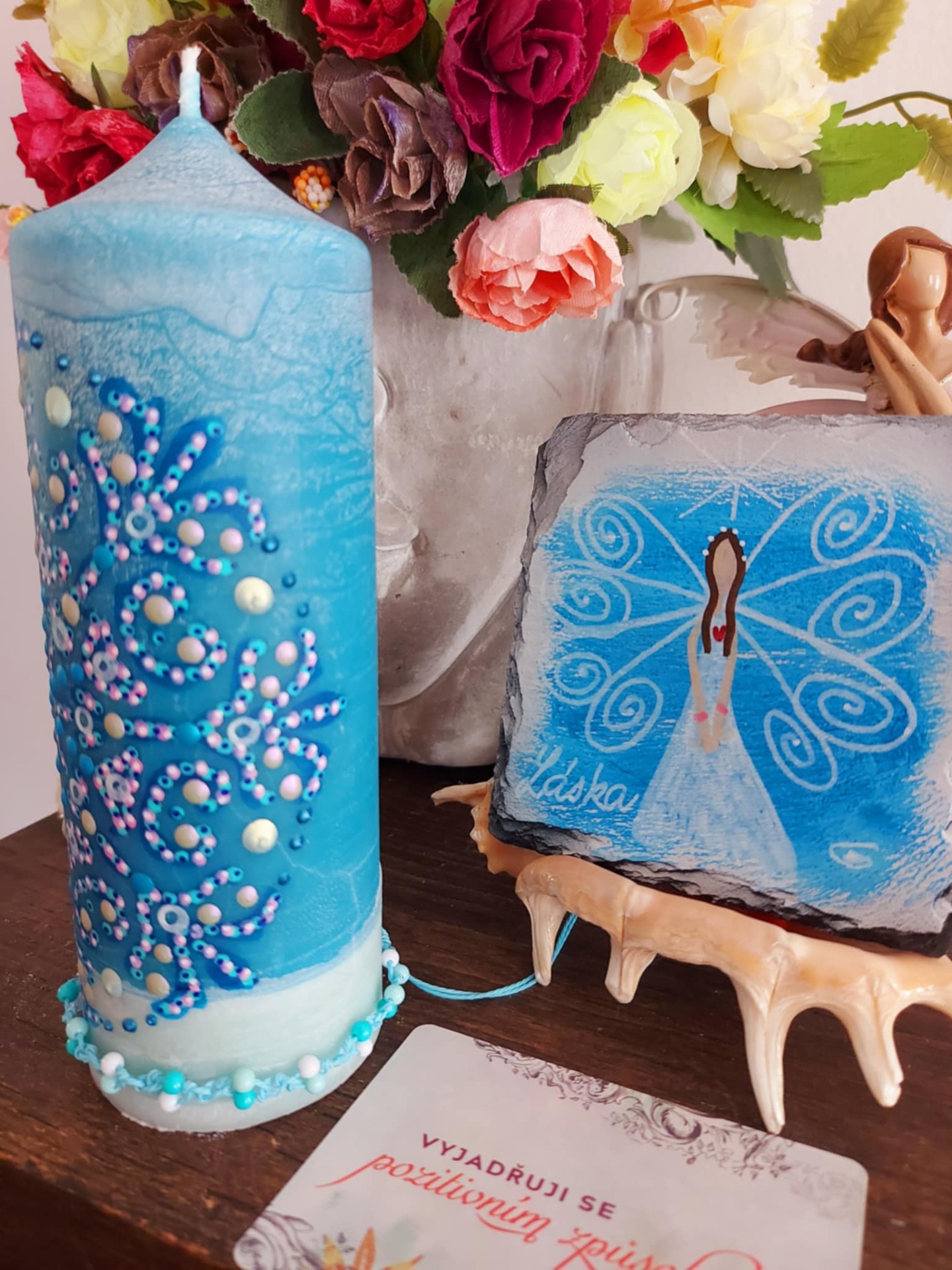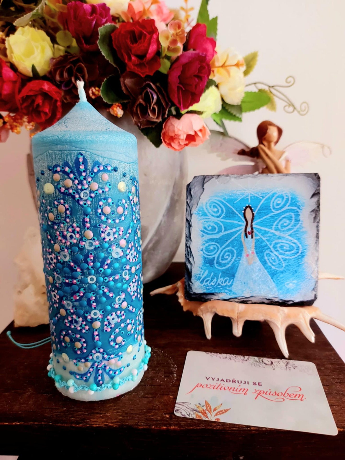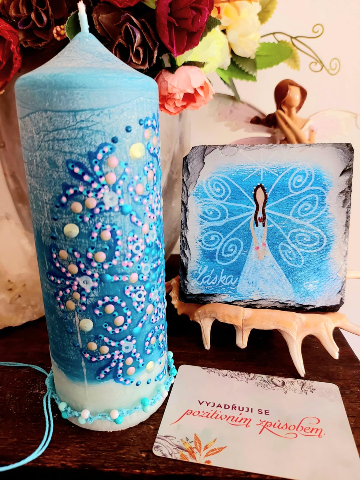 Symbolika a energie: Mandala na svíčce odráží světle modrou barvu páté čakry, která symbolizuje čistotu myšlenek, odvahu k vyjádření a důvěru ve vlastní hlas. Energie svíčky napomáhá napravit vztah k sobě i ostatním a posiluje pocit bezpečí, které vychází z naší mysli a srdce.