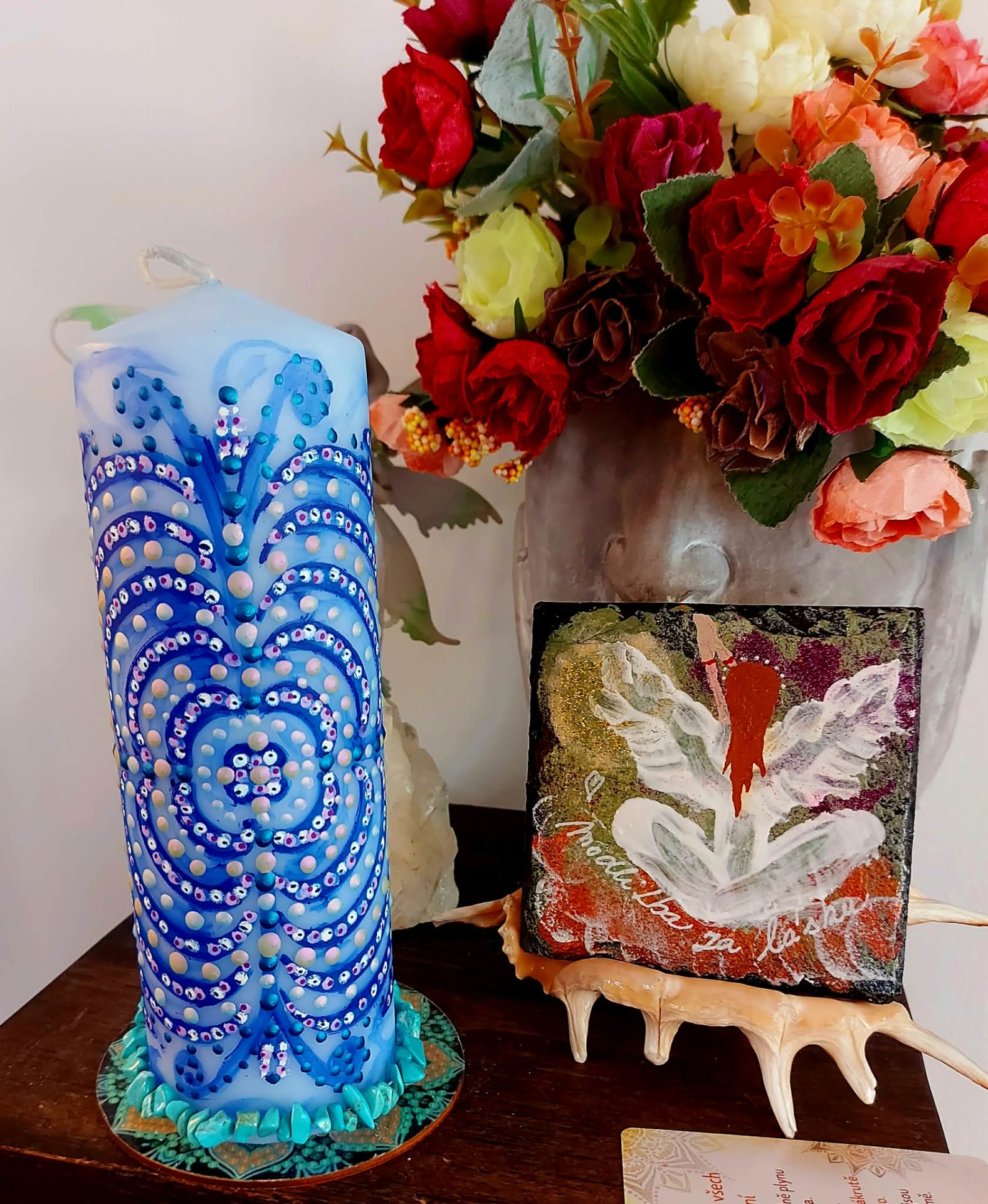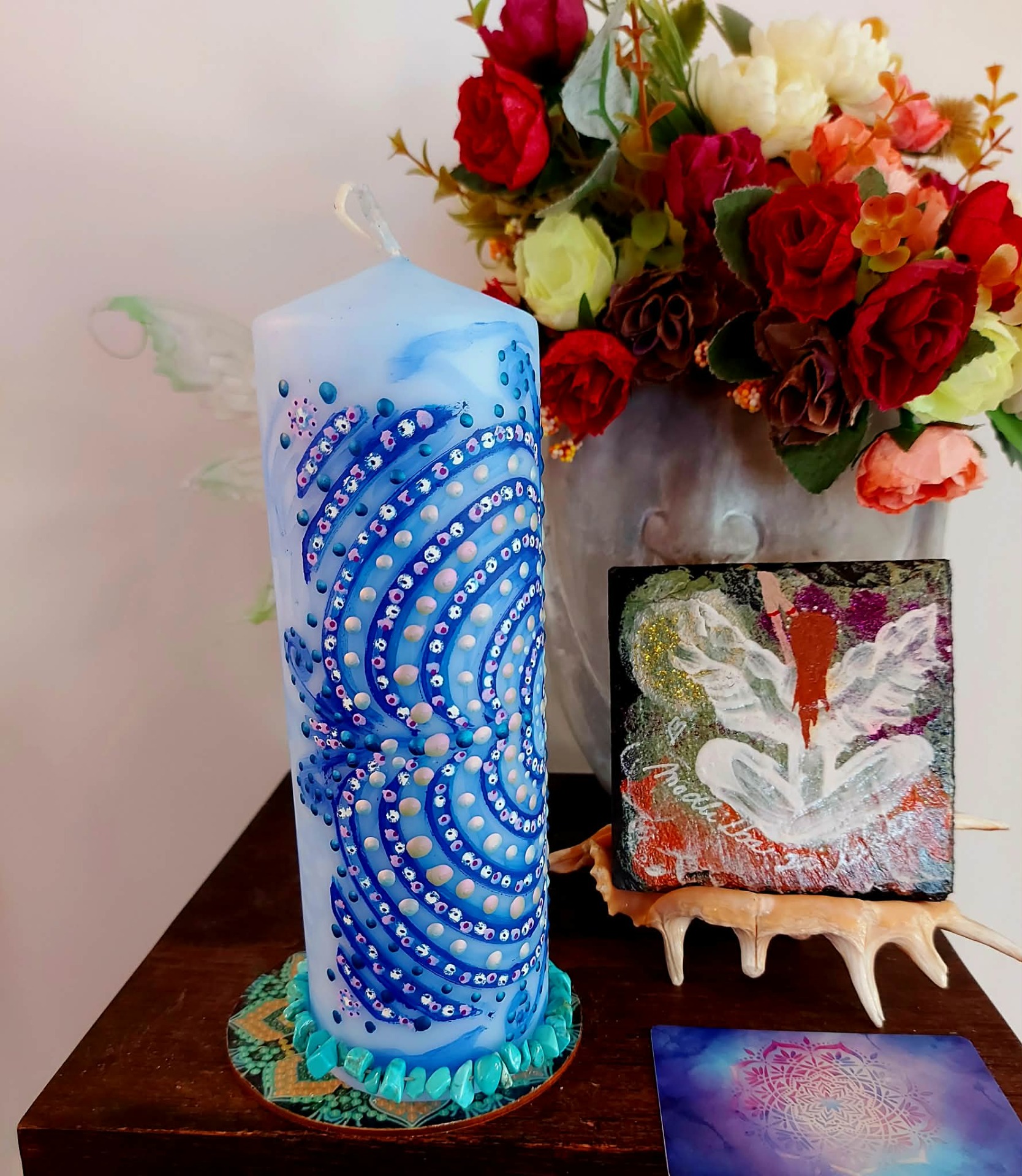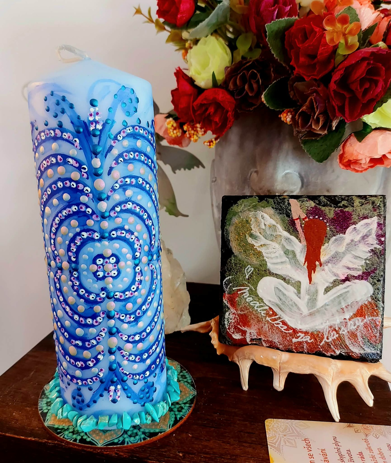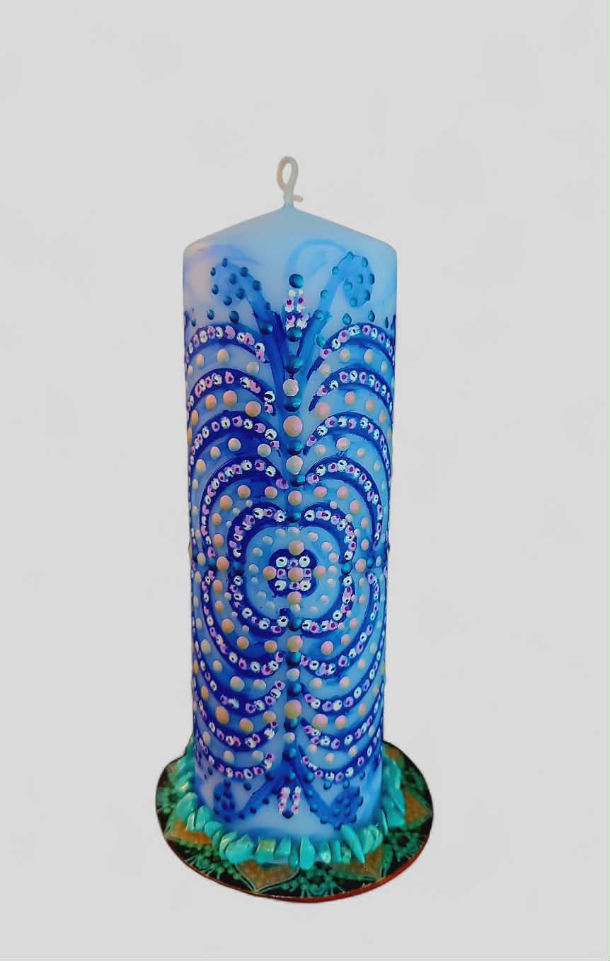 Tato svíčka určena pro ženy, které již vědí, co chtějí .Tato svíčka je rezonanční objekt, laděna na vnímavost, přítomnost a vědomý kontakt. Vznikla jako otevřené pole, které se propojuje s vědomím člověka, jenž s ní pracuje. Přirozeně se naladí na váš vnitřní prostor, otázku nebo pohyb, který ve vás právě zraje, funguje jako zrcadlo vědomí. Podporuje jasnost, autenticitu a vědomý kontakt se sebou. Mandala zde funguje jako struktura rezonance. Reaguje na pozornost, ticho a jemné vnitřní naladění. V každém setkání se otevírá jinak. Tato svíčka pracuje skrze souhru. Podporuje přirozené rozvinutí. Vytváří prostor, ve kterém se záměr může zrodit sám. Je vhodná pro chvíle, kdy vnímáš v sobě pohyb a proměnu, chceš dát svému záměru čas a prostor, ladíš manifestaci ze stavu bytí. V tichu si polož otázku: "Jaký stav chci dnes žít?" Odpověď se může objevit jako pocit, obraz nebo vnitřní klid. Stačí zůstat otevřená a vnímavá. Naladění na prostor a ticho. Zapal svíčku. Dovol světlu, aby se rozprostřelo kolem tebe. Vnímej dech takový, jaký právě je.Vnímej, v jakém vnitřním prostoru se právě nacházíš. Tělo se usazuje. Pozornost se zjemňuje. Jsi tady a teď. Prostor kolem tebe se otevírá. Prostor v tobě se pomocí dechu rozšiřuje. Myšlenky nechej plynout. Pocity nech být přítomné. Všechno má své místo. Parafín, 400 g, 20/6 cm, malba na svíčku akryl a tekuté perly , podložka břidlice , akryl.