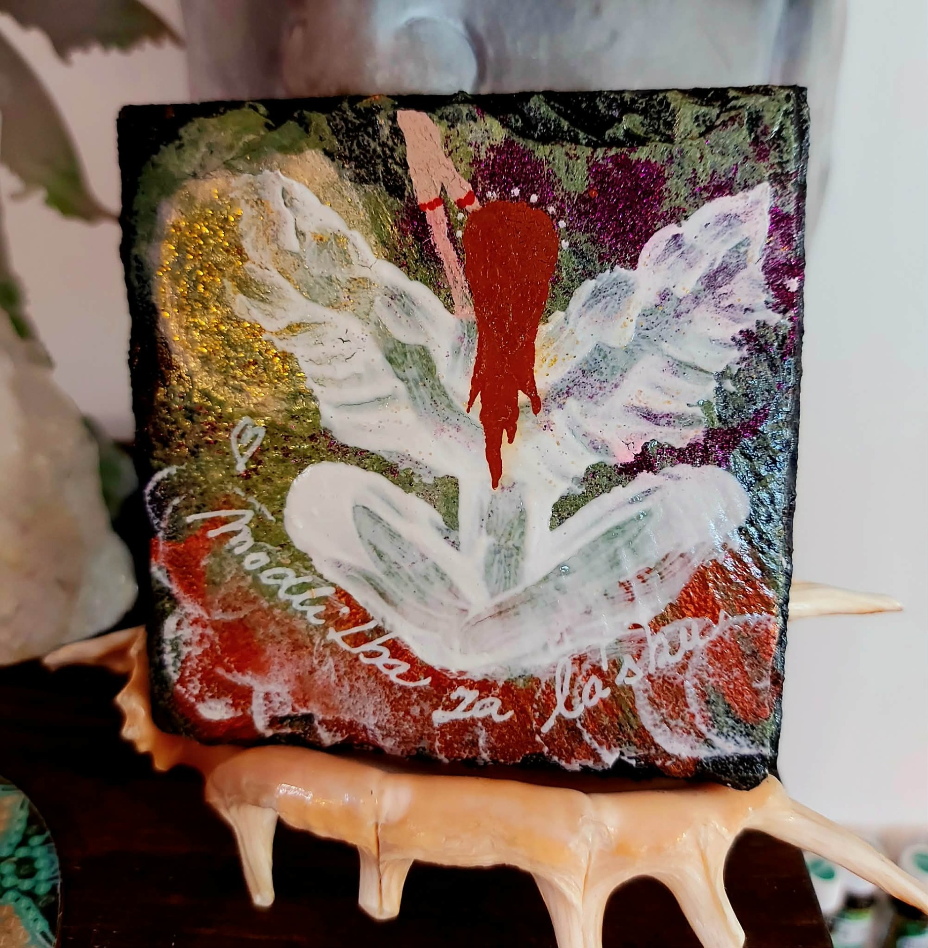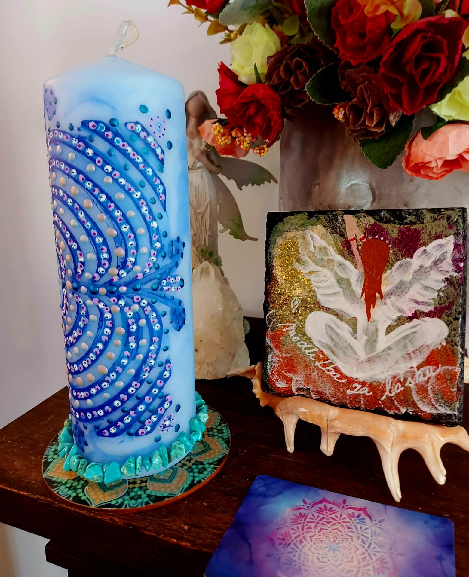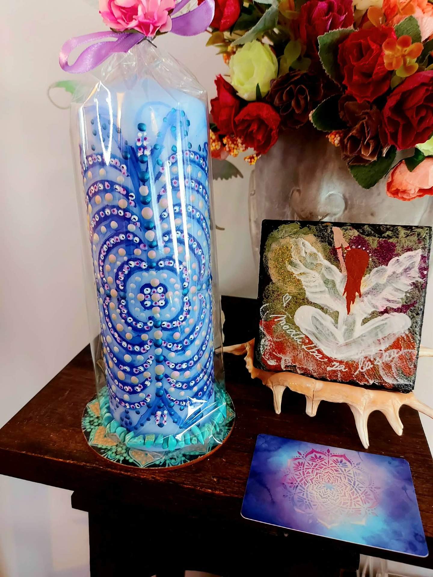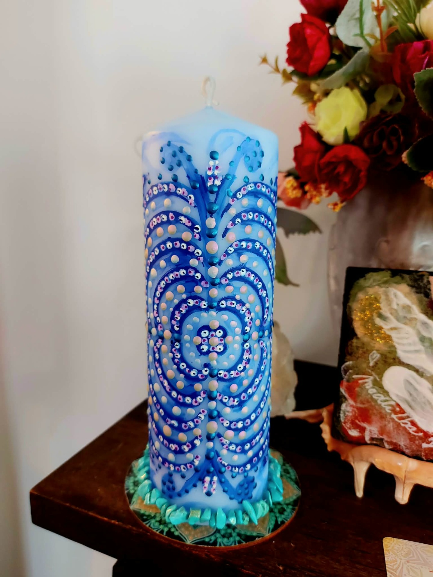 Tato svíčka určena pro ženy, které již vědí, co chtějí .Tato svíčka je rezonanční objekt, laděna na vnímavost, přítomnost a vědomý kontakt. Vznikla jako otevřené pole, které se propojuje s vědomím člověka, jenž s ní pracuje. Přirozeně se naladí na váš vnitřní prostor, otázku nebo pohyb, který ve vás právě zraje, funguje jako zrcadlo vědomí. Podporuje jasnost, autenticitu a vědomý kontakt se sebou. Mandala zde funguje jako struktura rezonance. Reaguje na pozornost, ticho a jemné vnitřní naladění. V každém setkání se otevírá jinak. Tato svíčka pracuje skrze souhru. Podporuje přirozené rozvinutí. Vytváří prostor, ve kterém se záměr může zrodit sám. Je vhodná pro chvíle, kdy vnímáš v sobě pohyb a proměnu, chceš dát svému záměru čas a prostor, ladíš manifestaci ze stavu bytí. V tichu si polož otázku: "Jaký stav chci dnes žít?" Odpověď se může objevit jako pocit, obraz nebo vnitřní klid. Stačí zůstat otevřená a vnímavá. Naladění na prostor a ticho. Zapal svíčku. Dovol světlu, aby se rozprostřelo kolem tebe. Vnímej dech takový, jaký právě je.Vnímej, v jakém vnitřním prostoru se právě nacházíš. Tělo se usazuje. Pozornost se zjemňuje. Jsi tady a teď. Prostor kolem tebe se otevírá. Prostor v tobě se pomocí dechu rozšiřuje. Myšlenky nechej plynout. Pocity nech být přítomné. Všechno má své místo. Parafín, 400 g, 20/6 cm, malba na svíčku akryl a tekuté perly , podložka břidlice , akryl.