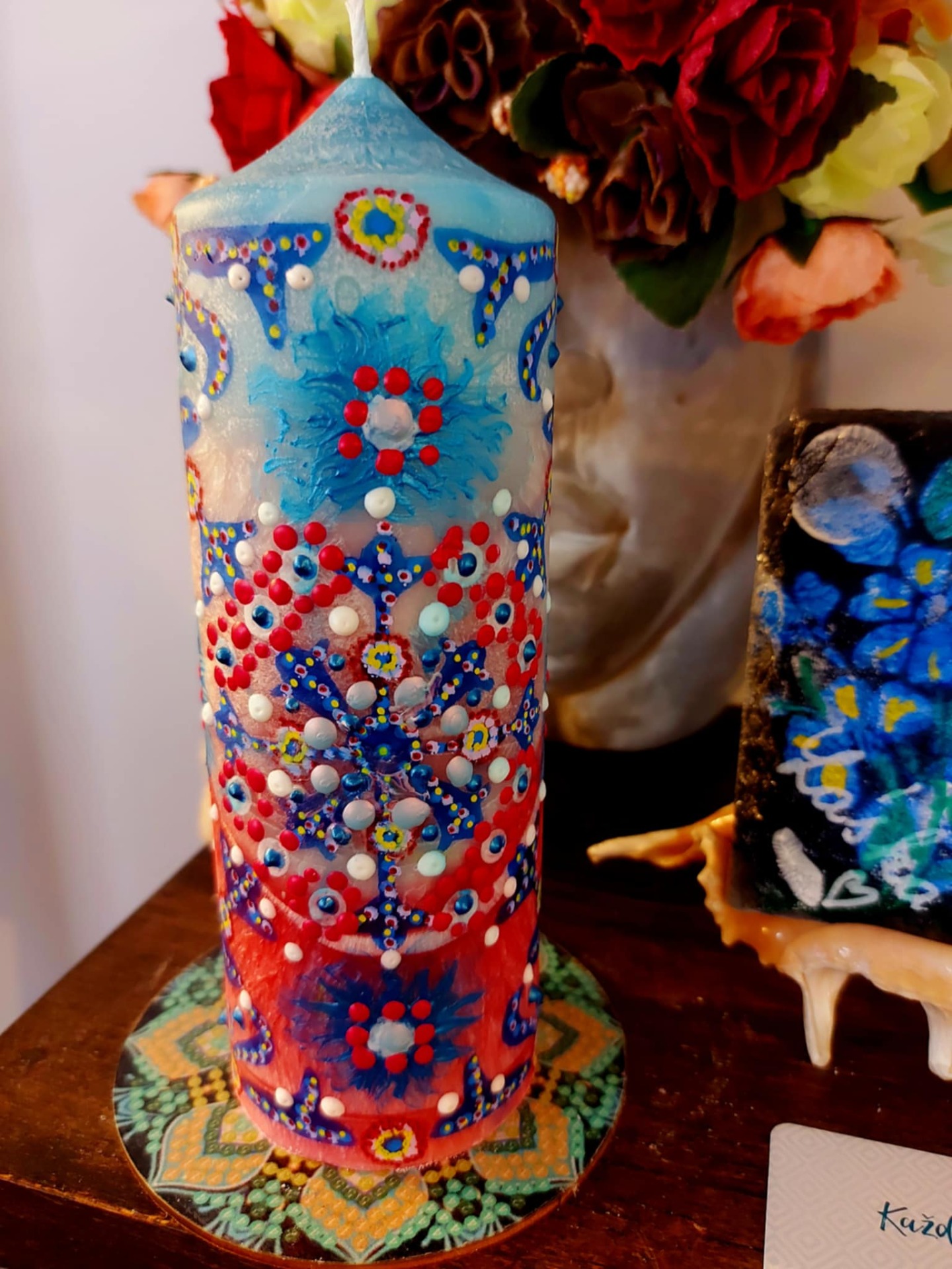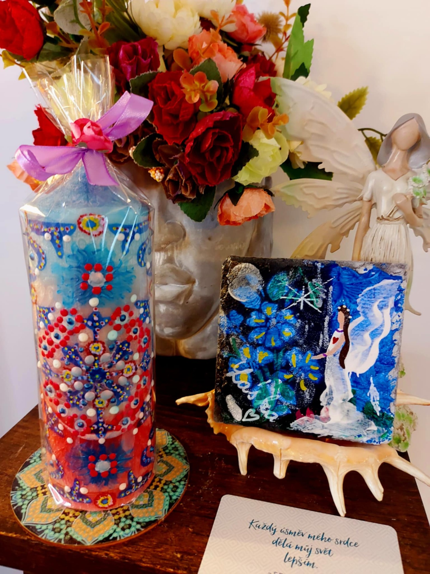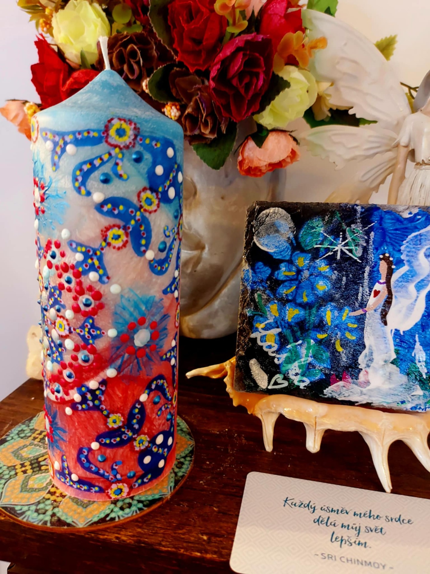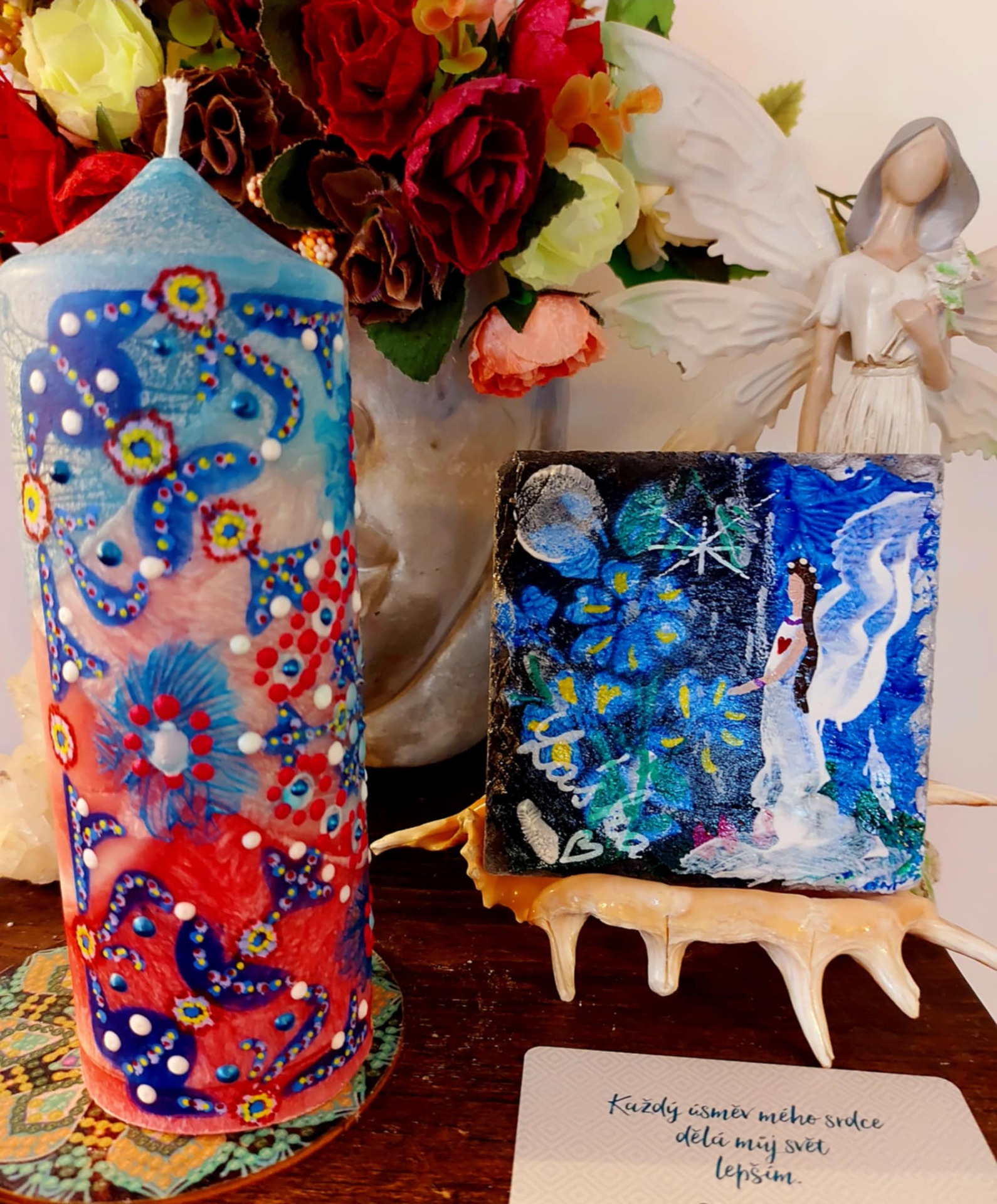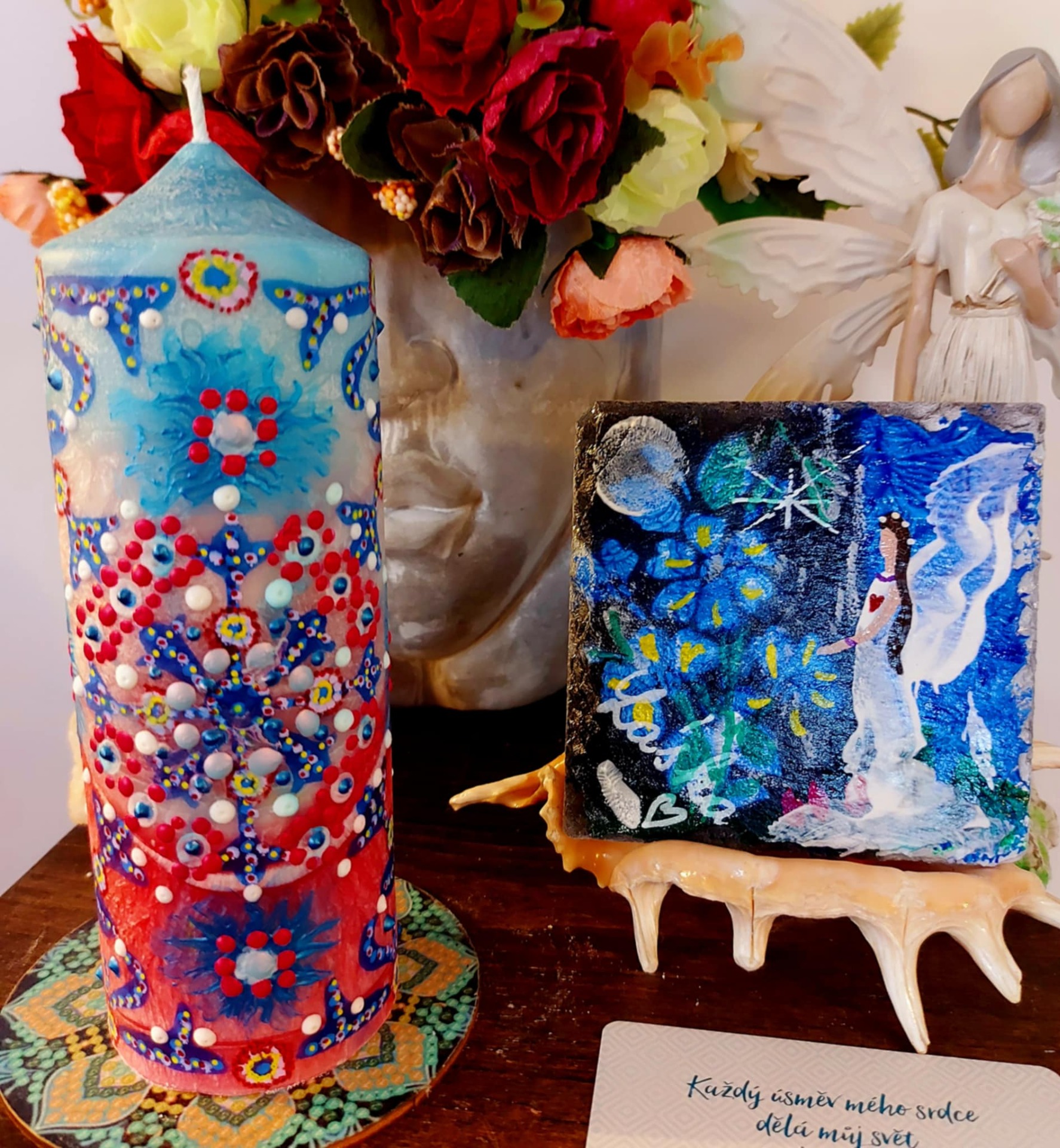 Krystal vložený do spodu svíčky projasňuje mysl, zvyšuje sebevědomí, přináší novou energií, zklidňuje. Podporuje trpělivost, moudrost a dokonalost. Pomáhá se sebezdokonalováním, samostatností, vytrvalostí. Zesiluje energii , uvolňuje ji a reguluje, aby bylo dosaženo harmonie. Palmový krystalický vosk 380g, 16/6 cm, vonná esence Divoké květy. Bachova esence - 4,6, 14.. Podložka břidlice, akryl, malba na svíčku akryl a tekuté perly. Minerál křišťál ze spodu svíčky.