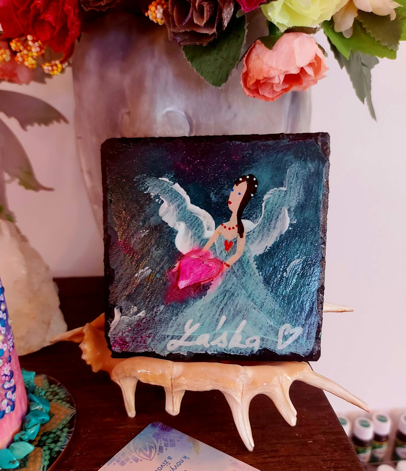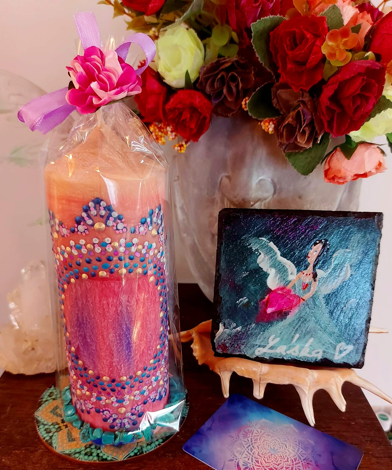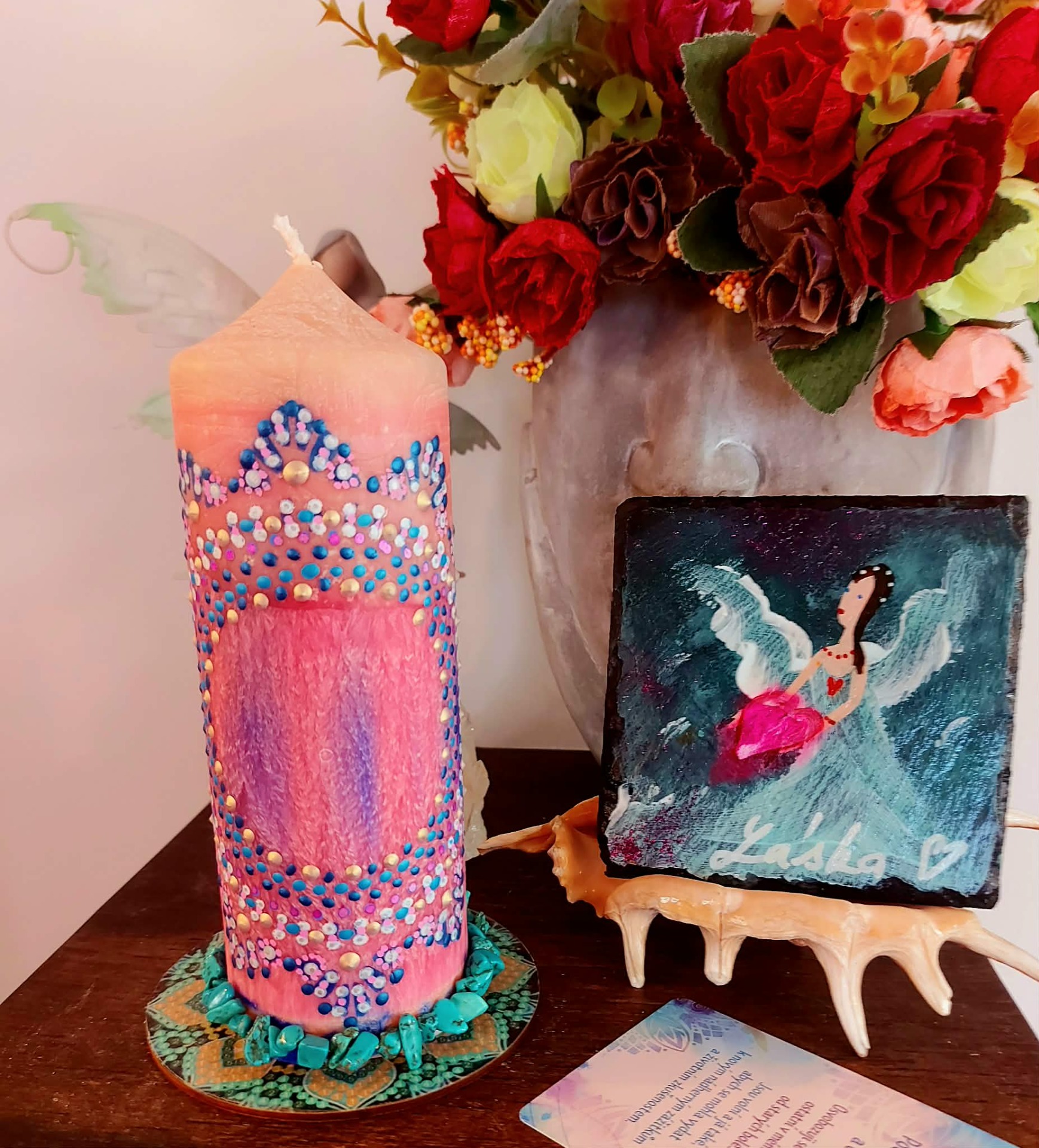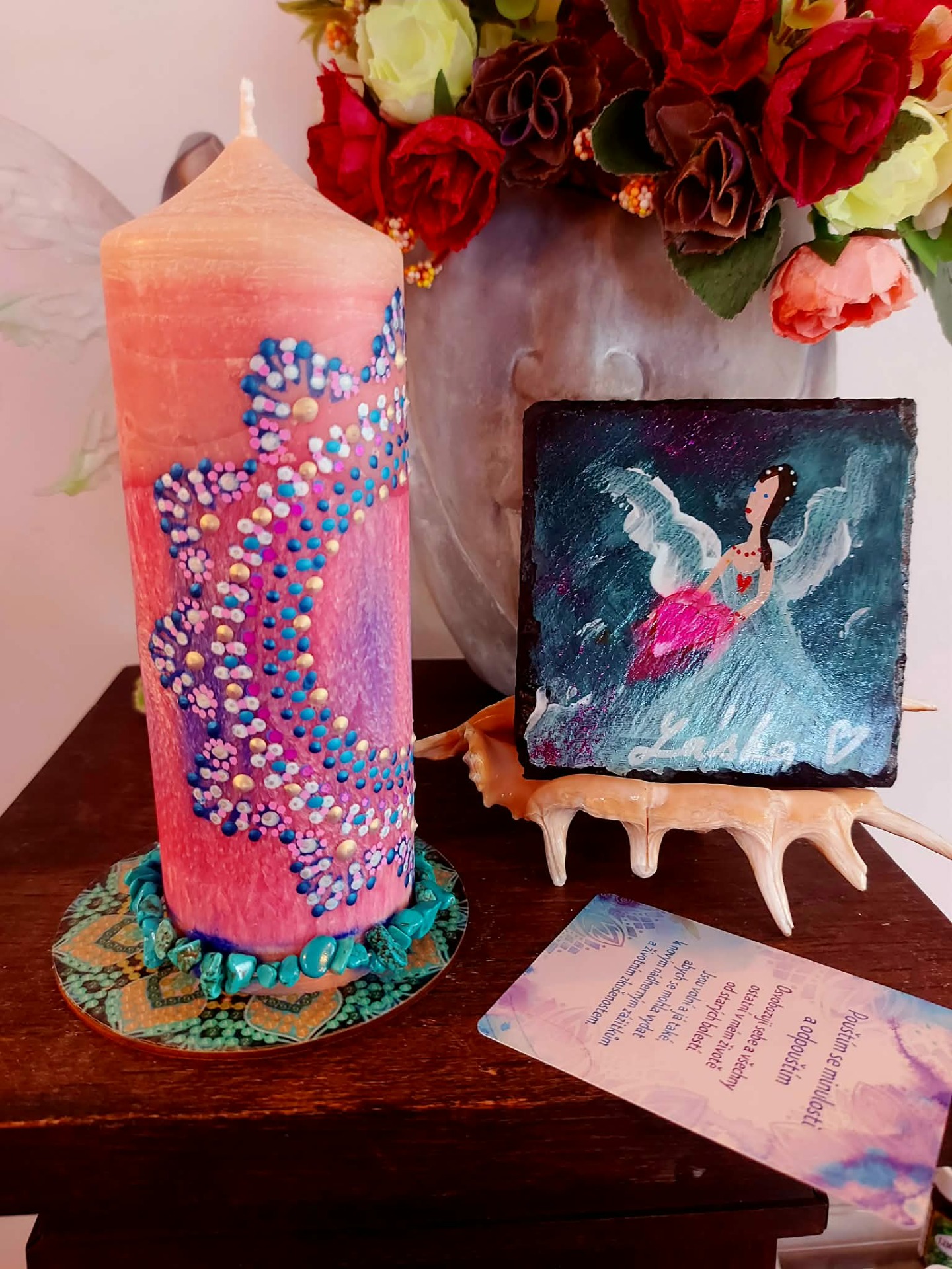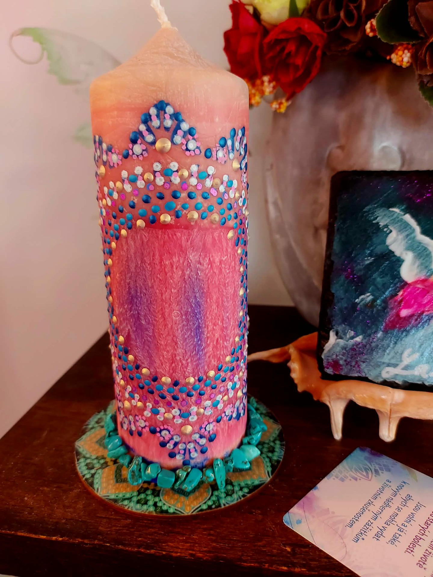 Minerál vložený do spodu svíčky projasňuje mysl, zvyšuje sebevědomí, přináší novou energií, zklidňuje. Podporuje trpělivost, moudrost a dokonalost. Pomáhá se sebezdokonalováním, samostatností, vytrvalostí. Zesiluje energii svíčky, Uvolňuje ji a reguluje, aby bylo dosaženo harmonie Palmový krystalický vosk 370 g, 16/6 cm, malba na svíčku akryl a tekuté perly.. Podložka břidlice a akryl, Minerál ve svíčce,, esence divokých květů, Bachovy esence. Náramek posvátného záměru doporučuji nosit po celou dobu procesu.