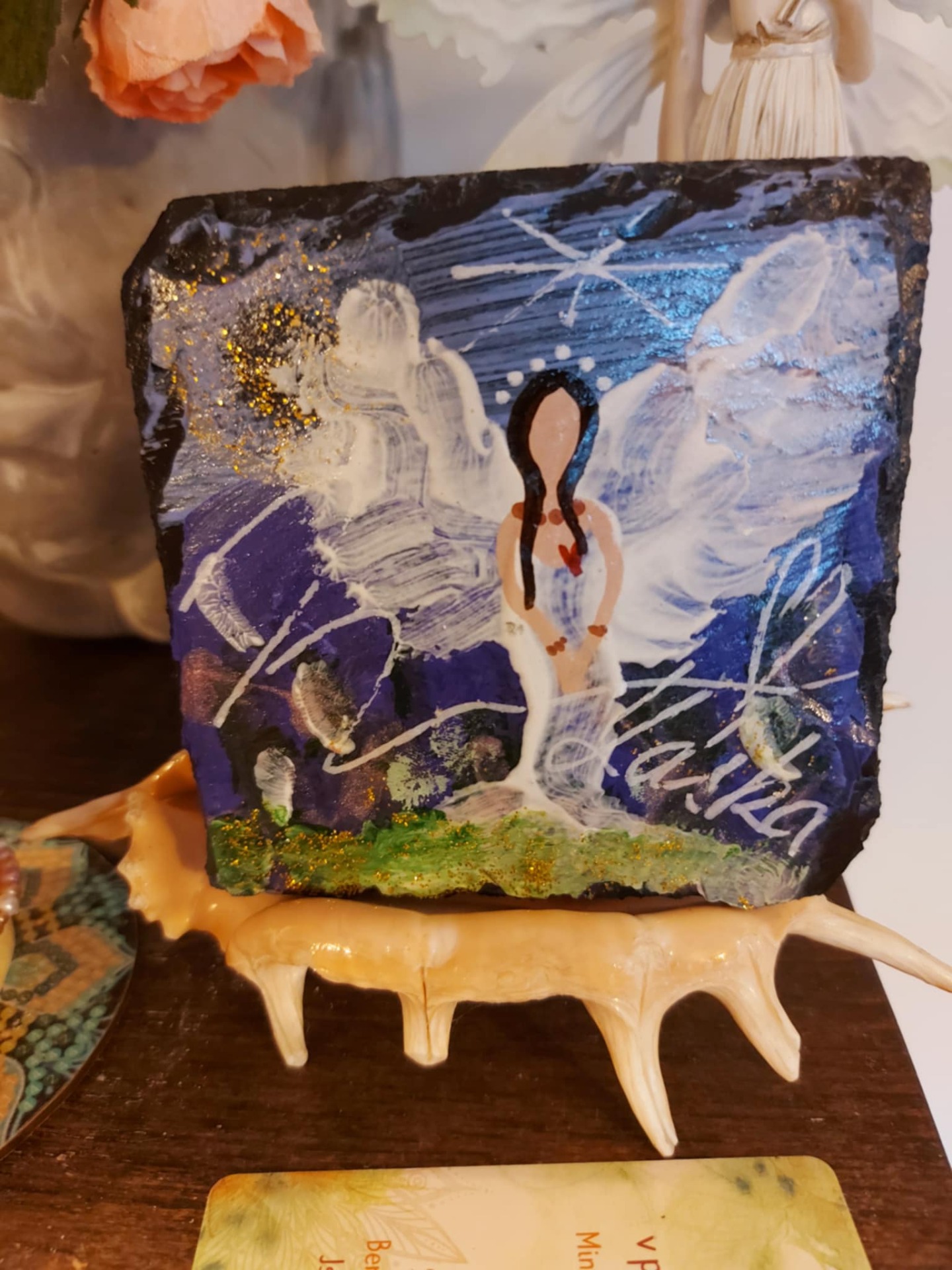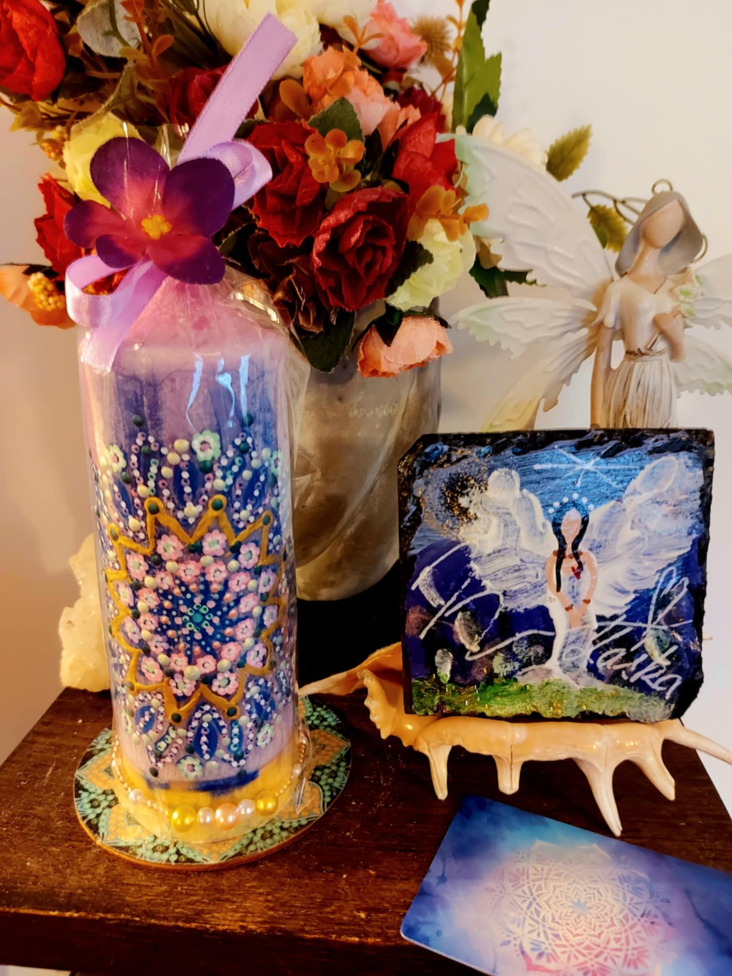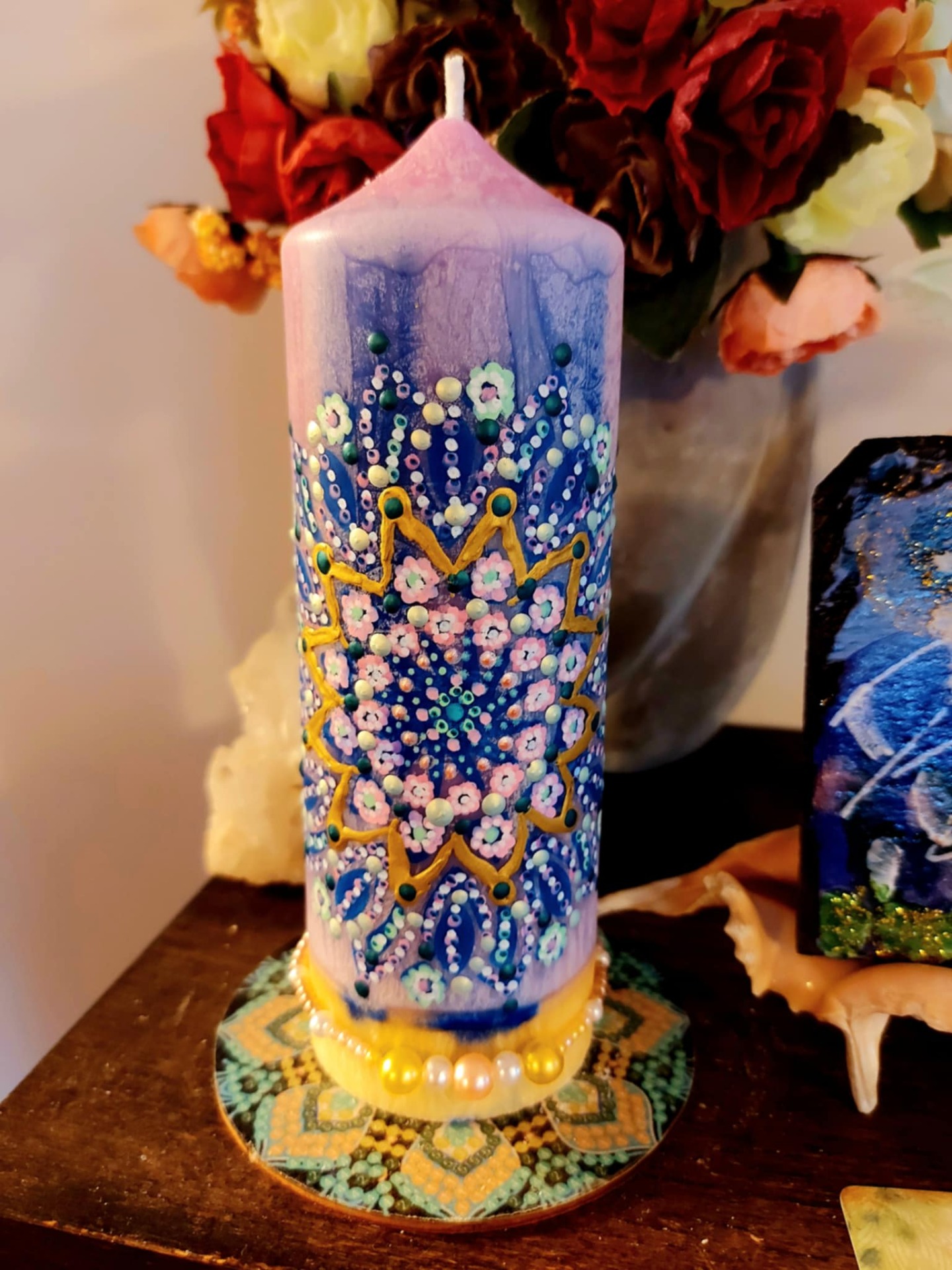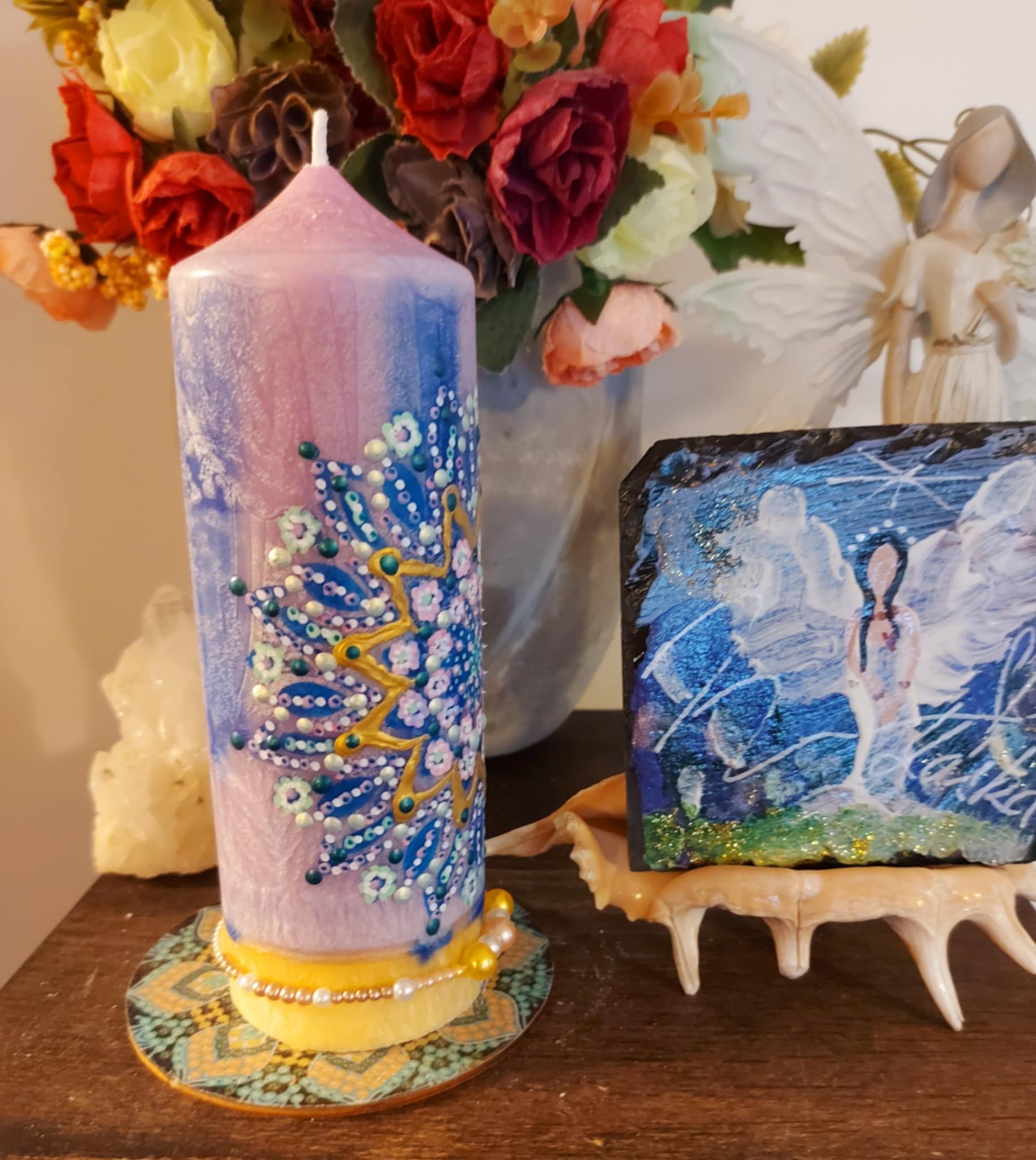 Palmový krystalický vosk 370g, 16/6 cm. podložka břidlice a akryl, malba na svíčku akryl a tekuté perly, krystal ve spodu svíčky, esence Divoké květy, Bachova esence.