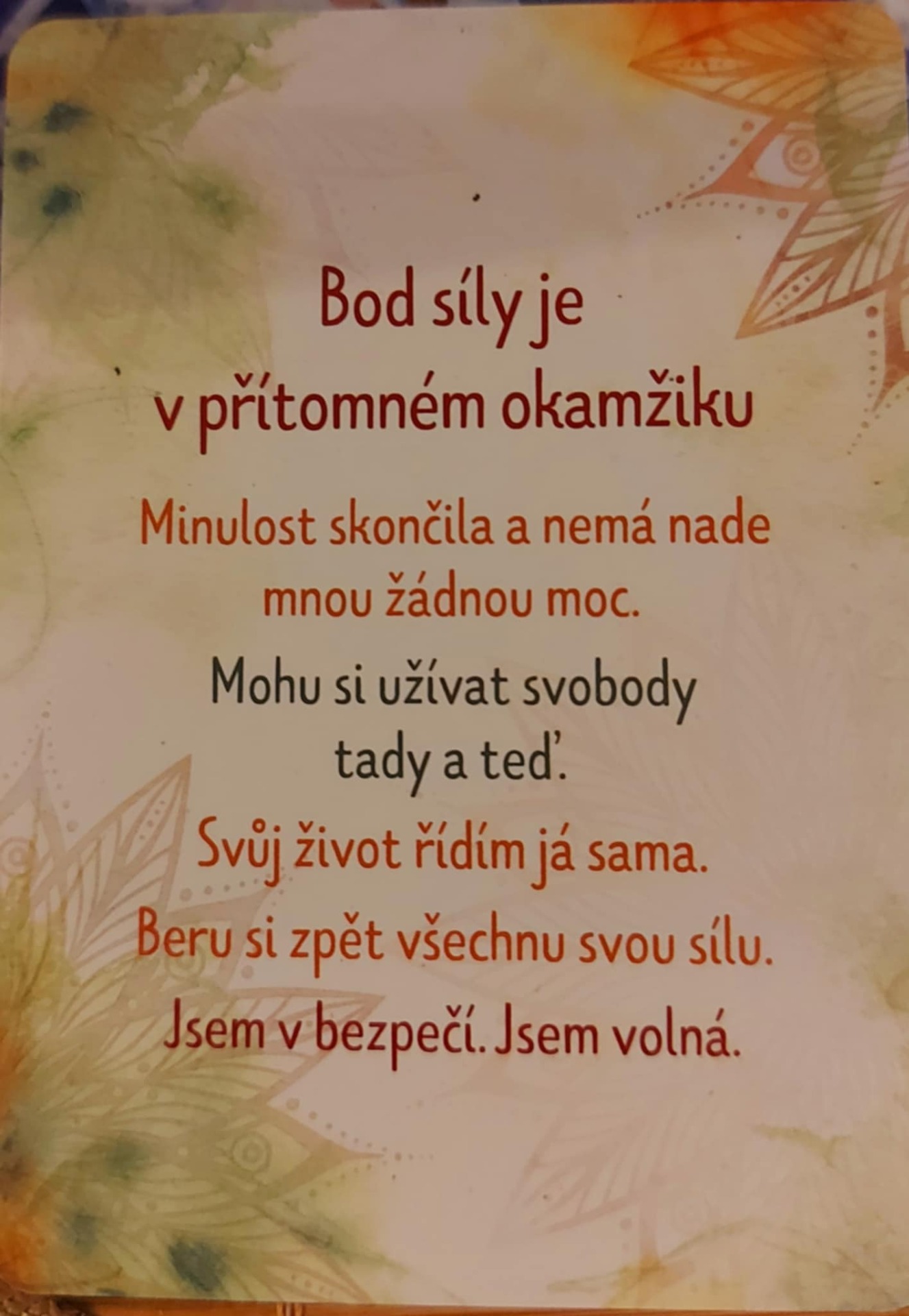 Přijímám sílu Božského léčení a dovoluji si , aby mi pomáhala nezměrnou silou uzdravit blokády, obavy, zdravotní potíže, které momentálně prožívám. Jsem veliký otevřený prostor uzdravení. Vítám ve svém životě zdraví a všeobjímající lásku …. Děkuji