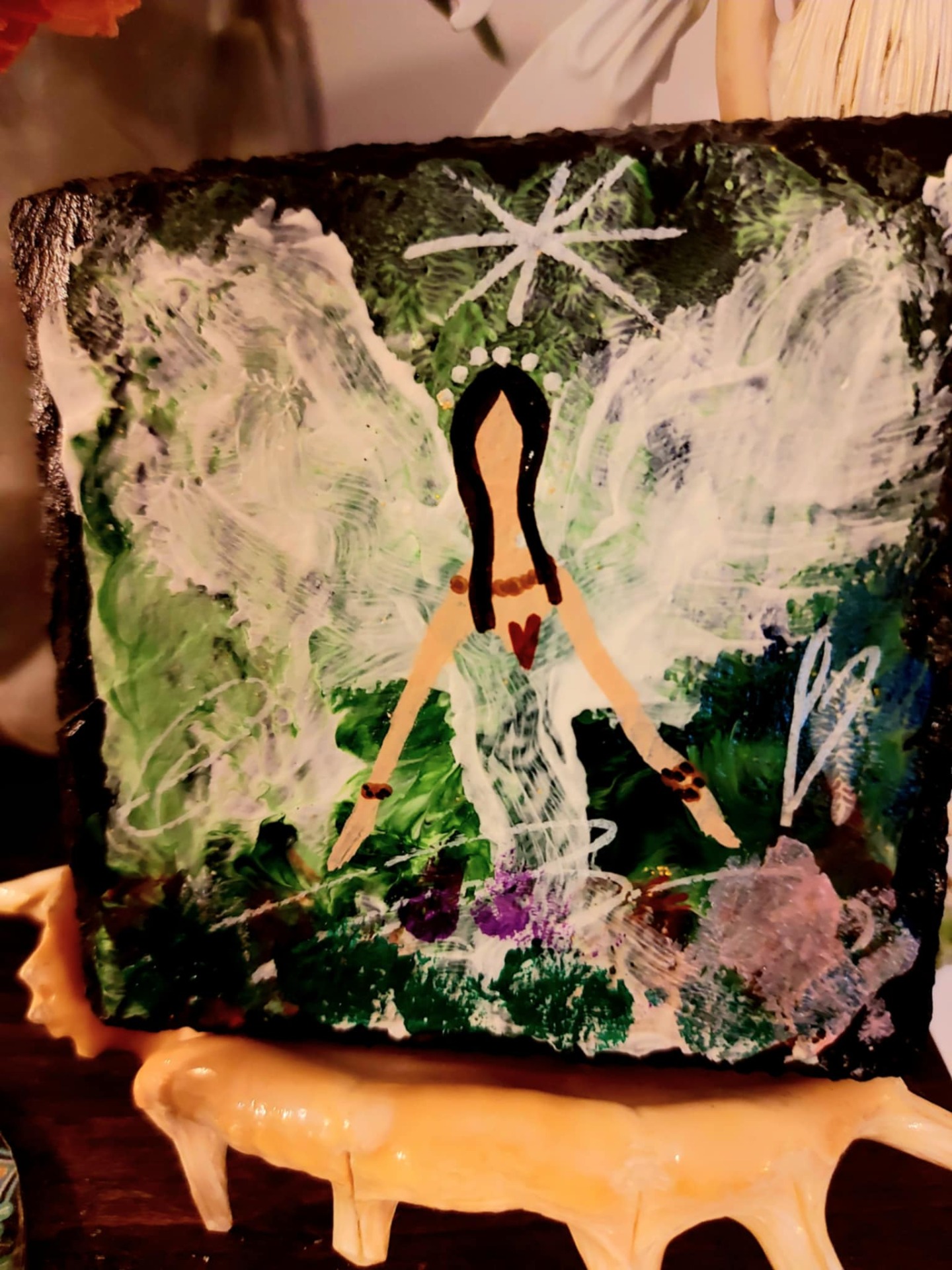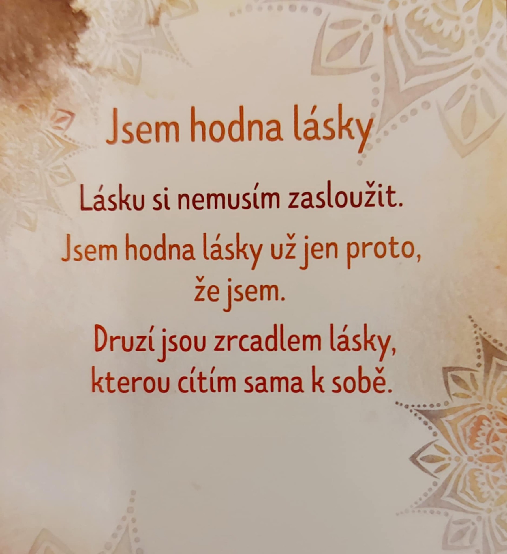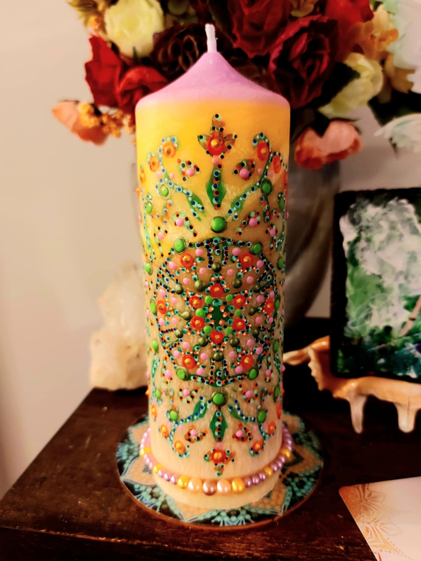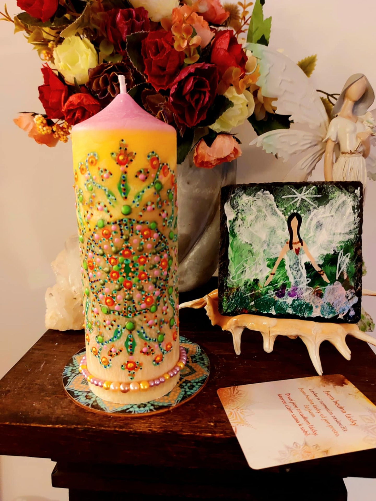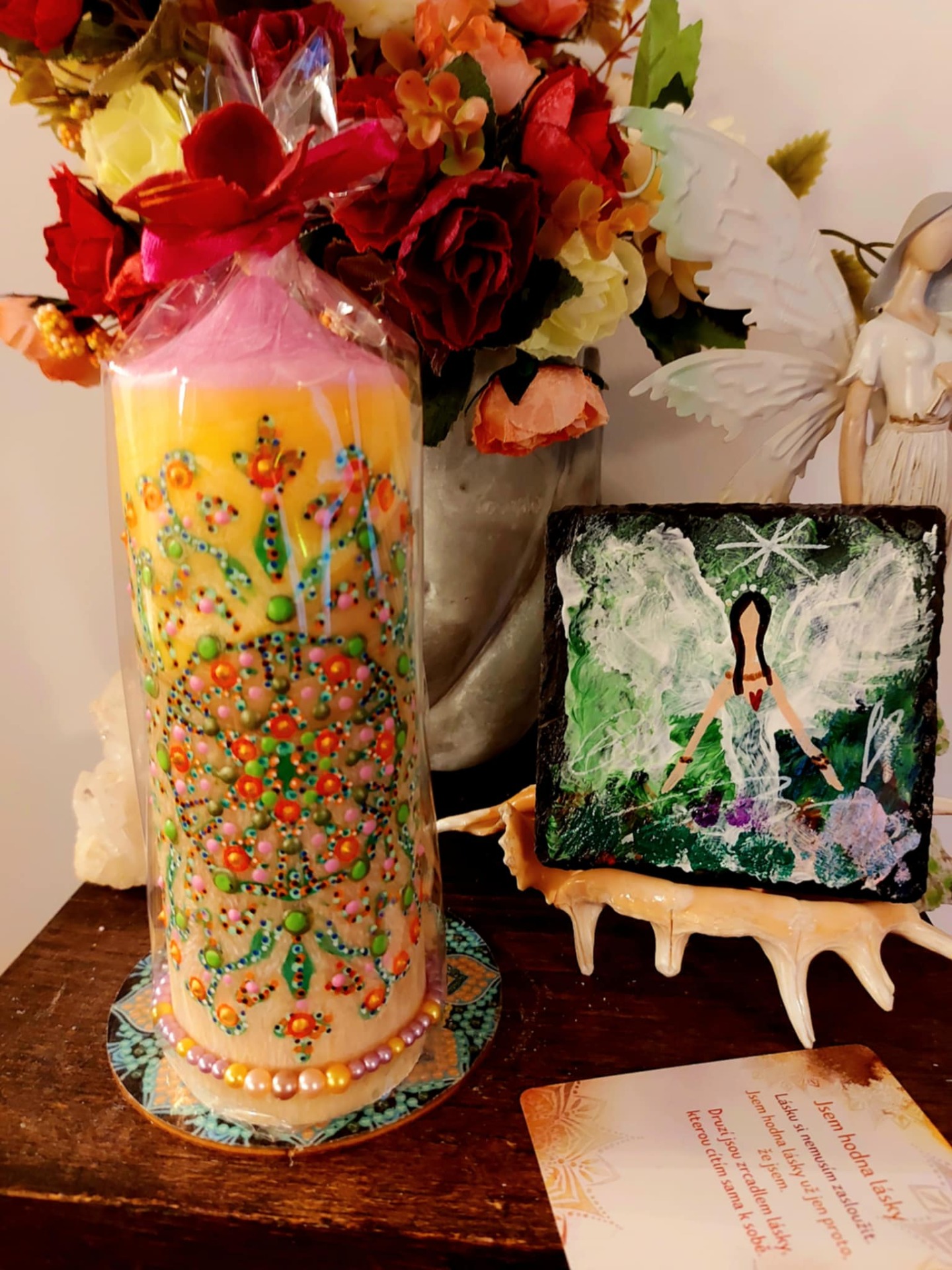 Harmonie, laskavý vnitřní soucit vnitřní síla , sebevědomí změny.Božské vibrace tě objímají a rozpouští se do esencí, které harmonizují tvé veškeré BYTÍ k přilákání pozitivní uzdravující energii LÁSKY. Ve tvé moci je rozhodnout cítit se pod ochranou. Schopnost pohlédnout do svého nitra a odhalit tak vlastní překážky. Energie dvou základních principů vzájemně se doplňujících, kdy jeden bez druhého nemůže existovat, jeden se rodí z druhého, vytvářejí jednotu, která tvoří vše v celém Vesmíru, tedy i Tvé ABSOLUTNÍ ŠTĚSTÍ. Afirmace : Jsem v čistých vibracích lásky. Láska se stává mou součástí. V tichu objevuji svůj vnější i vnitřní svět, pracuji láskyplně se soucitem na sobě, poznávám všechny pocity nebezpečí a zranitelnosti a ty se uzdravují. Na jejich místo přichází poznání, že jsem v bezpečí, pod ochranou. Jsem v bezpečí a jsem bez obav. Jsem vždy pod ochranou. Vždy a každým svým krokem se vzdaluji své minulosti, existuje pro mě pouhé NYNÍ. Mám pouze svou nevinnost a důvěřivost v Universum. Jsem v naprosté harmonii se vším co mne obklopuje. Můj život je obrovským skokem do neznáma v každém okamžiku mého, již celistvého bytí. Bachovy esence Wild Rose (Planá růže) – obnovuje zájem o život, vrací smysl a chuť být přítomná. Honeysuckle (Zimolez) – pomáhá pustit minulost, která brání lásce žít tady a teď. Walnut (Vlašský ořech) – podpora v přechodech, změnách a v krocích za tím, co miluješ. Holly (Cesmína) – čistá láska bez podmínek, léčí srdce od bolesti a strachu. Tento koktejl je mostem mezi srdcem a smyslem. Je laskavou připomínkou, že smysl roste vždy tam, kde jsme ochotni milovat a být milováni. Řízená meditace: "Plamen ve středu srdce"Najdi si tiché místo. Svíčka hoří. Napij se vody. Buď v těle. A dýchej… Zavři oči a představ si, že ve tvém srdci doutná jemný plamínek. Malý, tichý, ale jistý. Je to oheň, který tvoří. Nadechni se do hrudníku – jemně, bez námahy. S každým nádechem plamen sílí. S každým výdechem tiše šeptá:"Láska je tvůj smysl. Láska je tvůj hlas. Láska je tvůj dech."Polož si ruku na srdce – možná ucítíš teplo, možná jemný tlak. Jen buď. Nech se obejmout tím světlem. Nech tě prostoupit. A když budeš připravená, polož si otázku: "Kde dnes mohu přinést lásku?"Bez tlaku. Bez očekávání. Nech, ať odpověď přijde sama – třeba i jako pocit. Zakonči tichým poděkováním. Minerál vložený do spodu svíčky projasňuje mysl, zvyšuje sebevědomí, přináší novou energií, zklidňuje. Podporuje trpělivost, moudrost a dokonalost. Pomáhá se sebezdokonalováním, samostatností, vytrvalostí. Zesiluje energii svíčky, Uvolňuje ji a reguluje, aby bylo dosaženo harmonie Palmový krystalický vosk 370 g, 16/6 cm, malba na svíčku akryl a tekuté perly. Podložka břidlice a akryl, Minerál ve svíčce,, esence divokých květů, Bachovy esence. Náramek posvátného záměru, pokud je součástí, doporučuji nosit po celou dobu procesu